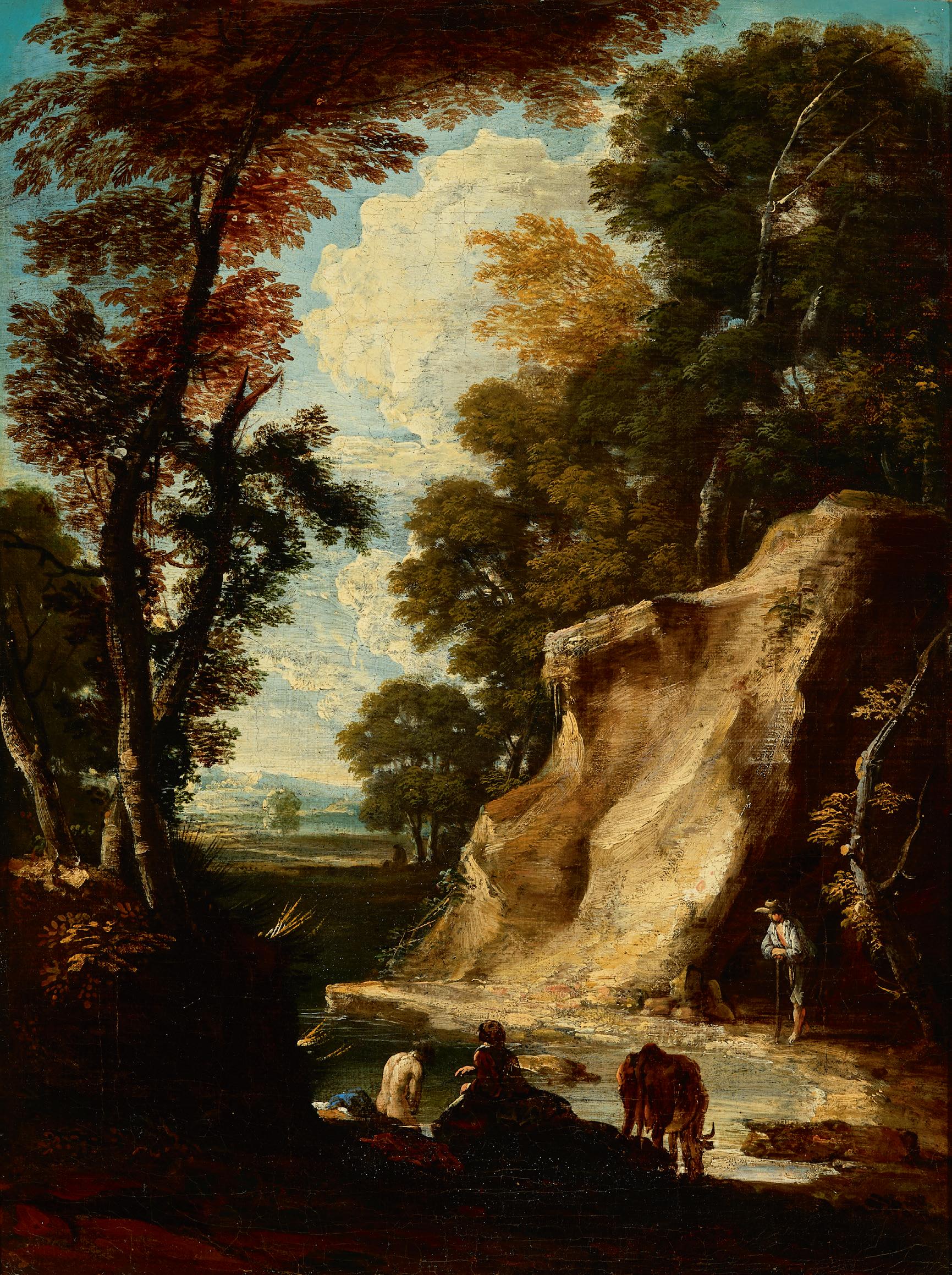 11 ATTRIBUÉ À CORNELIS HUYSMANS ANVERS 1648 1727, MALINES Paysage animé Huile sur toile 41 x 31,5 cm Bath and peasants’ stop Oil on canvas 16 1/8 x 12 3/8 in. 3 000 - 4 000 € 16