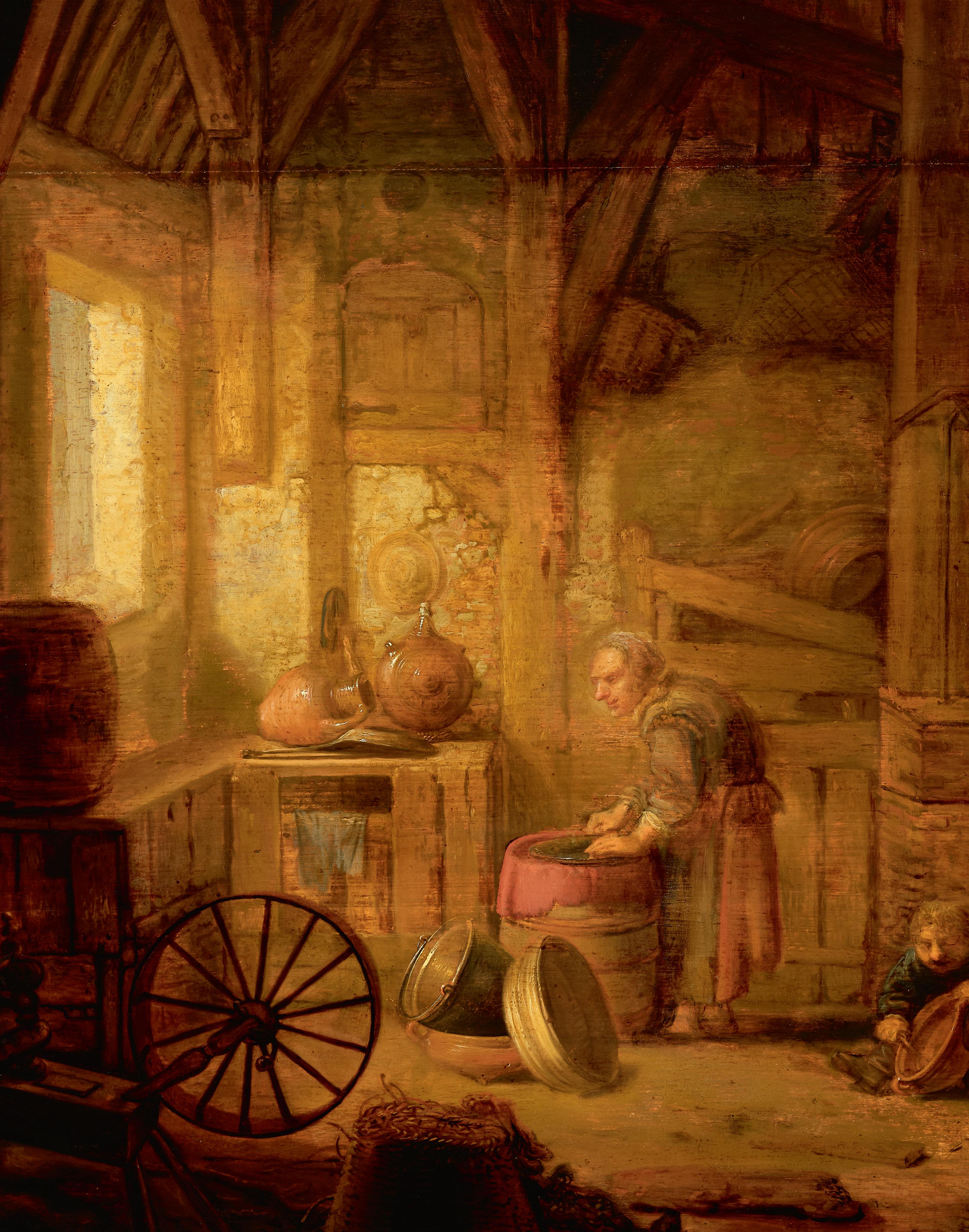 S’agissant de notre tableau, la lumière pénétrant par une fenêtre étroite et n’éclairant que partiellement l’espace, rappelle les premières œuvres de l’école de Rembrandt. Par ailleurs, la représentation de l’intérieur d’une grange dans laquelle des paysans vaquent à leurs occupations quotidiennes témoigne de l’intérêt de Verelst pour les scènes rustiques.