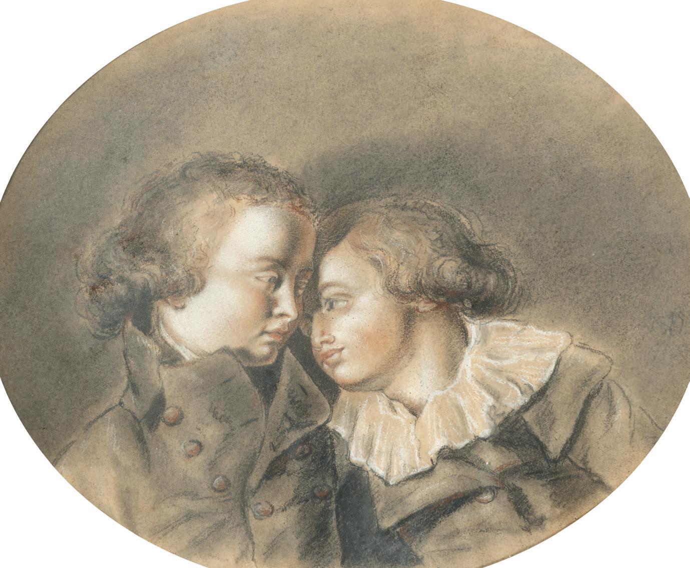 Two Brothers Black and red chalk, grey wash with white highlights, an oval 8 1/8 x 6 11/16 in.