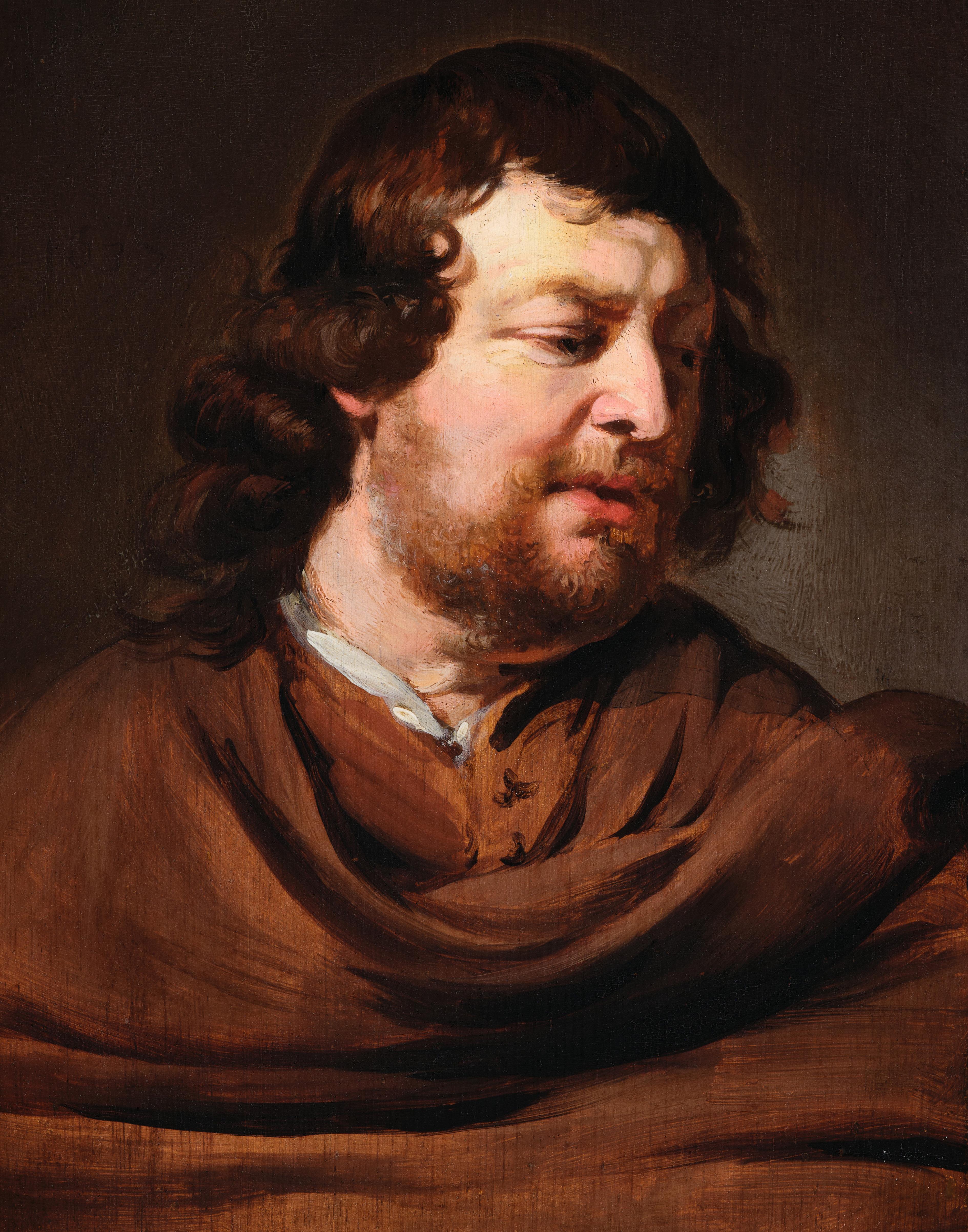 apparaît, vêtu d’une chemise blanche et d’un gilet que recouvre un épais manteau. Des camaïeux de bruns émergent les chairs lumineuses, donnant un véritable éclat au visage partagé entre lumière et obscurité due à la position de trois-quarts. Cette posture de la tête, légèrement inclinée vers le sol, dynamise la figure et confère du mouvement, de la profondeur à l’ensemble dans un espace pourtant restreint. Le pinceau joue lui aussi de l’intensité de la touche, créant d’une même teinte, des textures aussi diverses que celles des tissus, des chairs, de la chevelure ou de la barbe.