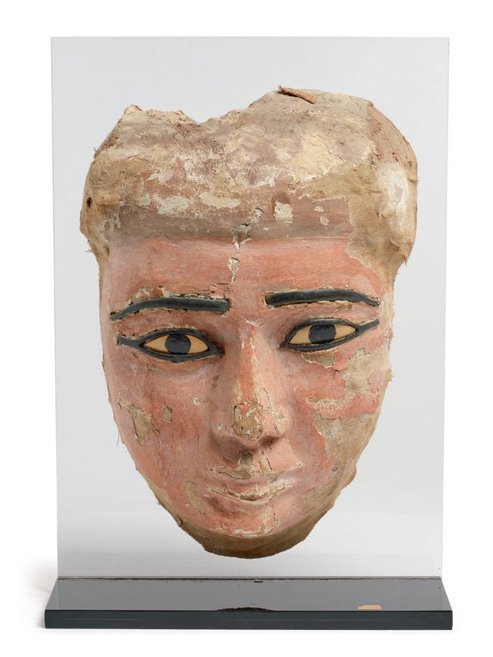 en bois sculpté et polychromé en cartonnage de bandelettes stuquées d’un visage coiffé, les yeux et les sourcils inscrustés de résine type coaltar noire et coquille d’œuf d’autruche pour le blanc des yeux. Égypte antique, Basse époque, XXVI e dynastie (664 à 525 avant. J.-C.).