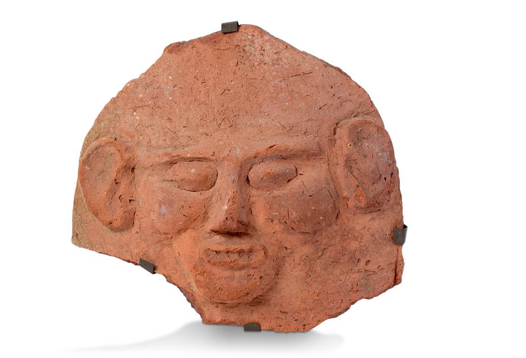 - Une tête d’homme chauve, élément de figurine. Faïence siliceuse à glaçure turquoise.