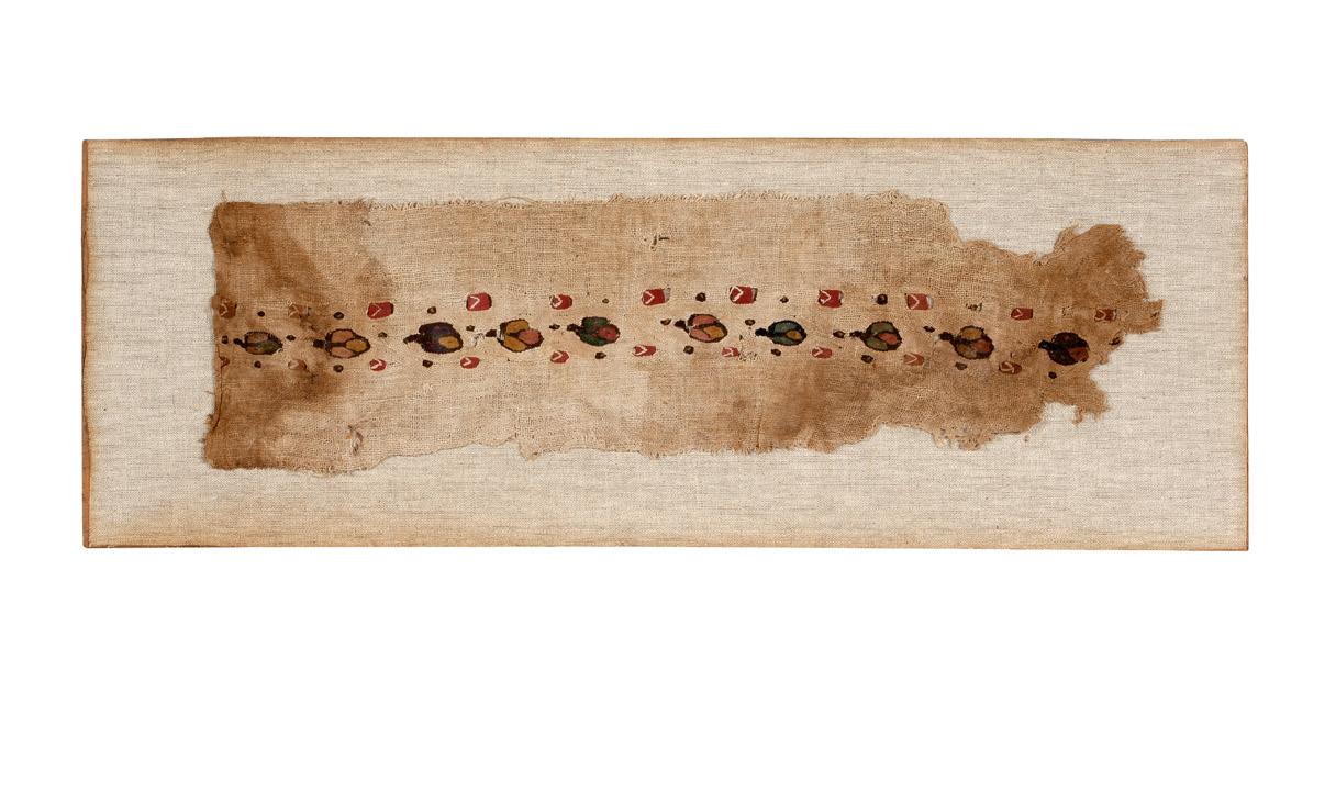 de cuve de sarcophage en bois de cèdre stuqué et entoilé peint d’un portrait féminin coiffé du némès et large collier ousekh pectoral sur le haut du corps. Yeux de terre blanche, sourcils et contours des yeux en alliage cuivreux.