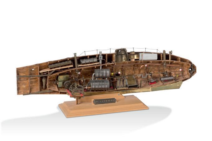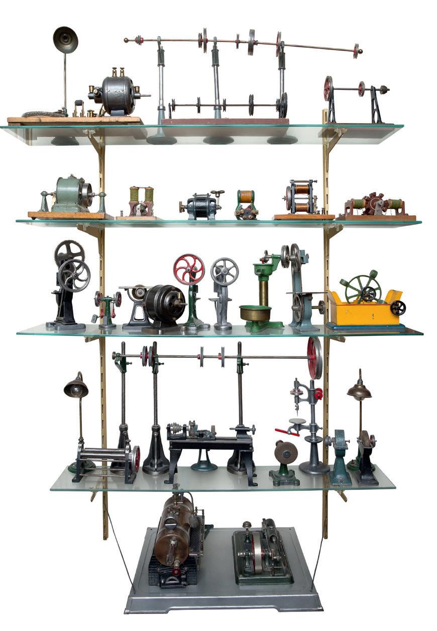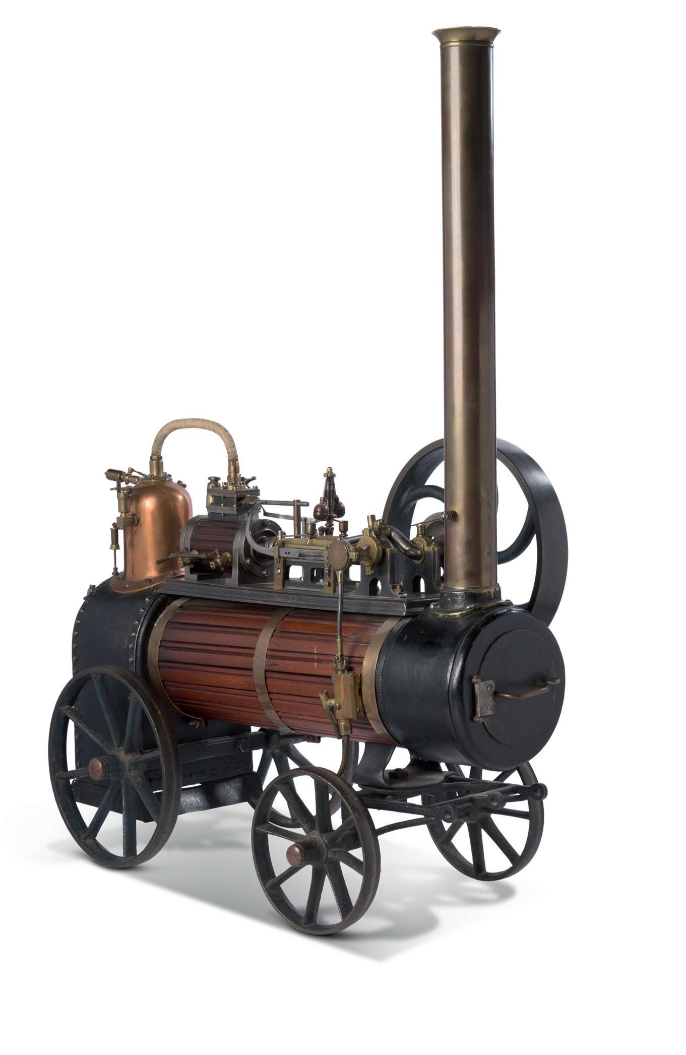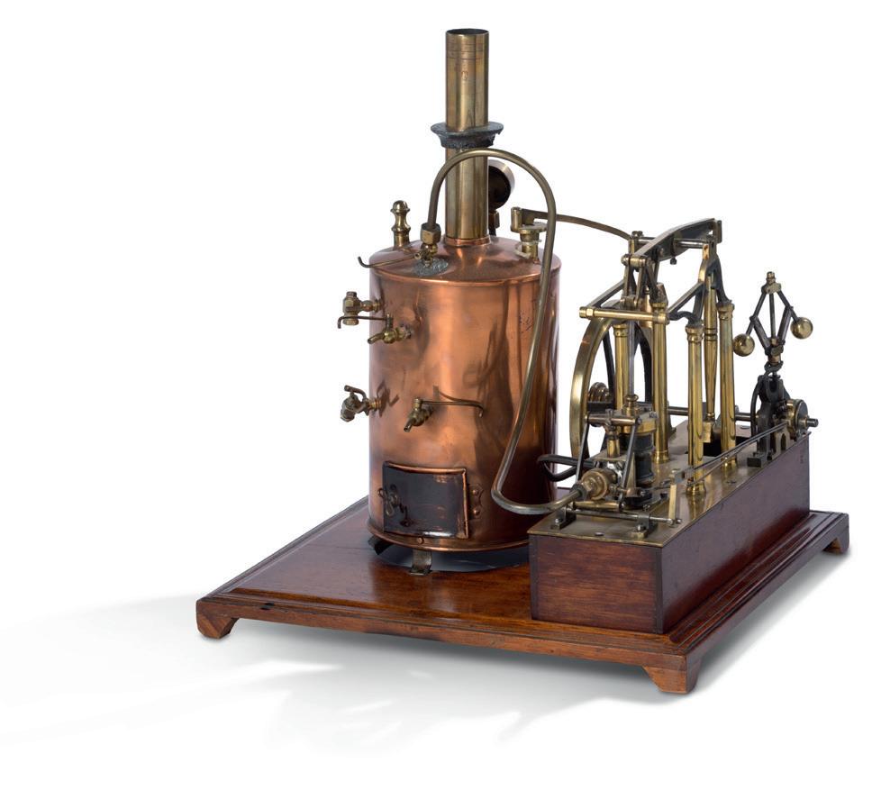 Réunion de deux modèles réduits de moteurs pour machine à vapeur, l’un dans une boîte vitrée en bois avec inscription « A. Thomas 1894 », l’autre portant une plaque « Stuart ».