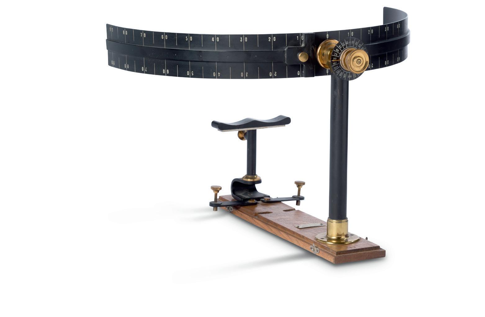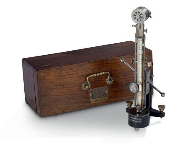 Ébullioscope de haute précision, système A. Contassot, type 1914, permettant le dosage de la richesse alcoolique des vins et autres liquides alcooliques. Laiton, cuivre et verre. Dans sa boîte en bois estampillée avec éprouvettes et notice.