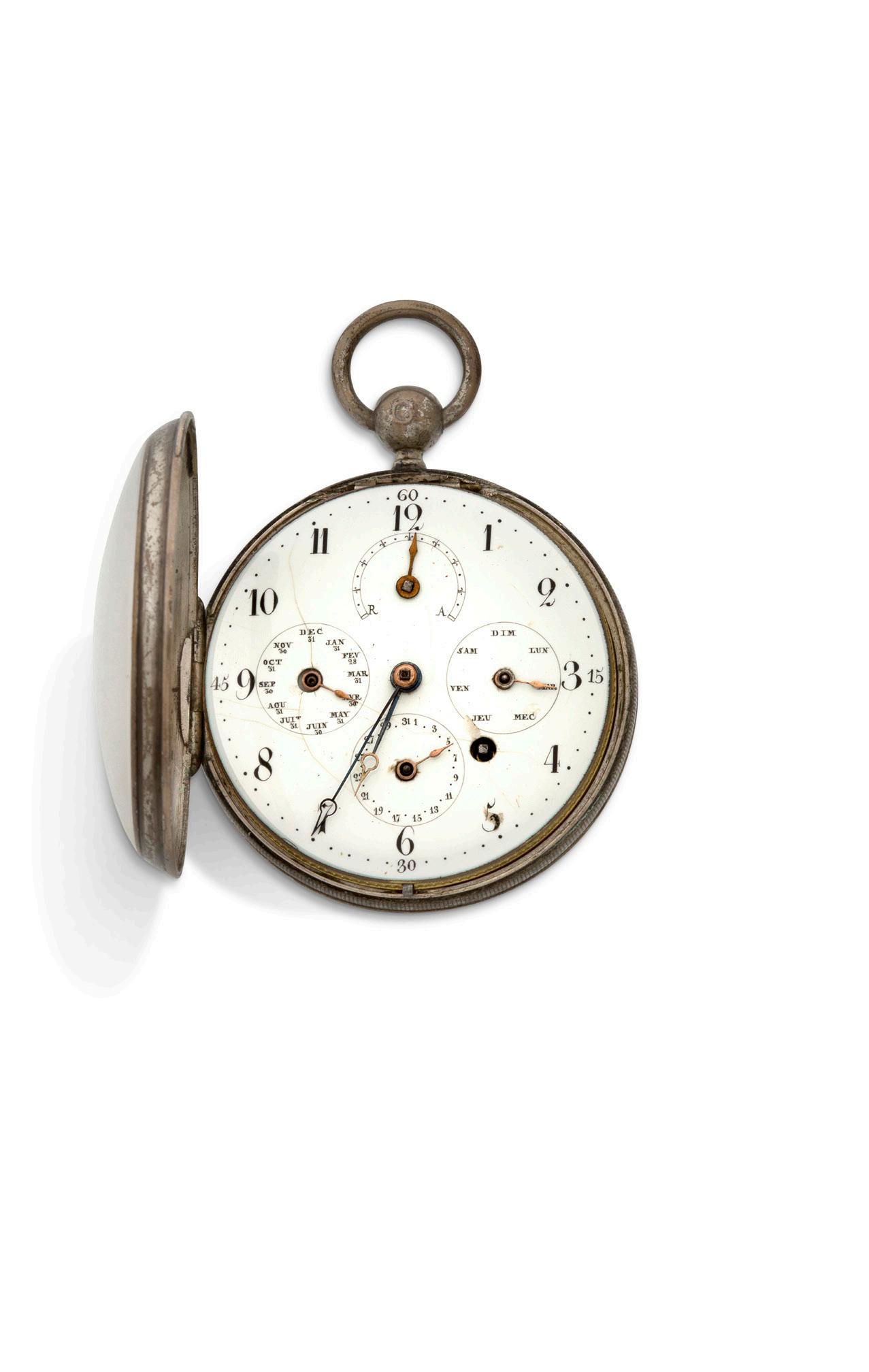 Le cadran principal avec indication en chiffres ro mains, précisant les quarts et minutes en chiffres arabes, l’indication du mois et du quantième de la date, une ouverture pour les phases de la lune, le centre décoré de motifs géométriques avec une seule aiguille.