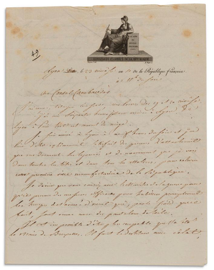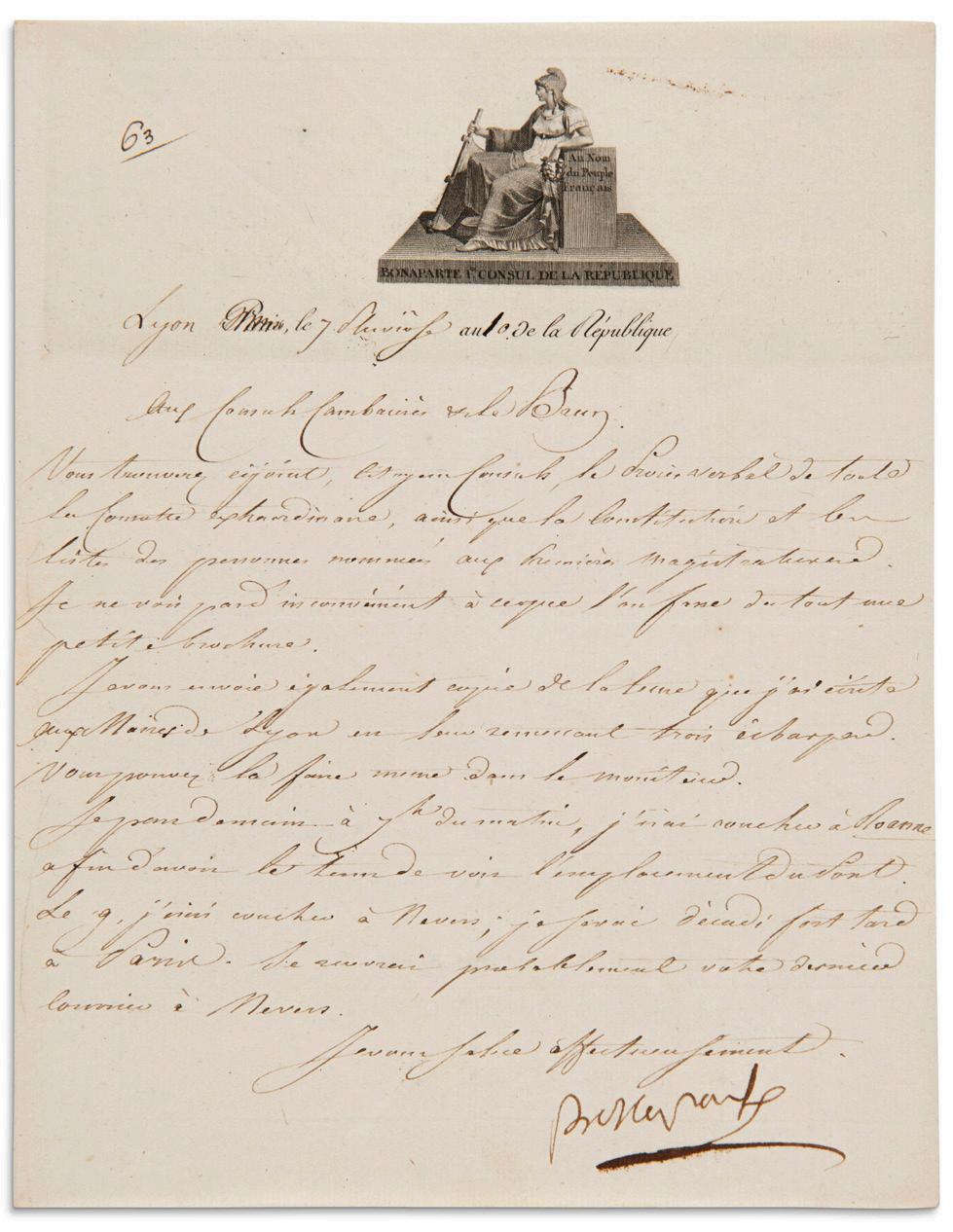 L.S. « Bonaparte », Lyon 23 nivôse X [13 janvier 1802], au Consul CAMBACÉRÈS ; la lettre est écrite par Bourrienne ; 2 pages in-4, vignette gravée au nom de Bonaparte I er Consul de la République (quelques rousseurs). [49]