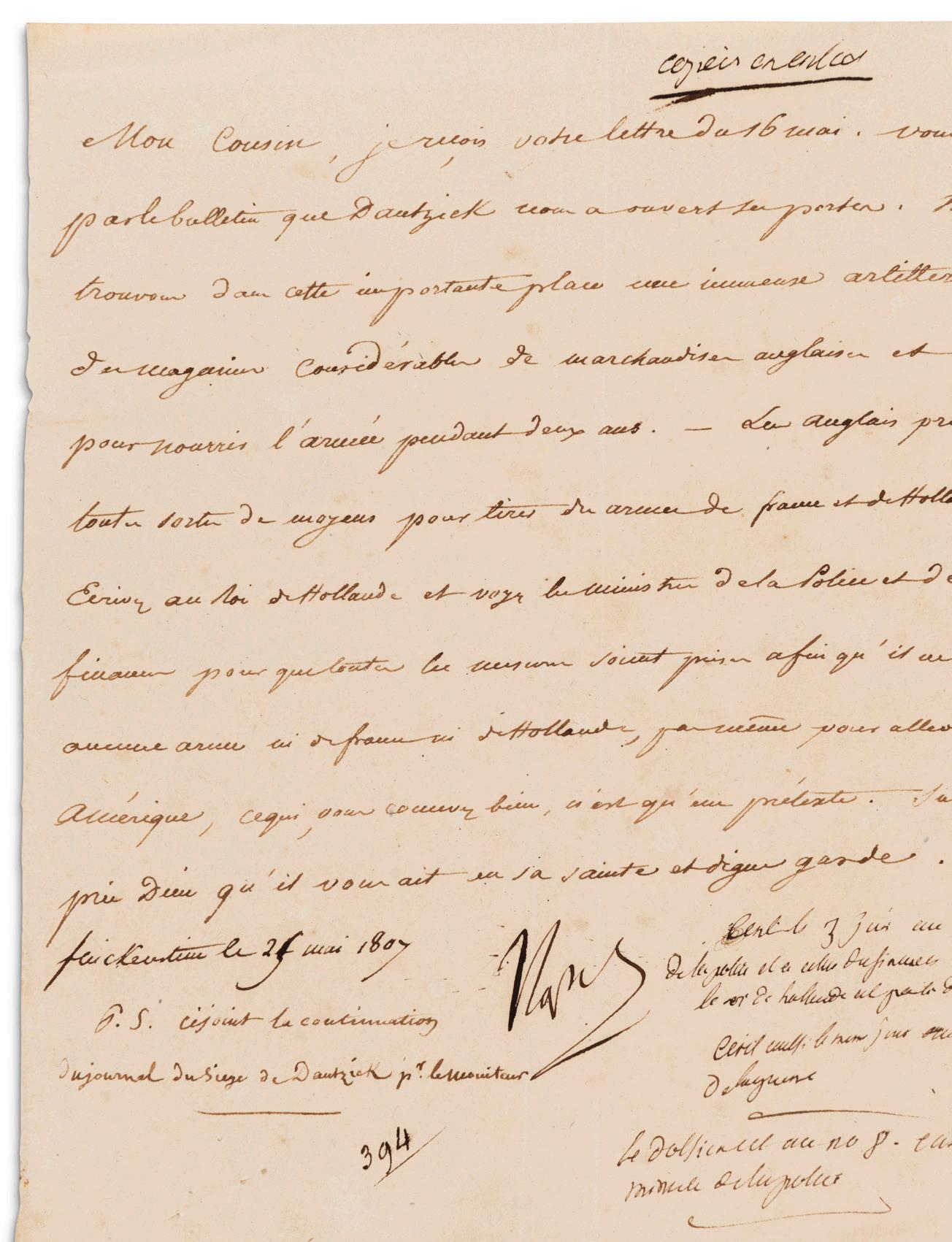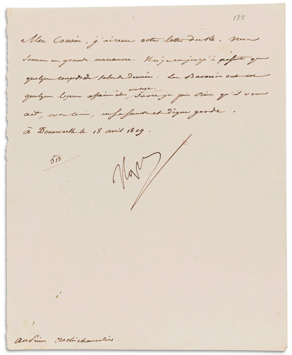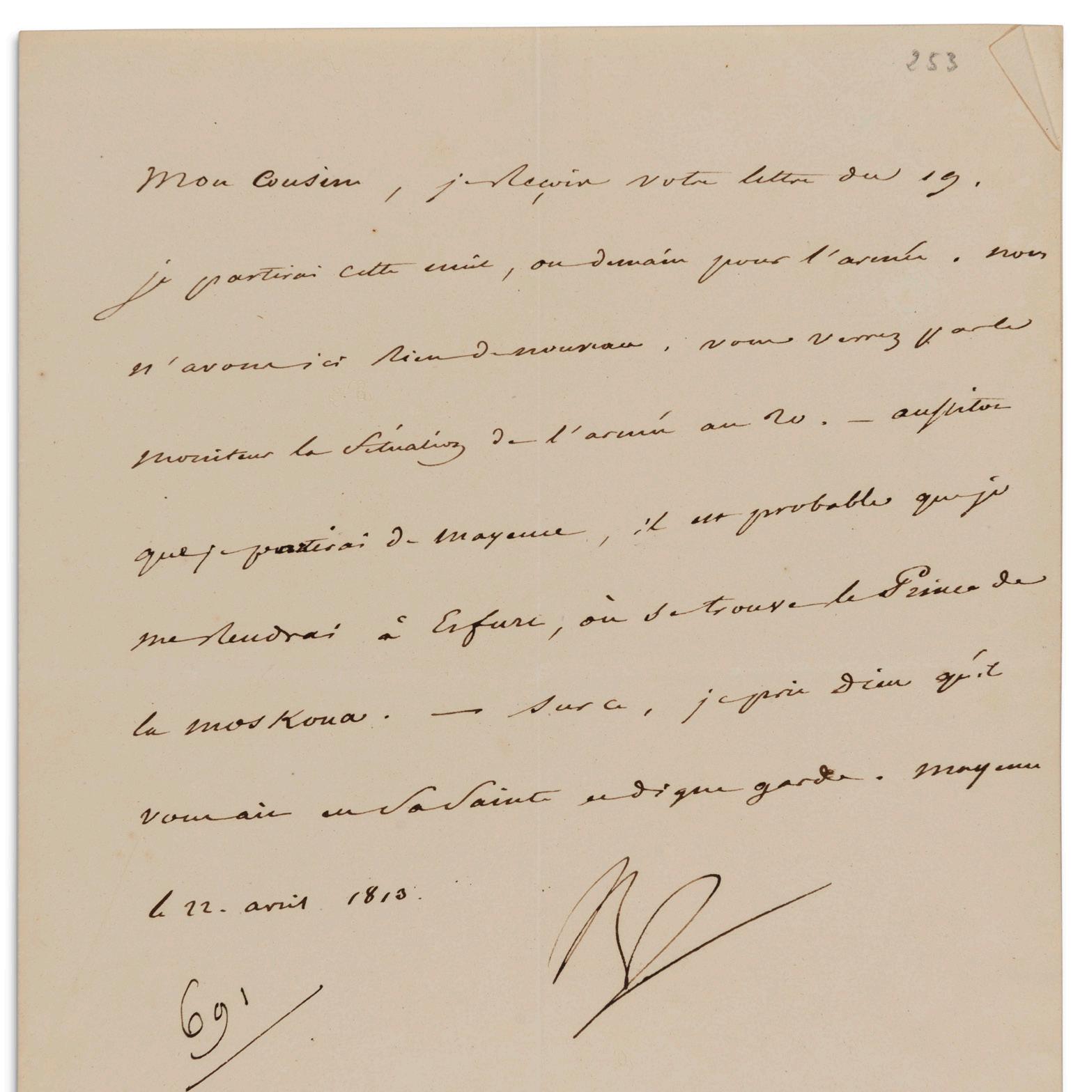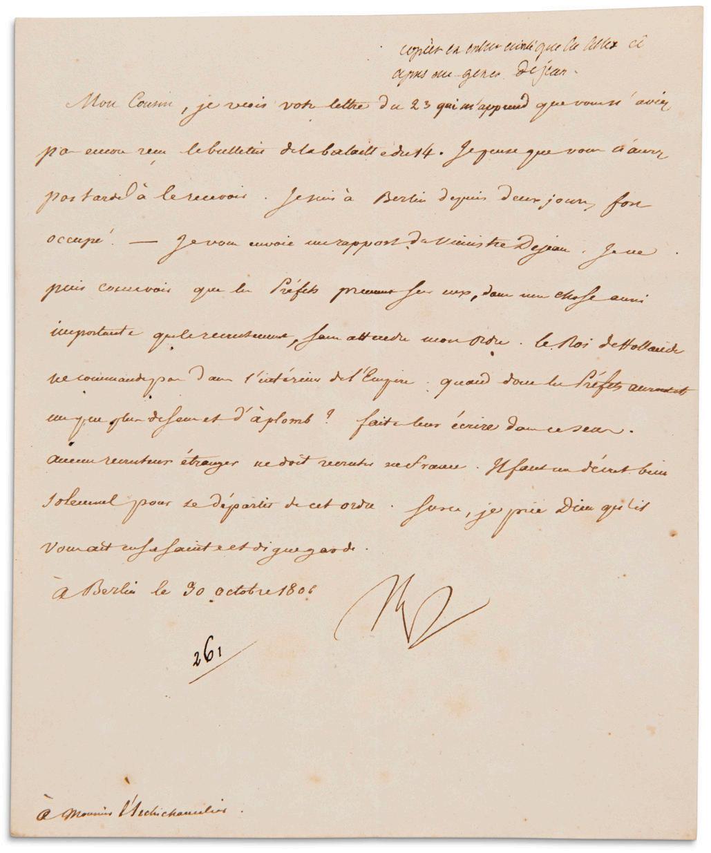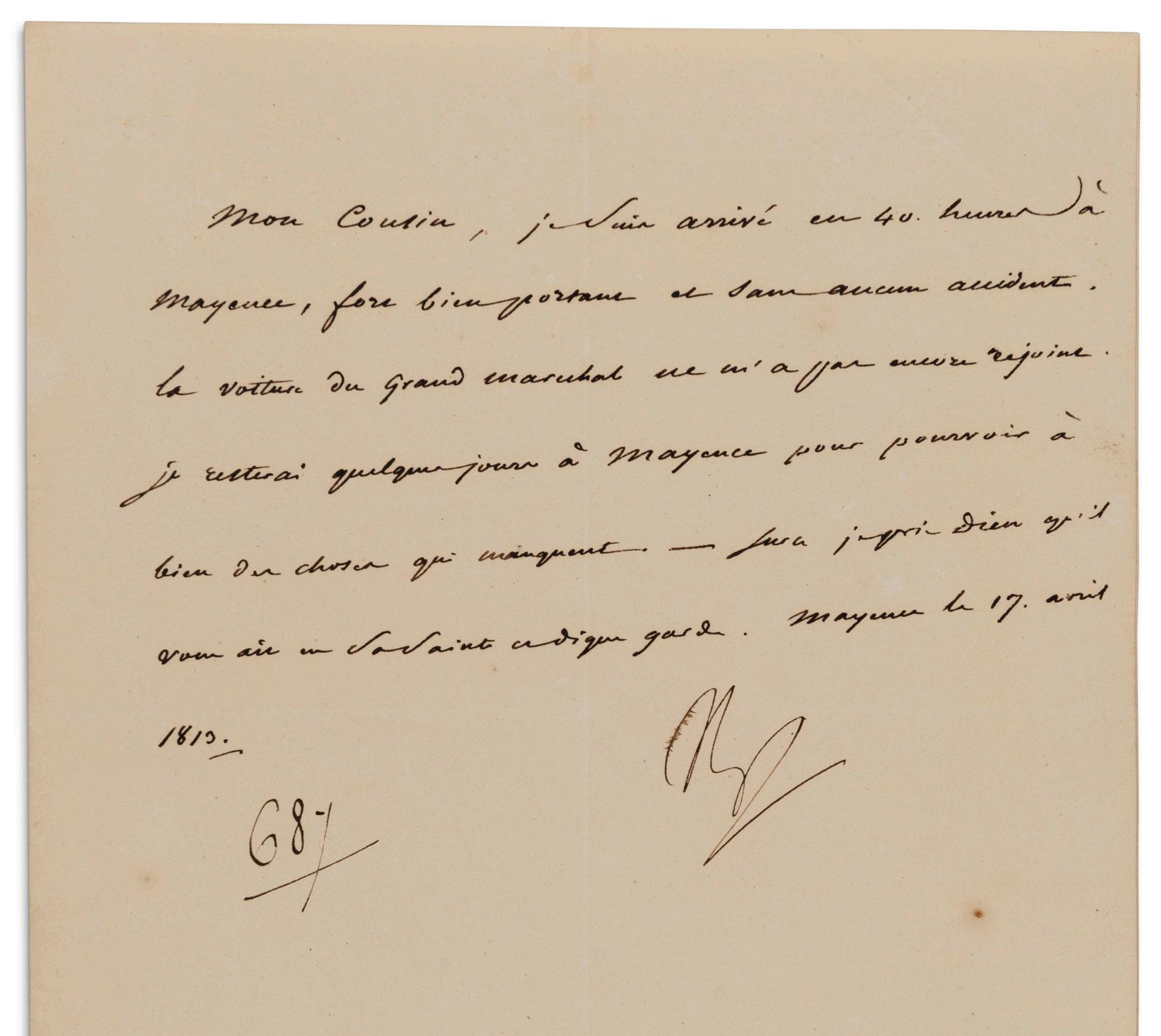 8 mille hommes de troupes qu’il avait, et ne s’était pas sauvé, il n’aurait pas jeté l’alarme, et ses troupes réunies ne l’auraient pas abandonné. Il s’est rendu à Coblence ». Il doit retourner dans son royaume le plus tôt possible. « En général, je suis fort humilié du rôle ridicule que joue ce prince qui n’a ni qualités administratives, ni bon sens. S’il était resté à Cassel, ses troupes ne se fussent pas débandées et il se serait conservé maître de son royaume. […] La pire de toutes les espèces est celle des freluquets »… – Une l.a.s. du baron Fain précise : « L’Empereur montant à cheval a ordonné que ces deux lettres partissent sans être signées »... Gotha 25 octobre. « Mon Cousin, vous verrez une lettre tout à fait aimable que m’a écrite la princesse Pauline. Je la fais mettre dans le Moniteur avec ma réponse. Comme vous êtes fort dans la confiance de cette princesse, écrivez-lui pour lui faire connaître combien cette démarche de sa part m’a fait plaisir »… Francfort 31 octobre à 4 heures . « J’arrive à Francfort. L’armée Bavaroise et l’armée Autrichienne qui était opposée à la Bavière, formant 60 mille hommes, étaient venues se poster à Hanau, voulant me couper de la France. Je les ai battus hier d’importance ; je leur ai pris du canon, des drapeaux et six mille hommes »…