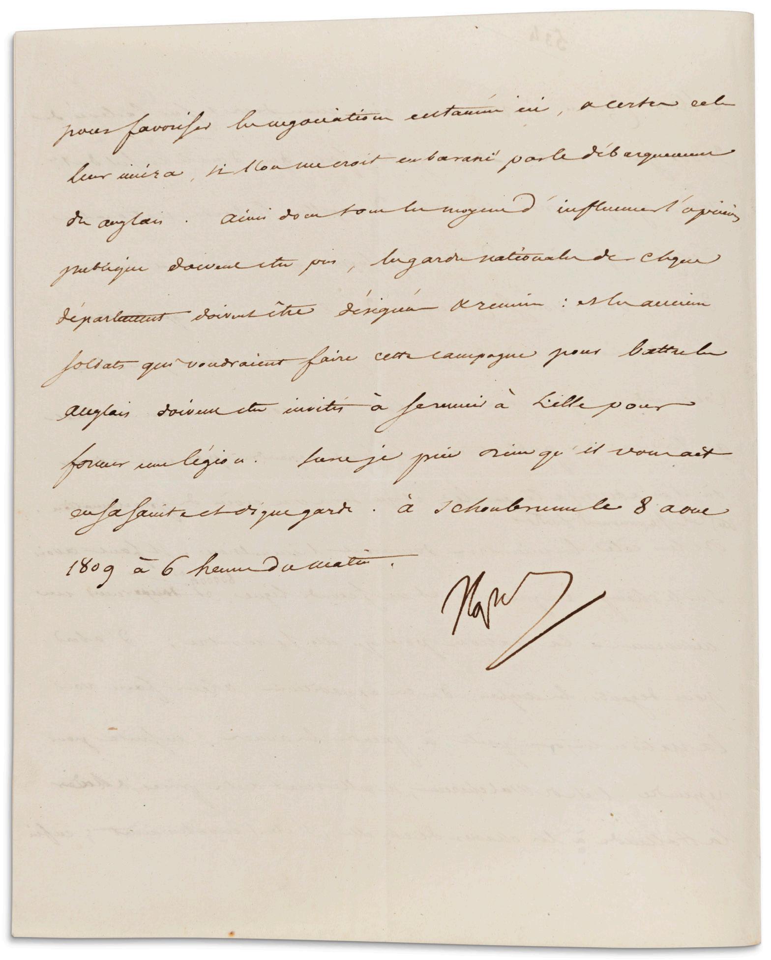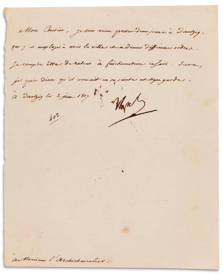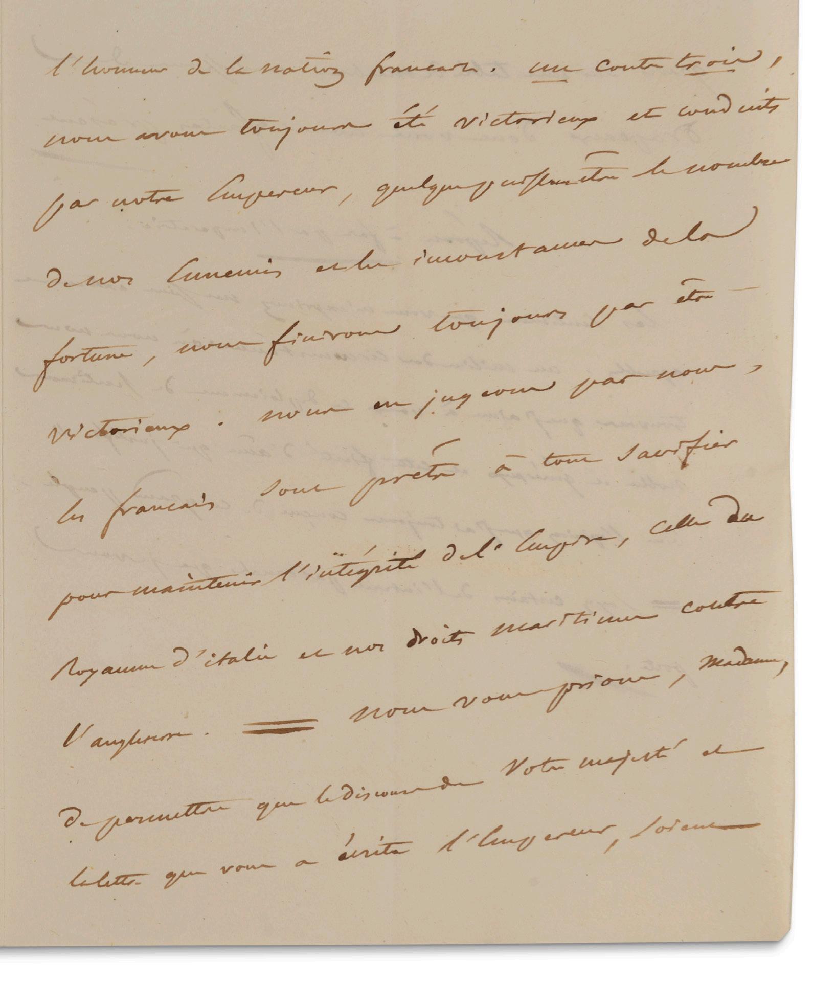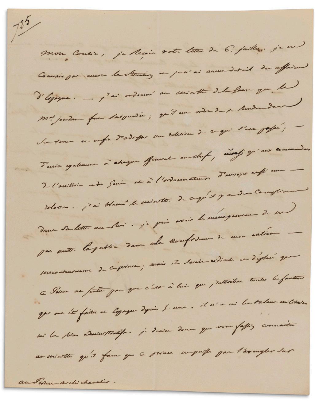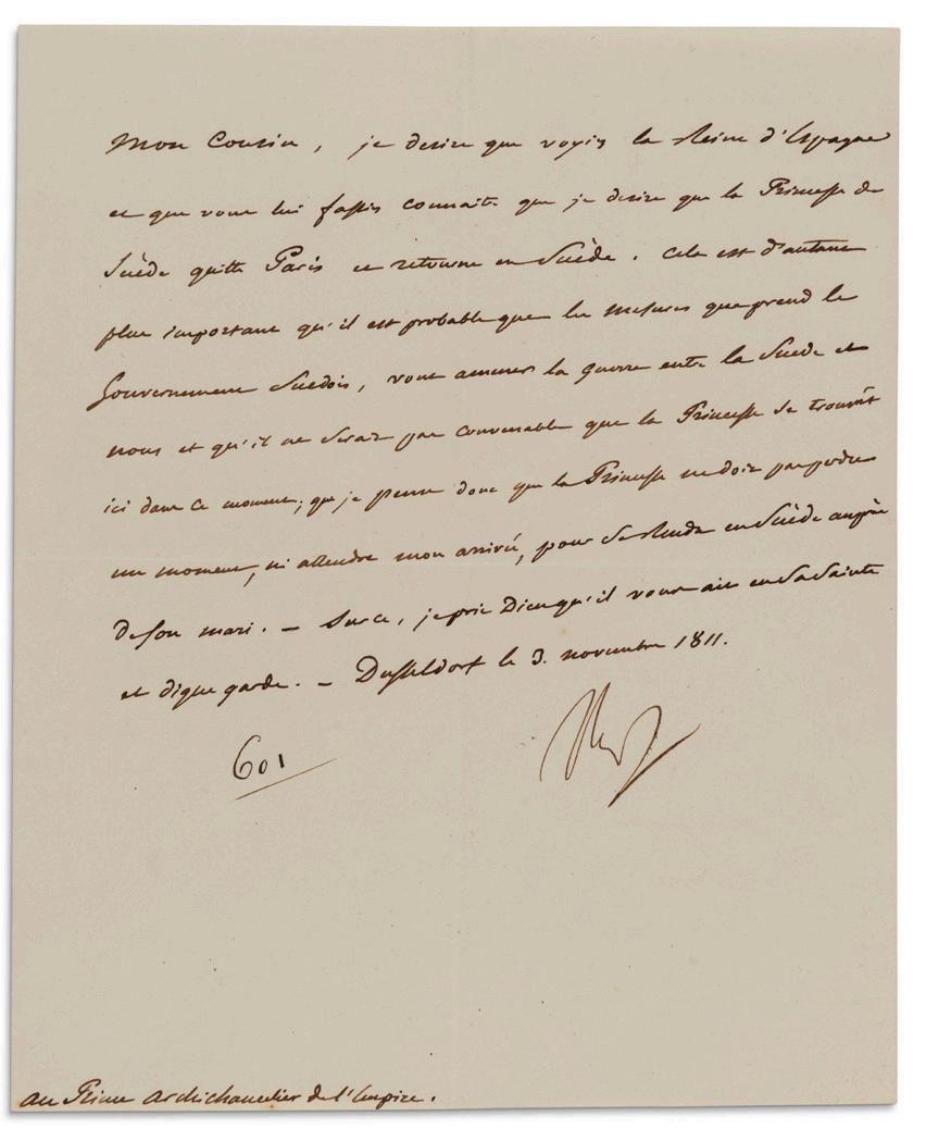 8 mille hommes de troupes qu’il avait, et ne s’était pas sauvé, il n’aurait pas jeté l’alarme, et ses troupes réunies ne l’auraient pas abandonné. Il s’est rendu à Coblence ». Il doit retourner dans son royaume le plus tôt possible. « En général, je suis fort humilié du rôle ridicule que joue ce prince qui n’a ni qualités administratives, ni bon sens. S’il était resté à Cassel, ses troupes ne se fussent pas débandées et il se serait conservé maître de son royaume. […] La pire de toutes les espèces est celle des freluquets »… – Une l.a.s. du baron Fain précise : « L’Empereur montant à cheval a ordonné que ces deux lettres partissent sans être signées »... Gotha 25 octobre. « Mon Cousin, vous verrez une lettre tout à fait aimable que m’a écrite la princesse Pauline. Je la fais mettre dans le Moniteur avec ma réponse. Comme vous êtes fort dans la confiance de cette princesse, écrivez-lui pour lui faire connaître combien cette démarche de sa part m’a fait plaisir »… Francfort 31 octobre à 4 heures . « J’arrive à Francfort. L’armée Bavaroise et l’armée Autrichienne qui était opposée à la Bavière, formant 60 mille hommes, étaient venues se poster à Hanau, voulant me couper de la France. Je les ai battus hier d’importance ; je leur ai pris du canon, des drapeaux et six mille hommes »…