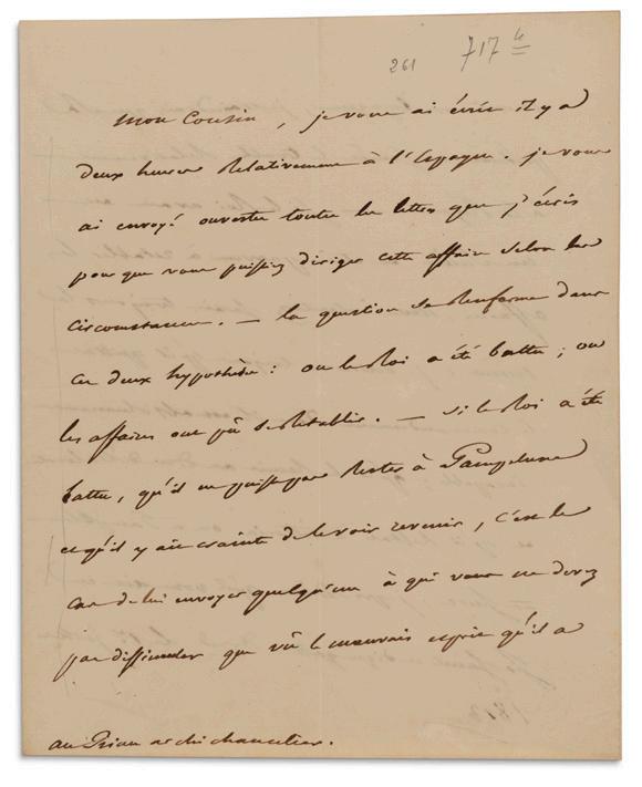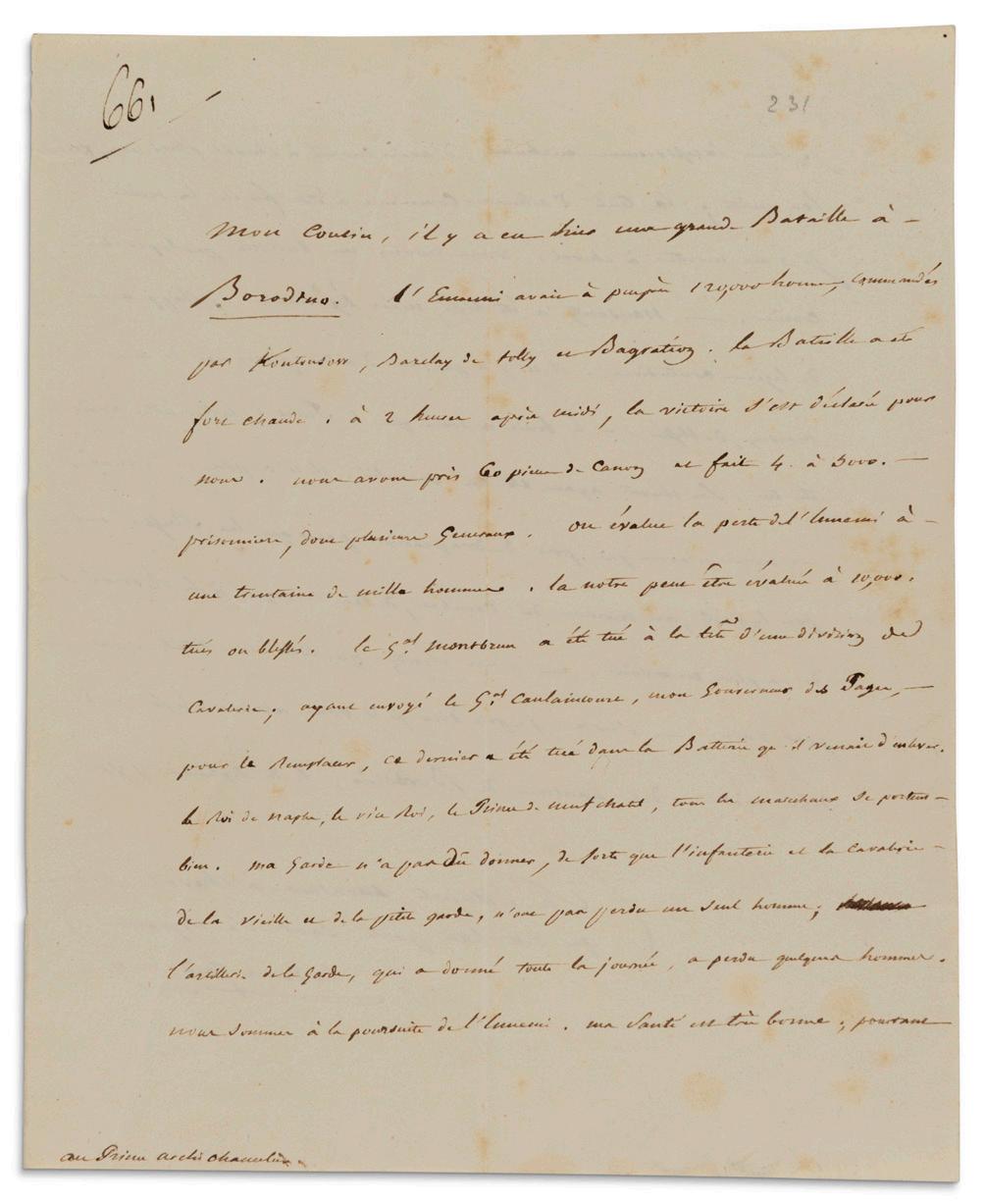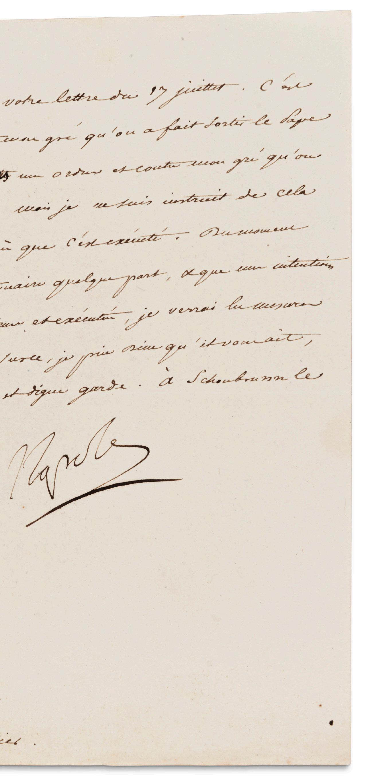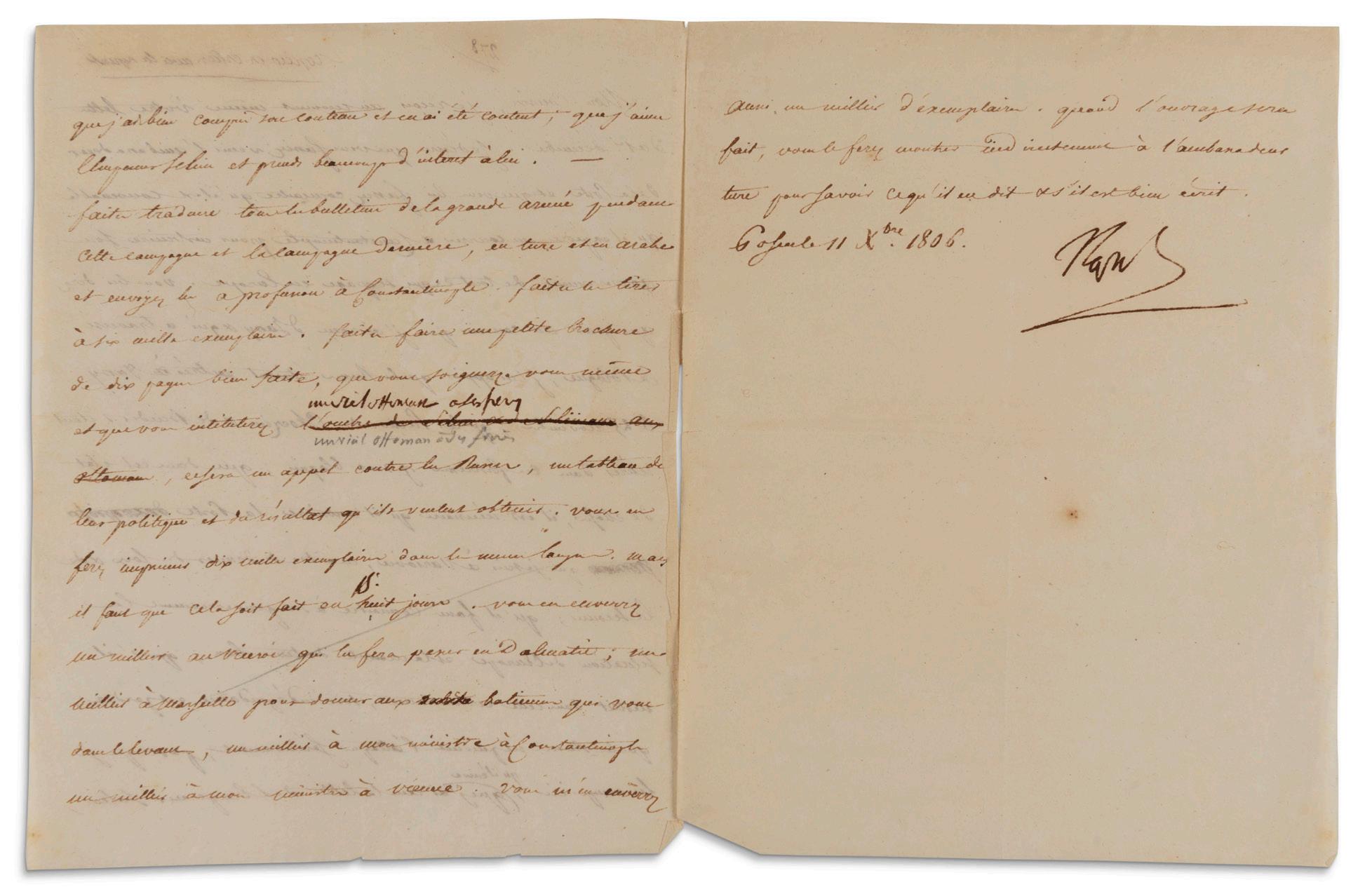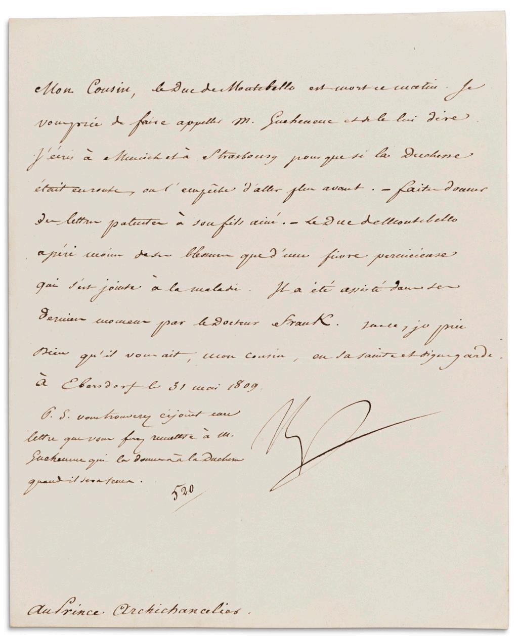 8 mille hommes de troupes qu’il avait, et ne s’était pas sauvé, il n’aurait pas jeté l’alarme, et ses troupes réunies ne l’auraient pas abandonné. Il s’est rendu à Coblence ». Il doit retourner dans son royaume le plus tôt possible. « En général, je suis fort humilié du rôle ridicule que joue ce prince qui n’a ni qualités administratives, ni bon sens. S’il était resté à Cassel, ses troupes ne se fussent pas débandées et il se serait conservé maître de son royaume. […] La pire de toutes les espèces est celle des freluquets »… – Une l.a.s. du baron Fain précise : « L’Empereur montant à cheval a ordonné que ces deux lettres partissent sans être signées »... Gotha 25 octobre. « Mon Cousin, vous verrez une lettre tout à fait aimable que m’a écrite la princesse Pauline. Je la fais mettre dans le Moniteur avec ma réponse. Comme vous êtes fort dans la confiance de cette princesse, écrivez-lui pour lui faire connaître combien cette démarche de sa part m’a fait plaisir »… Francfort 31 octobre à 4 heures . « J’arrive à Francfort. L’armée Bavaroise et l’armée Autrichienne qui était opposée à la Bavière, formant 60 mille hommes, étaient venues se poster à Hanau, voulant me couper de la France. Je les ai battus hier d’importance ; je leur ai pris du canon, des drapeaux et six mille hommes »…