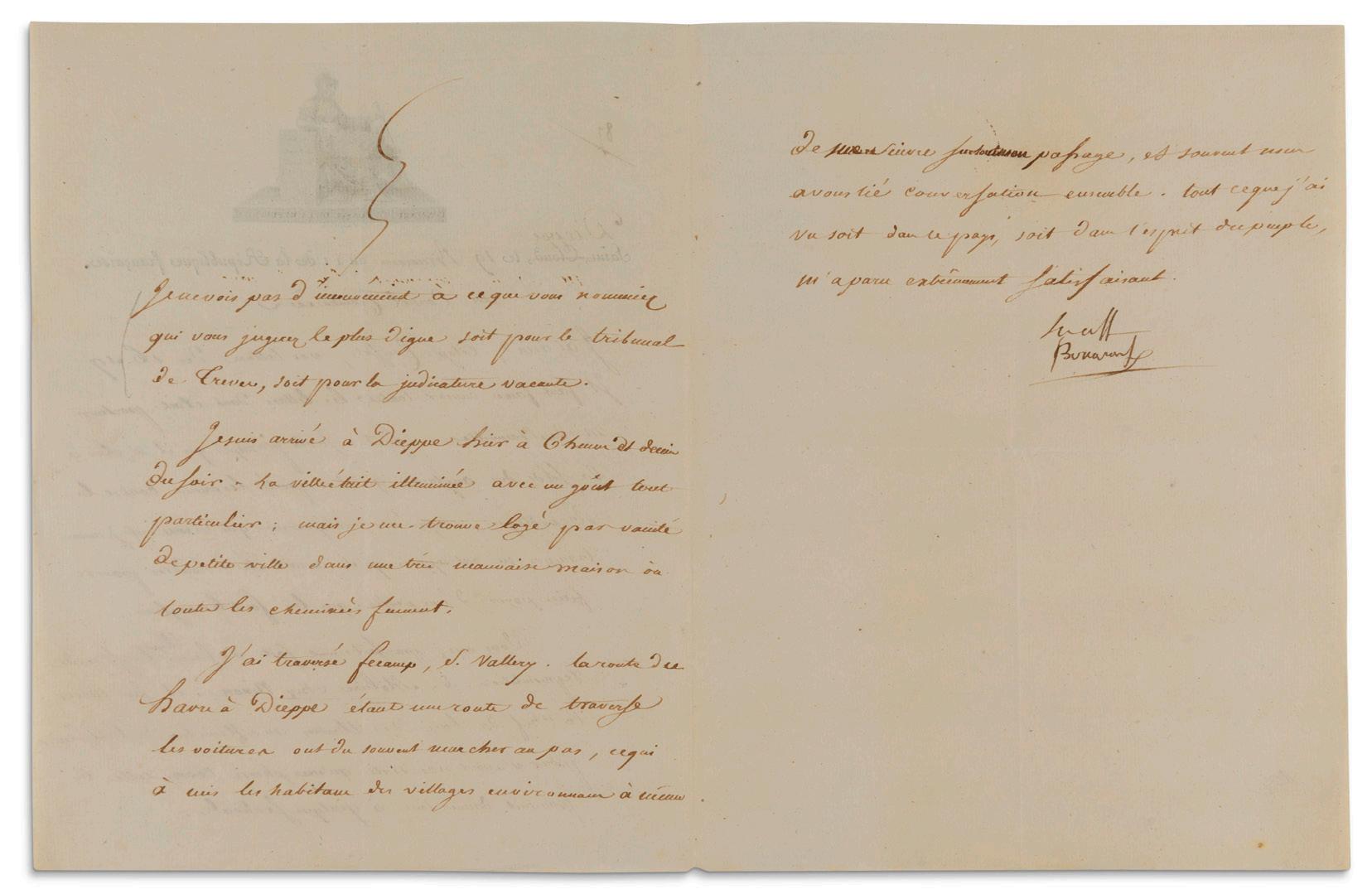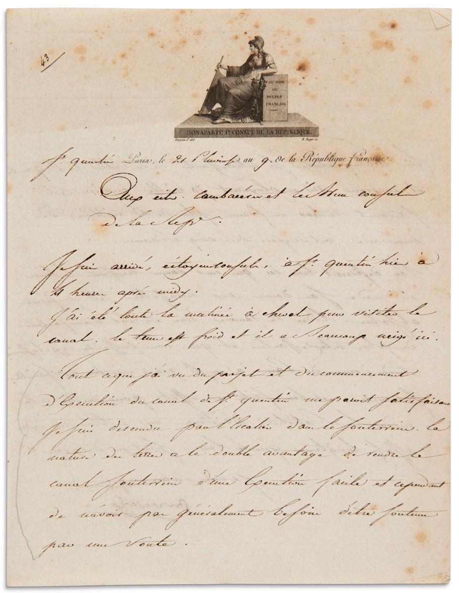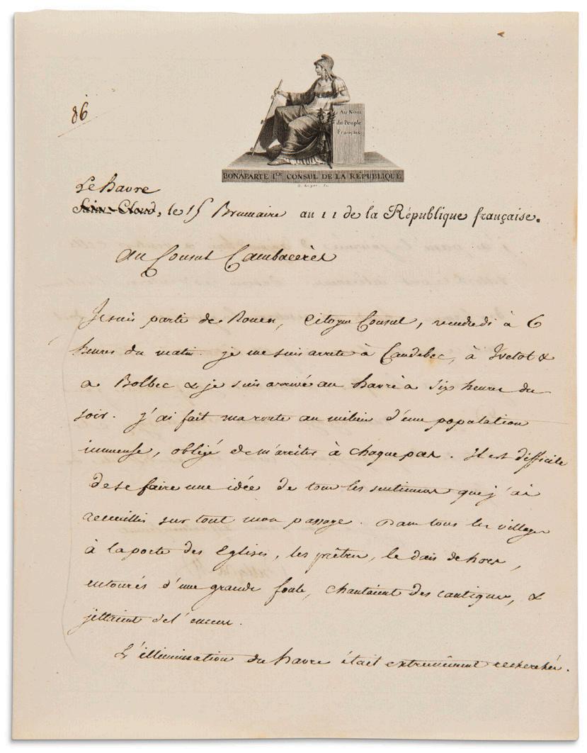 L.S. avec un mot autographe « affectueusement Bonaparte », Saint-Quentin 21 pluviôse IX [10 février 1801], aux Consuls à CAMBACÉRÈS et LEBRUN ; la lettre est écrite par Bourrienne ; 2 pages in-4, vignette gravée au nom de Bonaparte I er Consul de la République (rousseurs). [43]