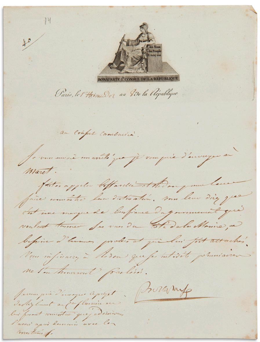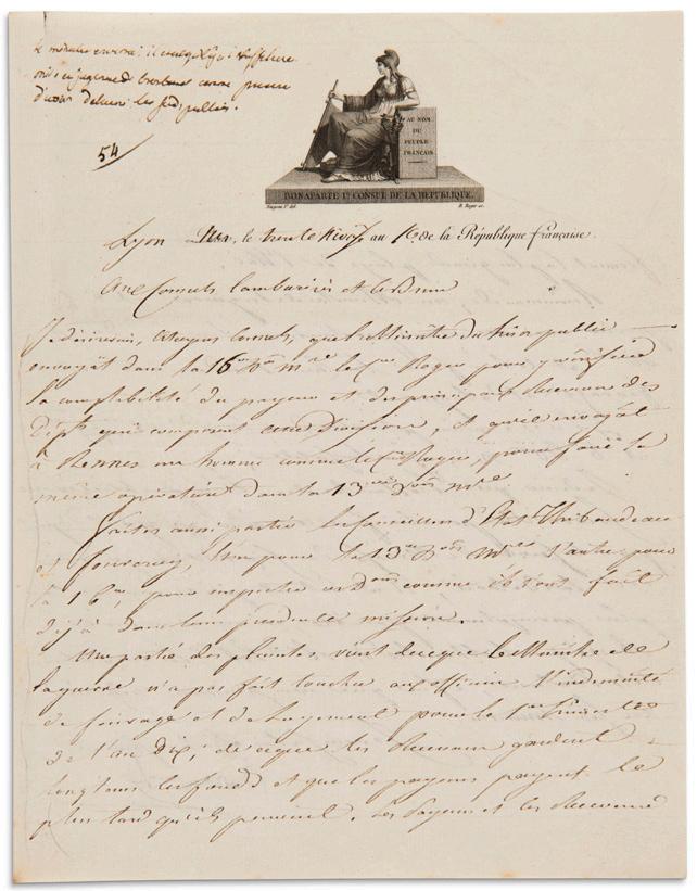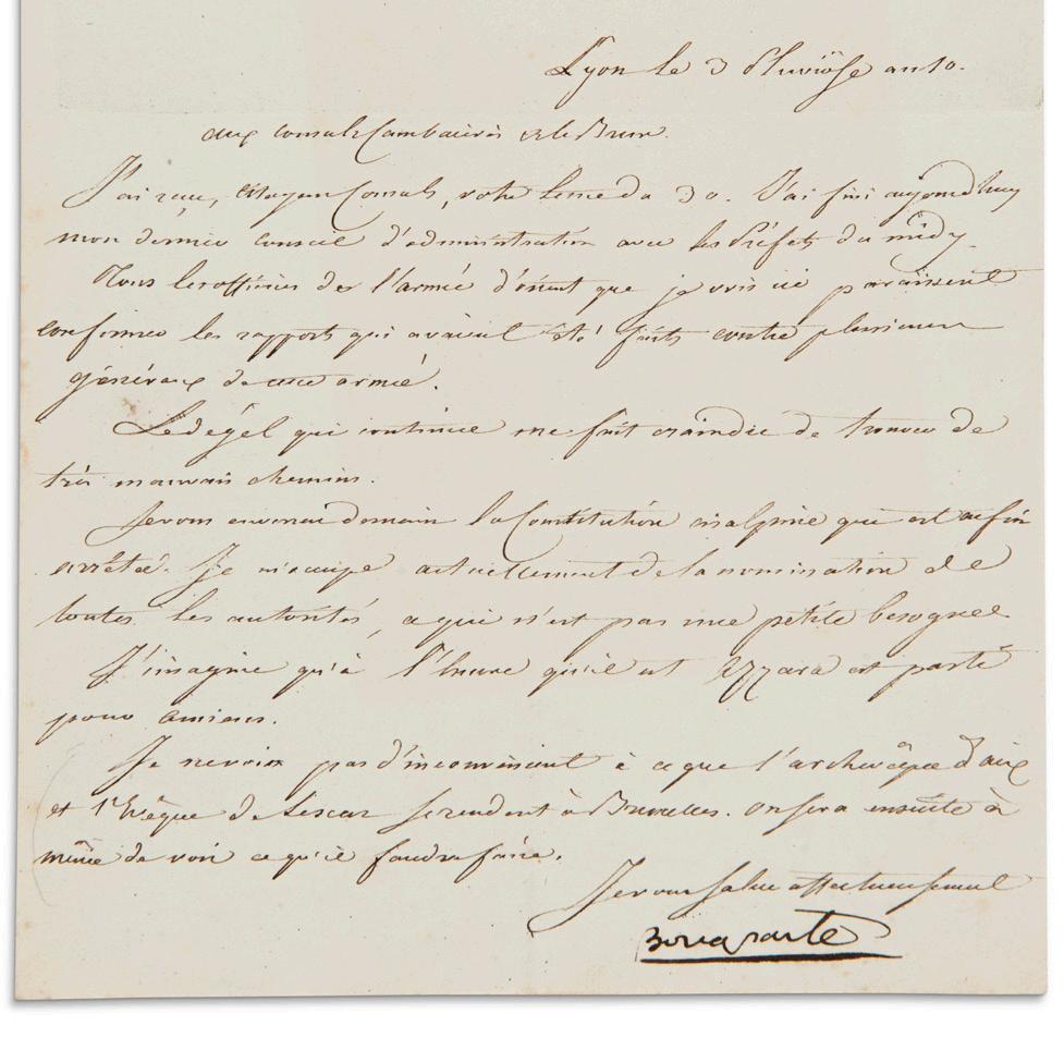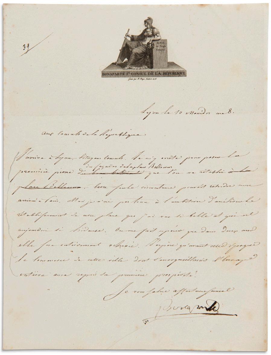 L.S. « Bonaparte », Lyon 10 messidor VIII [29 juin 1800], « aux Consuls de la République » CAMBACÉRÈS et LEBRUN ; la lettre est écrite par Bourrienne ; 1 page in-4, vignette gravée au nom de Bonaparte I er Consul de la République . [39]