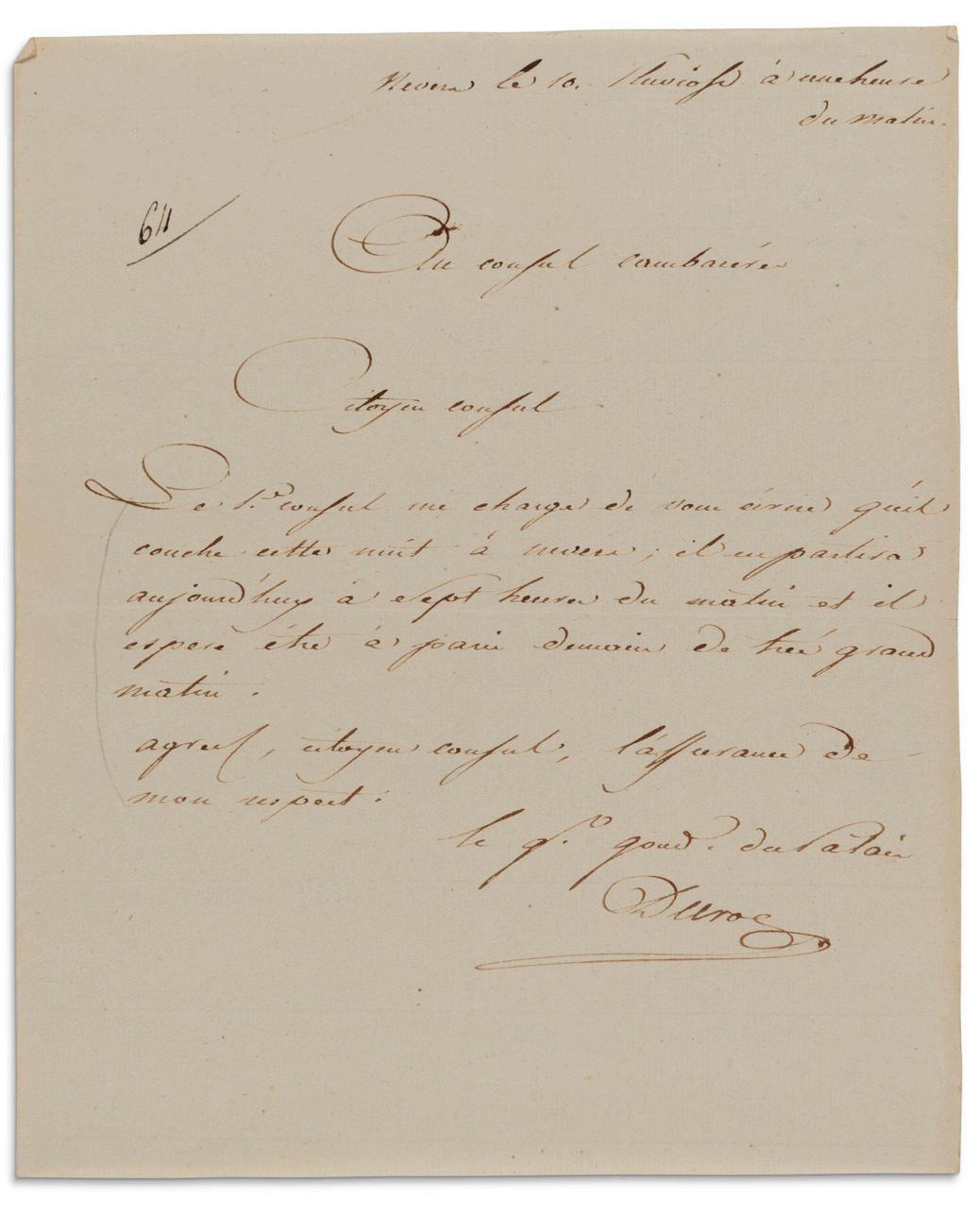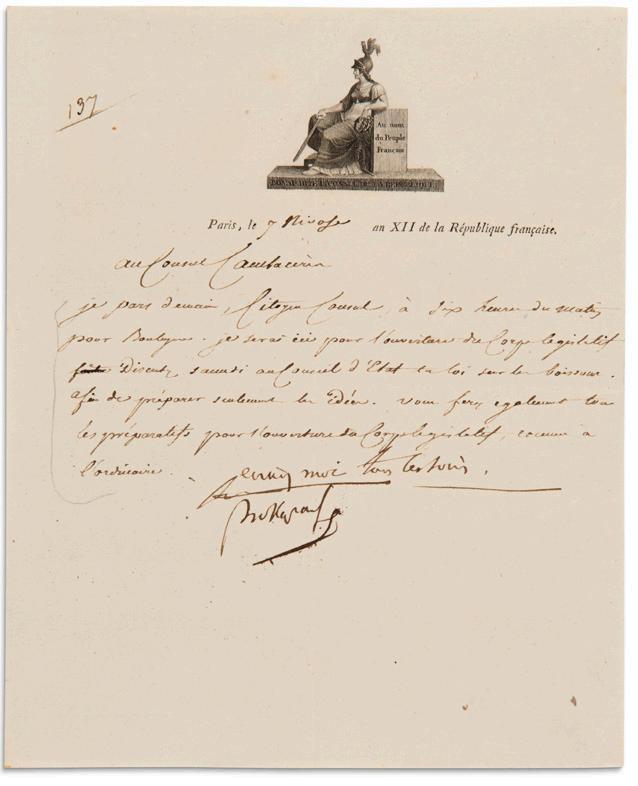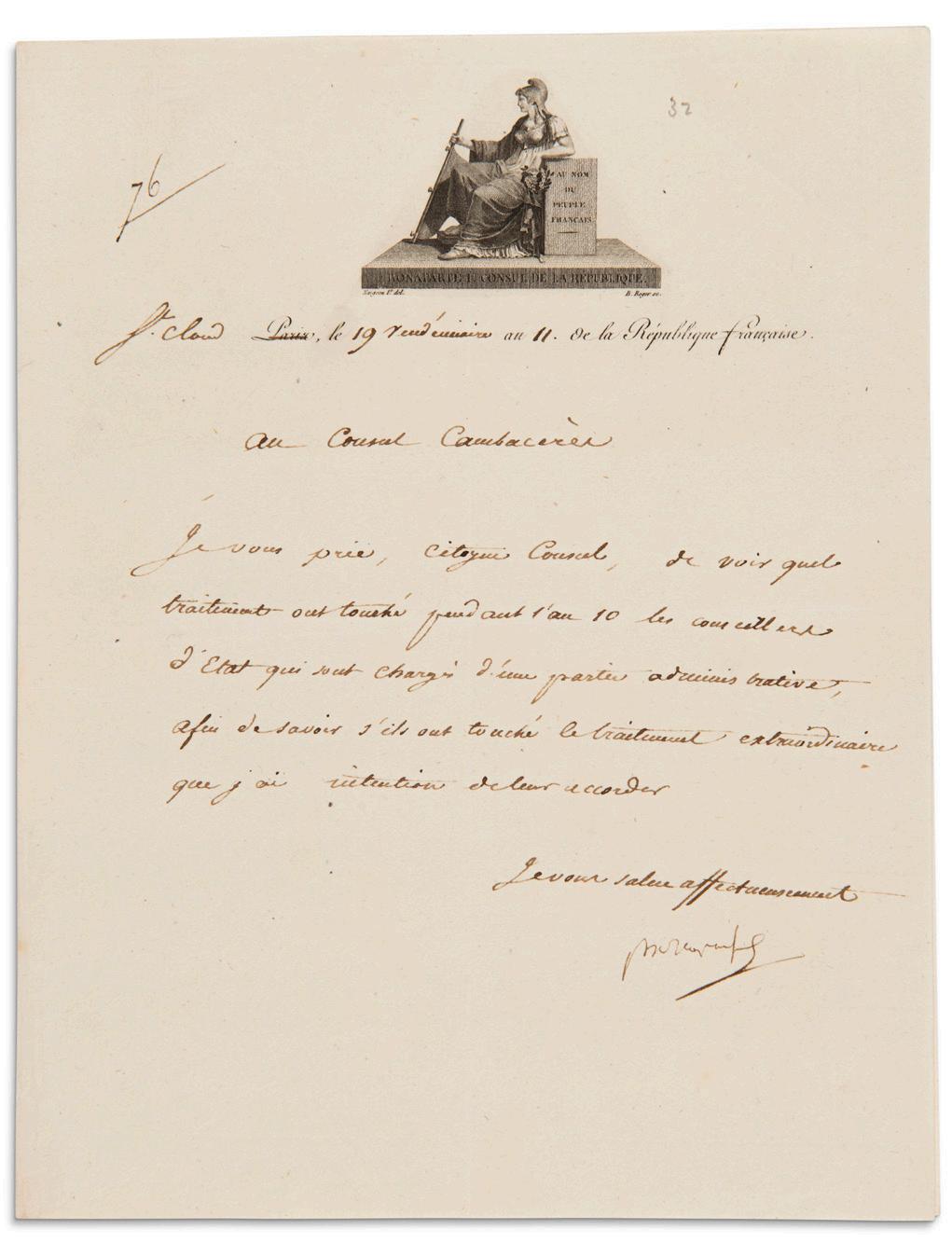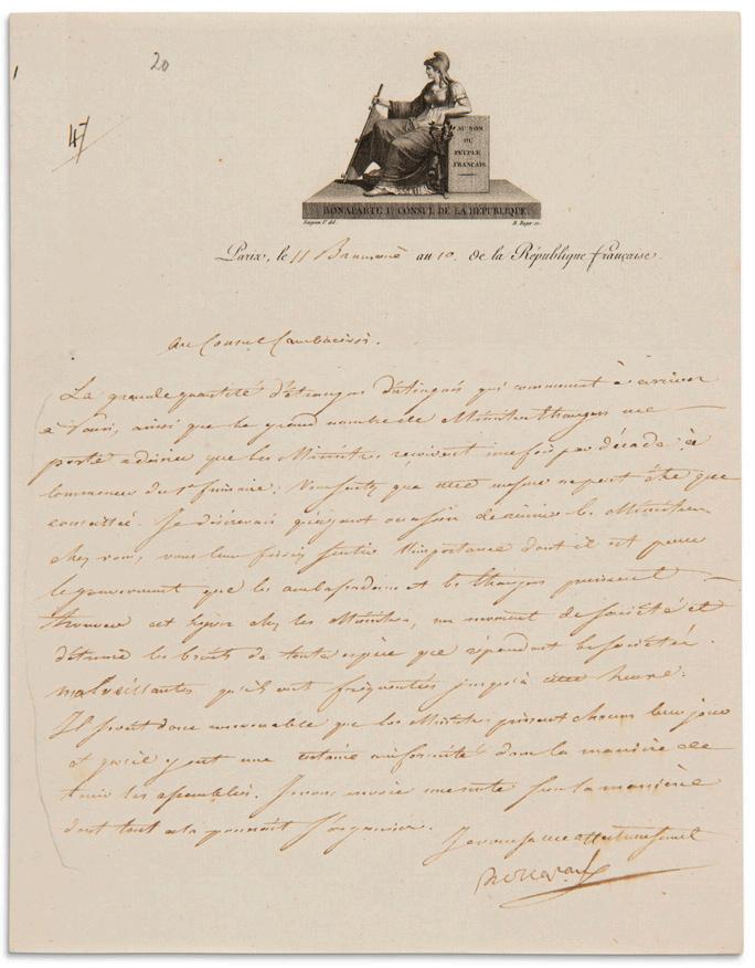 L.S. avec un mot autographe « Salut Bonaparte », Paris 30 nivôse IX [20 janvier 1801], au Consul CAMBACÉRÈS ; la lettre est écrite par Bourrienne ; 1 page in-4, vignette gravée au nom de Bonaparte I er Consul de la République. [42]