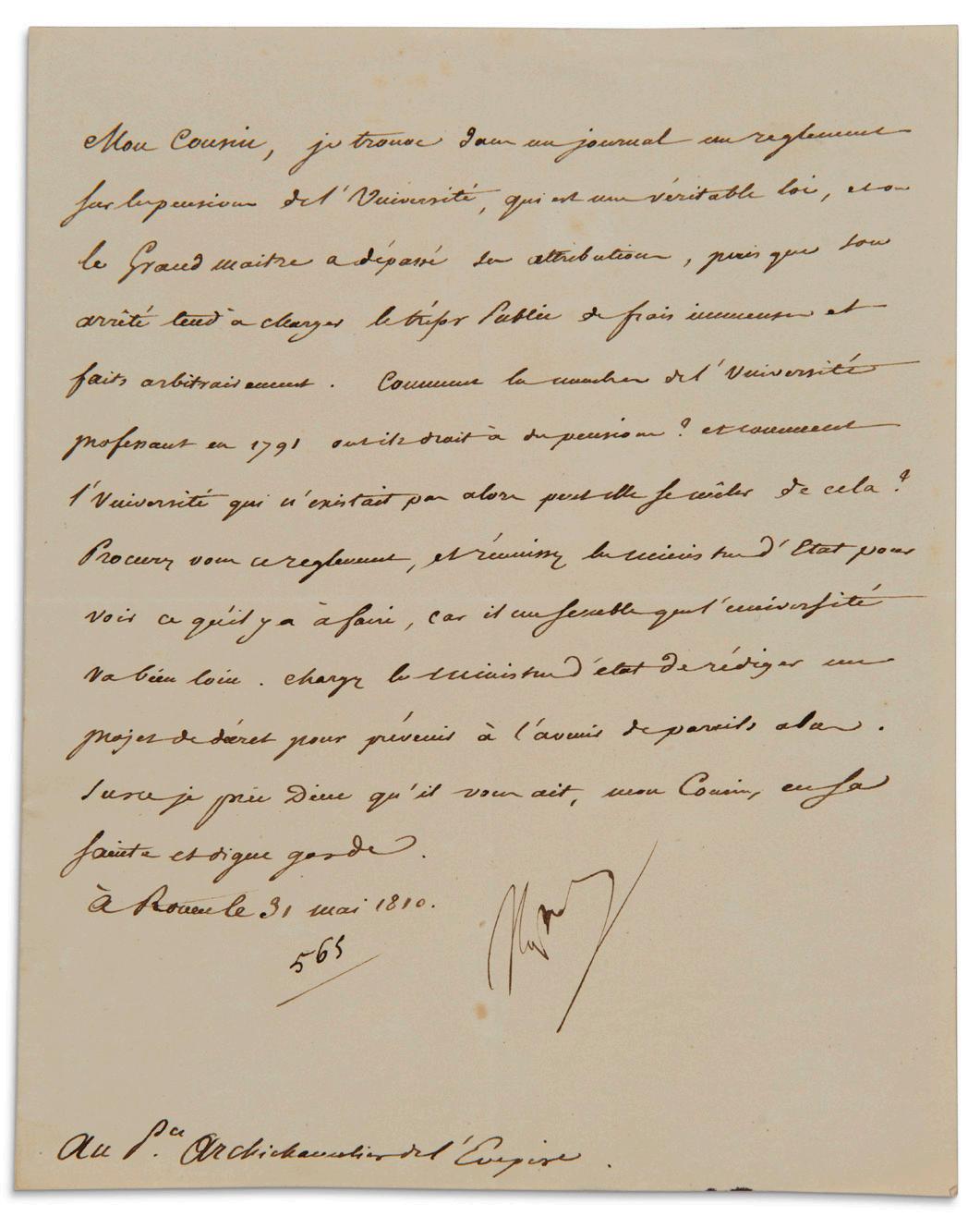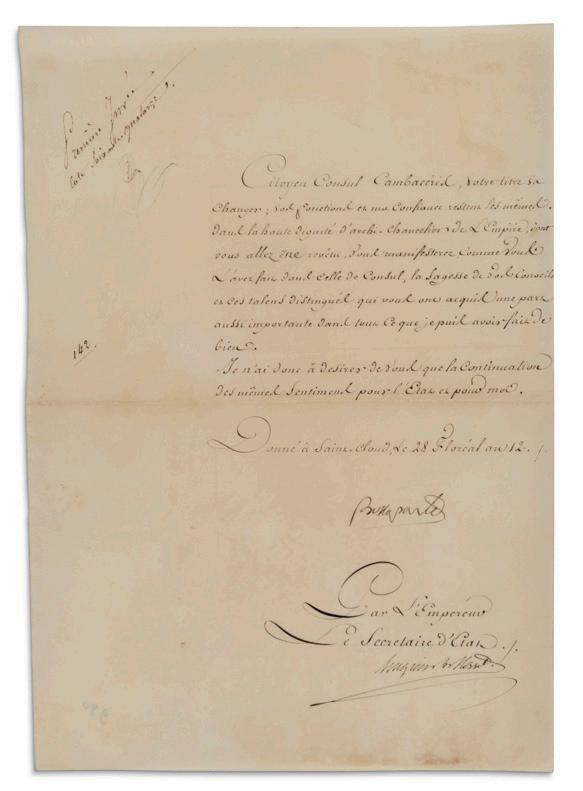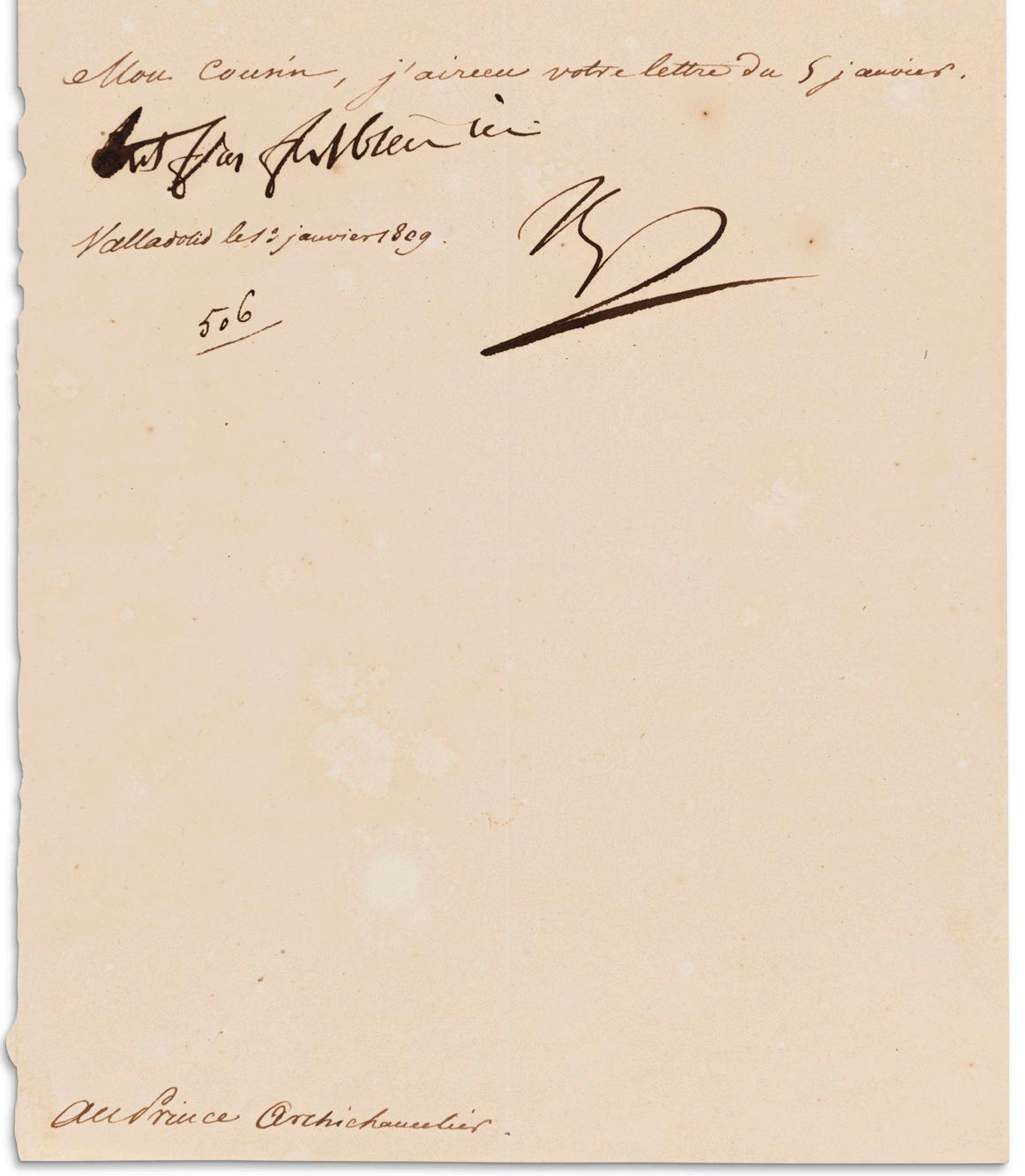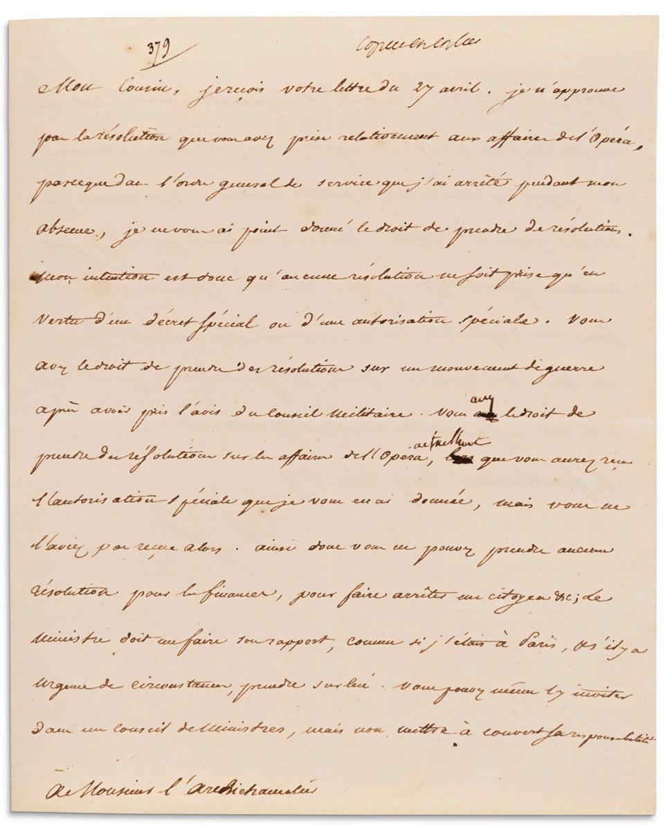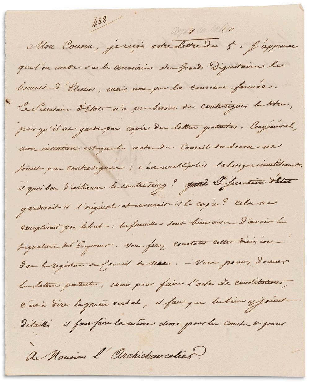 Les premières lettres sont adressées par le premier Consul Bonaparte aux deux citoyens Consuls Cambacérès et Lebrun, puis au seul Cambacérès avec lequel s’établit une relation privilégiée. Lorsque Napoléon devient Empereur, il nomme Cambacérès Archichancelier de l’Empire. Dès lors, les lettres commencent généralement par l’apostrophe « Mon cousin », l’accusé de récep tion des lettres de son correspondant, et s’achèvent par la formule : « Sur ce, je prie Dieu qu’il vous ait en sa sainte et digne garde ». Une grande partie de ces lettres ont été annotées par Cambacérès, souvent brièvement : « copier en entier », parfois un peu plus longuement.