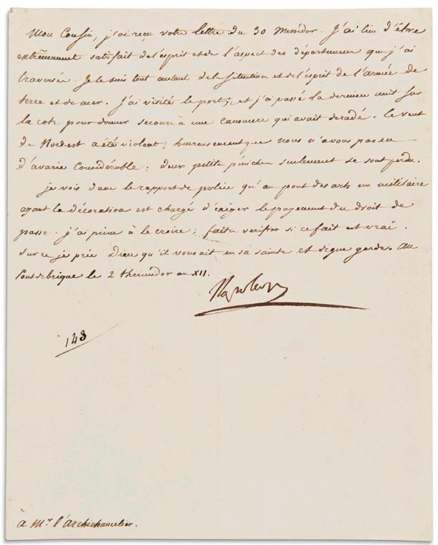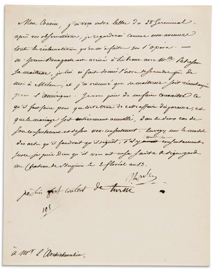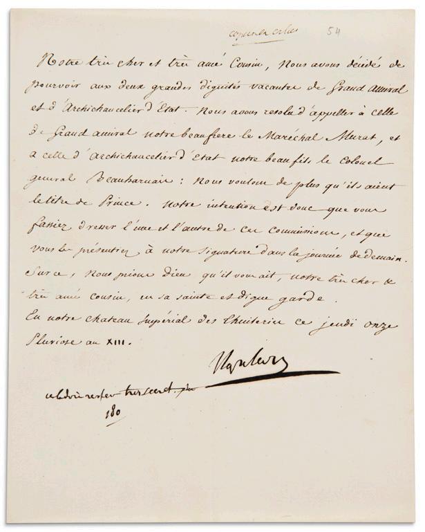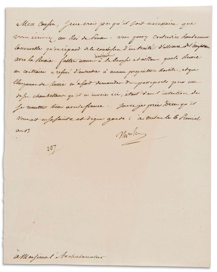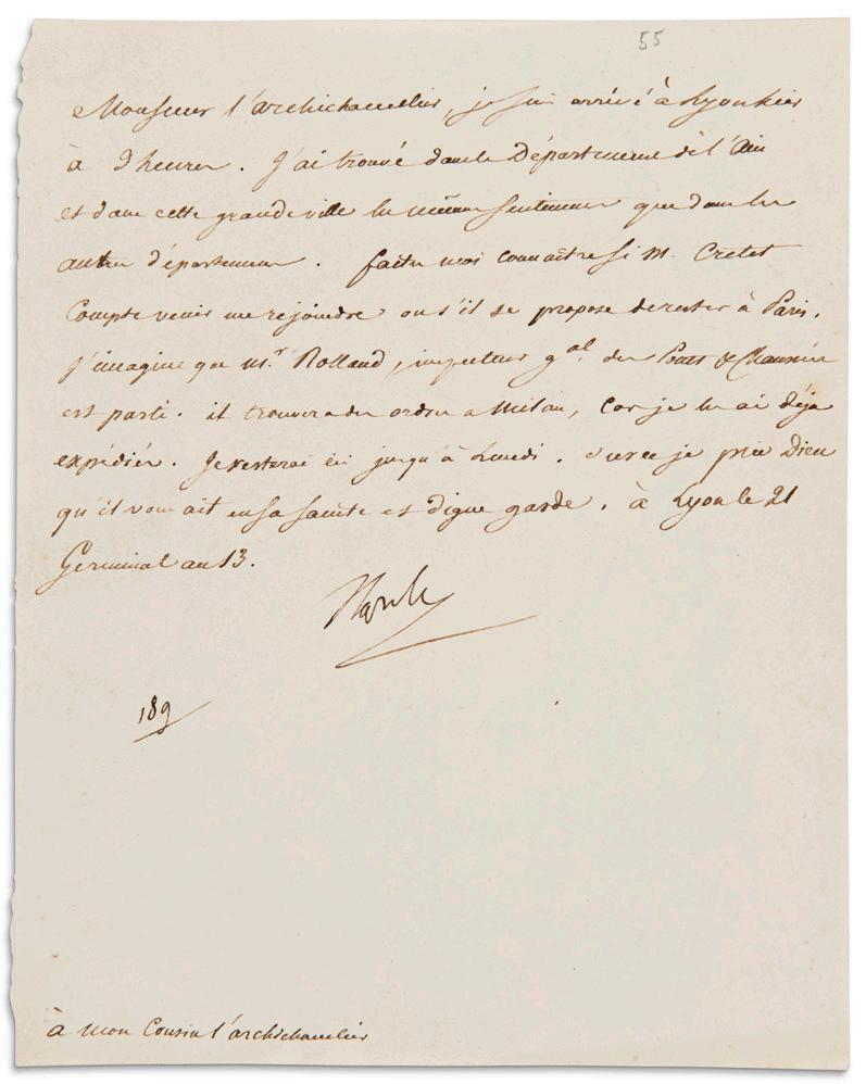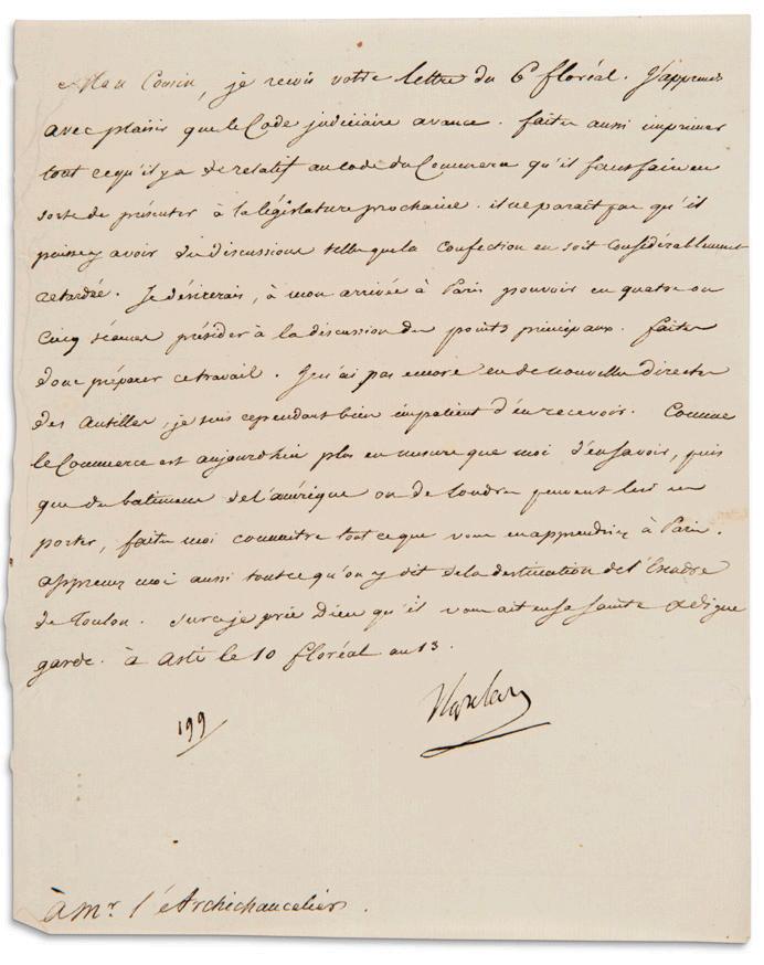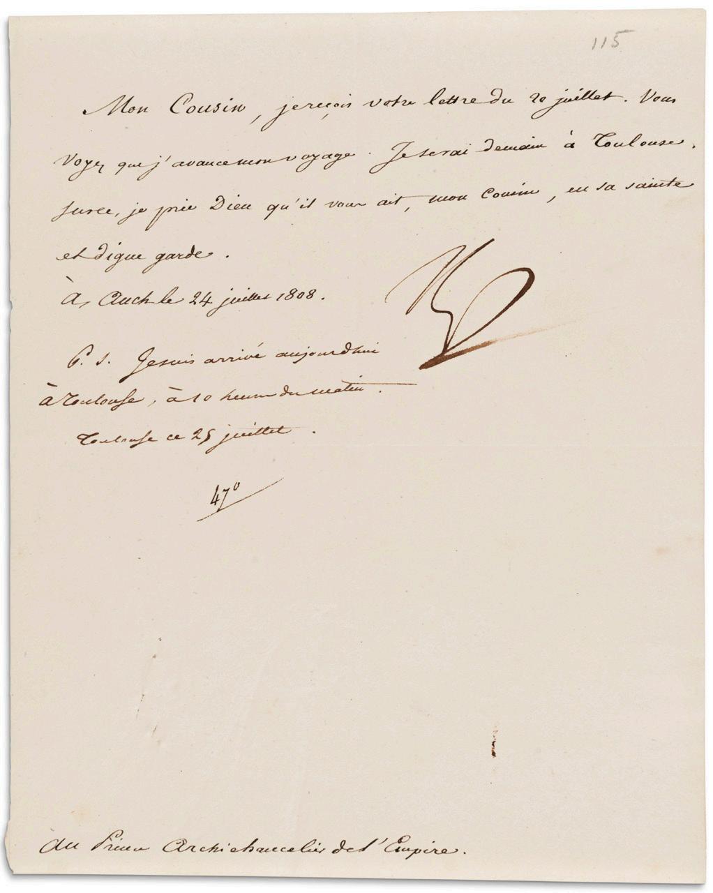 Les premières lettres sont adressées par le premier Consul Bonaparte aux deux citoyens Consuls Cambacérès et Lebrun, puis au seul Cambacérès avec lequel s’établit une relation privilégiée. Lorsque Napoléon devient Empereur, il nomme Cambacérès Archichancelier de l’Empire. Dès lors, les lettres commencent généralement par l’apostrophe « Mon cousin », l’accusé de récep tion des lettres de son correspondant, et s’achèvent par la formule : « Sur ce, je prie Dieu qu’il vous ait en sa sainte et digne garde ». Une grande partie de ces lettres ont été annotées par Cambacérès, souvent brièvement : « copier en entier », parfois un peu plus longuement.
