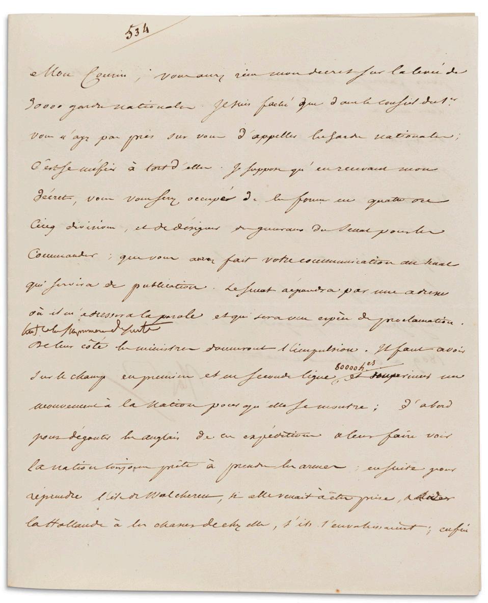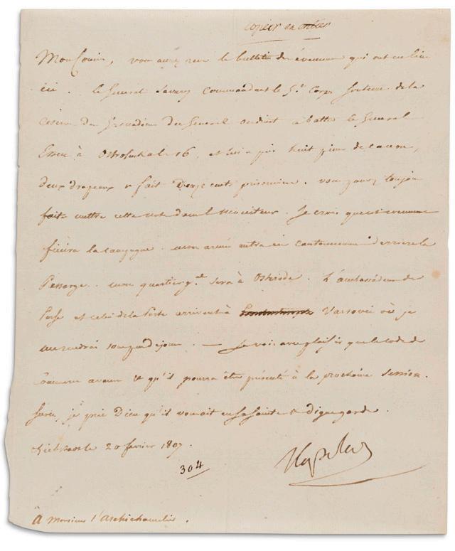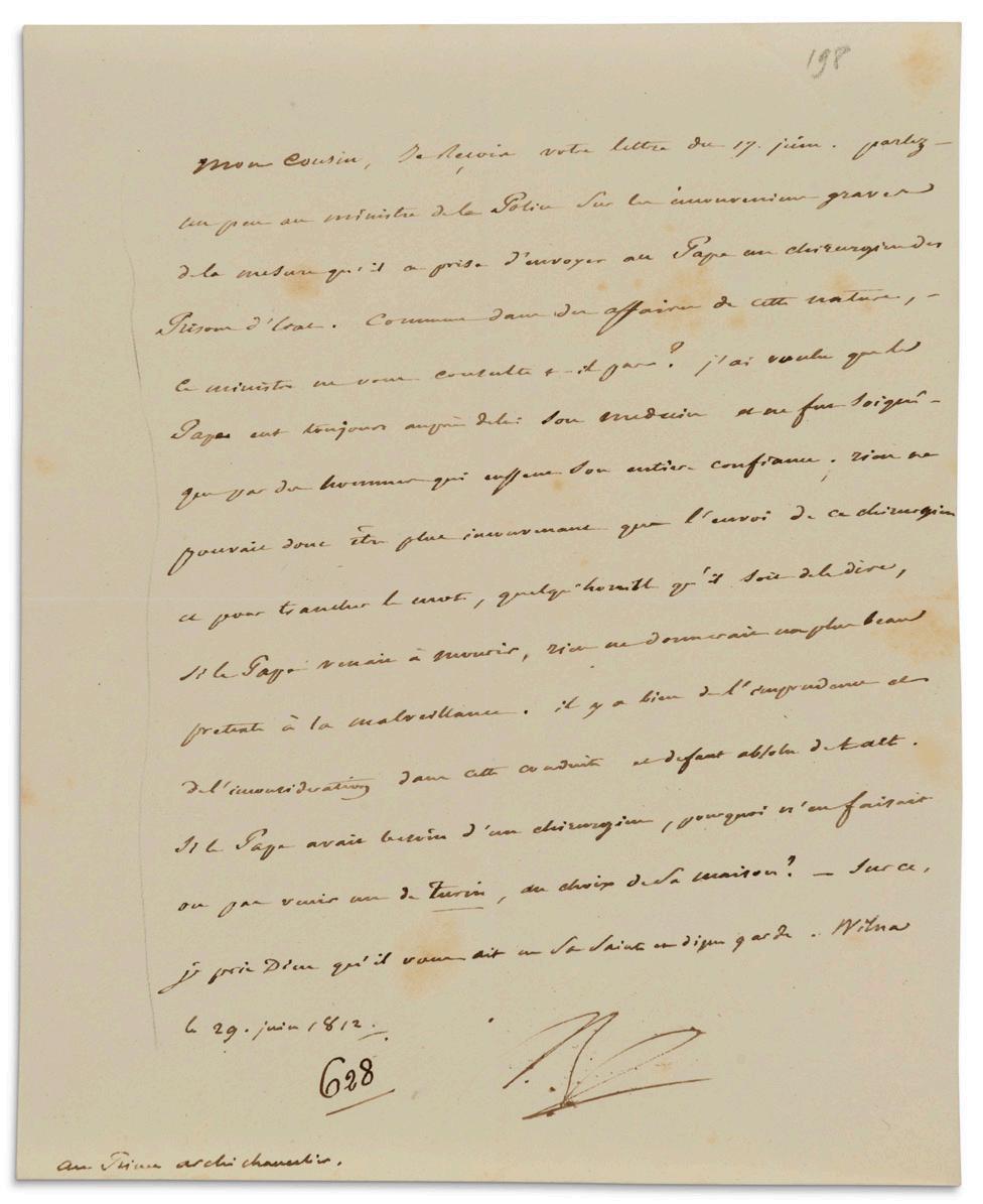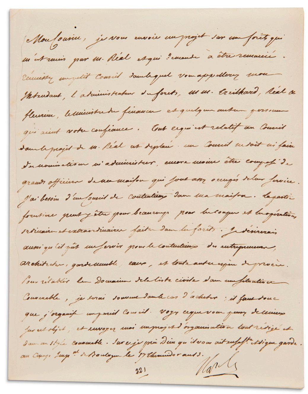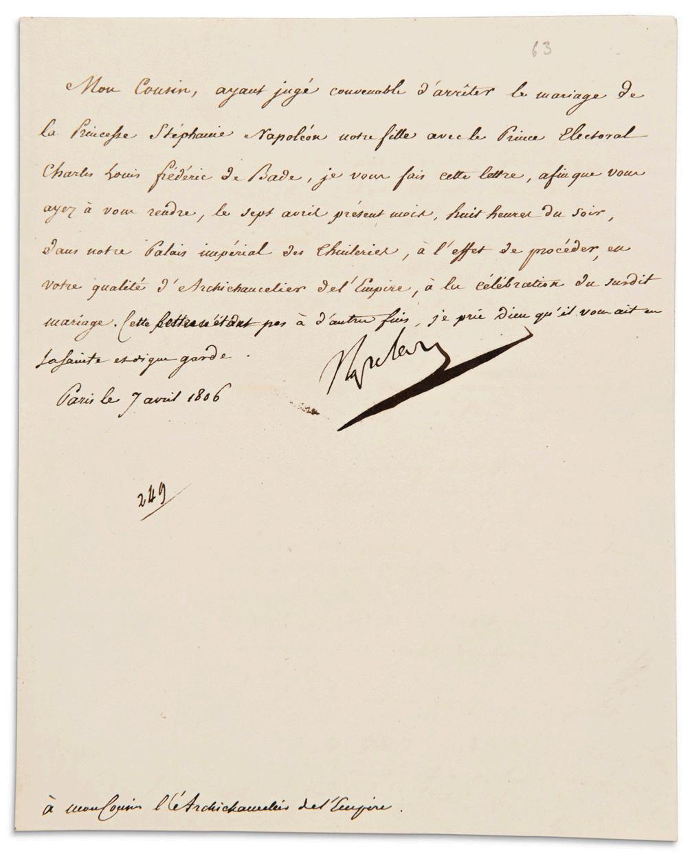 Les premières lettres sont adressées par le premier Consul Bonaparte aux deux citoyens Consuls Cambacérès et Lebrun, puis au seul Cambacérès avec lequel s’établit une relation privilégiée. Lorsque Napoléon devient Empereur, il nomme Cambacérès Archichancelier de l’Empire. Dès lors, les lettres commencent généralement par l’apostrophe « Mon cousin », l’accusé de récep tion des lettres de son correspondant, et s’achèvent par la formule : « Sur ce, je prie Dieu qu’il vous ait en sa sainte et digne garde ». Une grande partie de ces lettres ont été annotées par Cambacérès, souvent brièvement : « copier en entier », parfois un peu plus longuement.