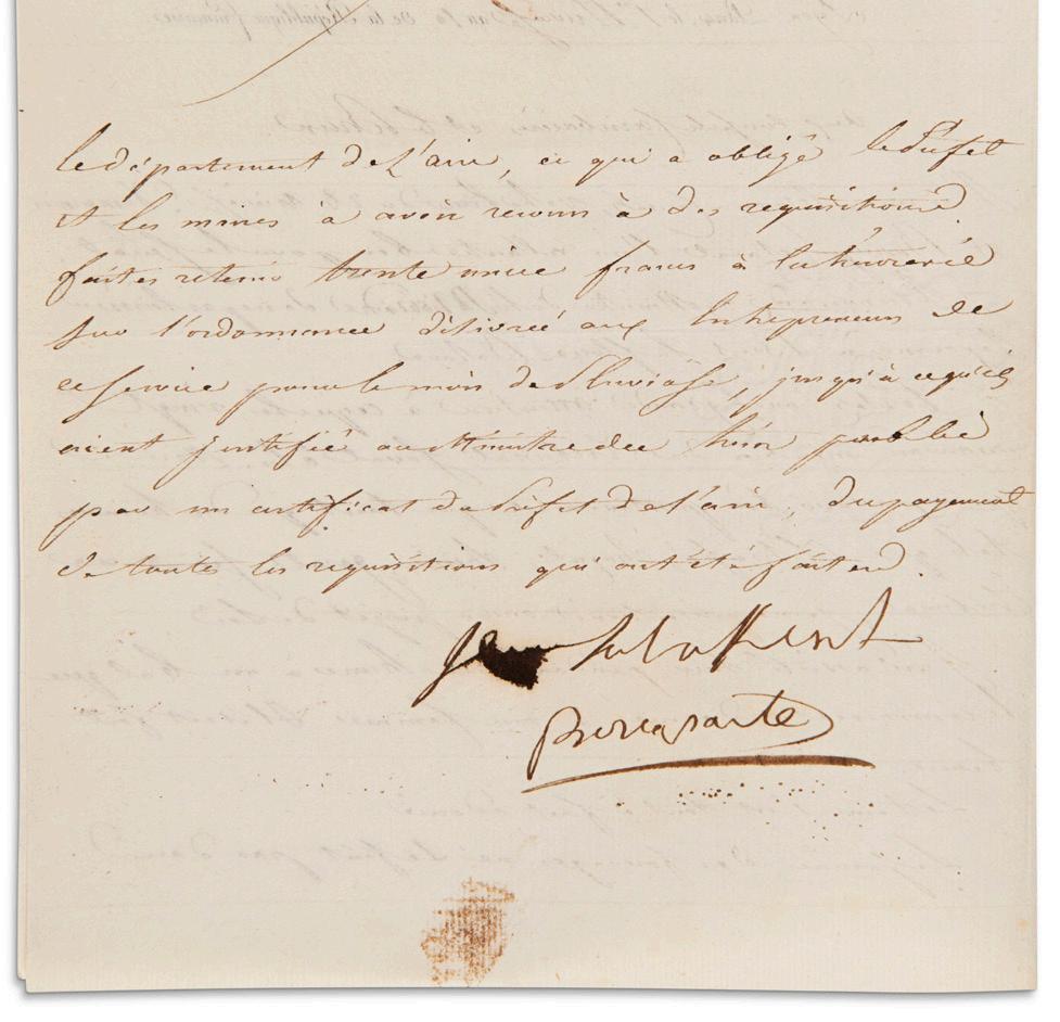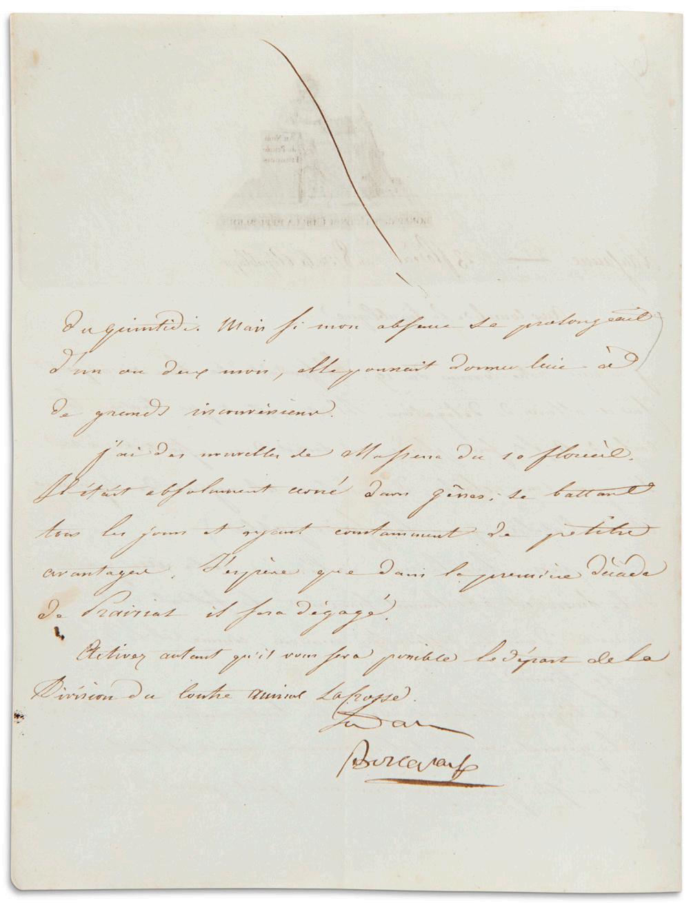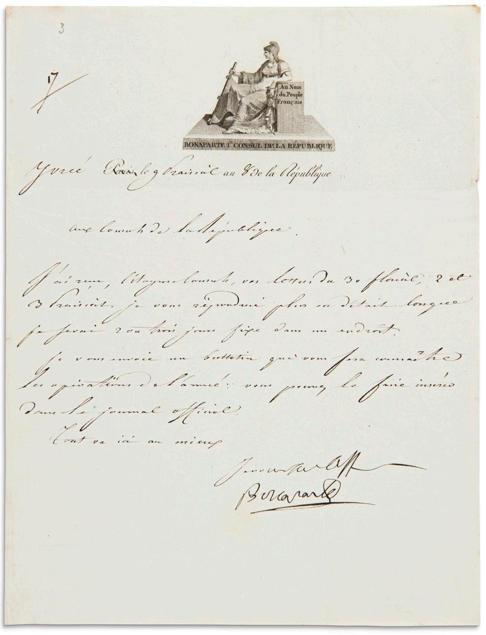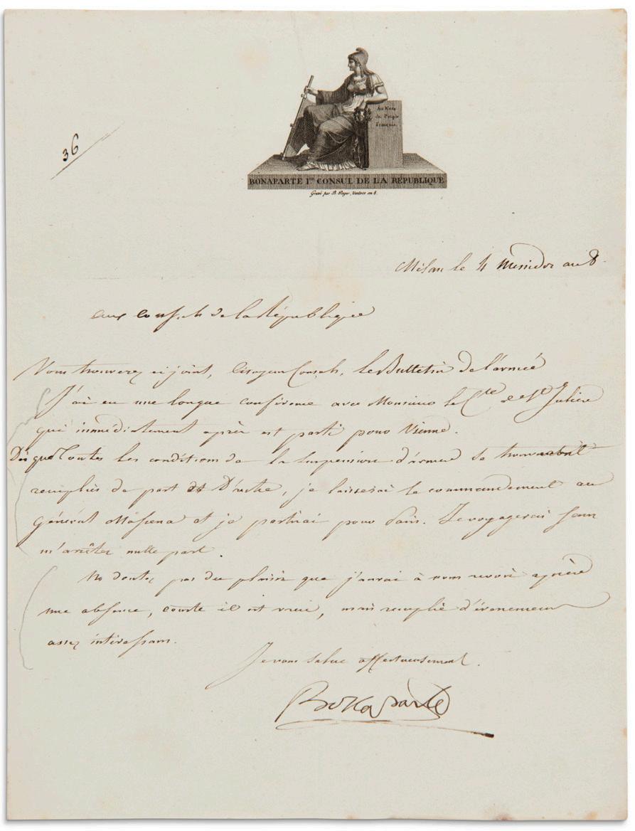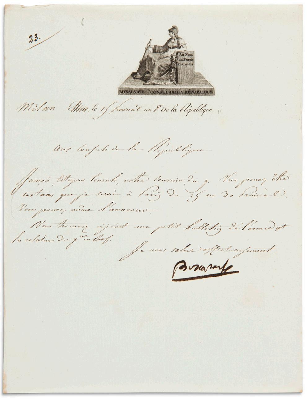 L.S. « Bonaparte », Novarre 12 prairial VIII [1 er juin 1800], « aux Consuls de la République » CAMBACÉRÈS et LEBRUN ; la lettre est écrite par Bourrienne ; ¾ page in-4, vignette gravée au nom de Bonaparte I er Consul de la République . [20]
