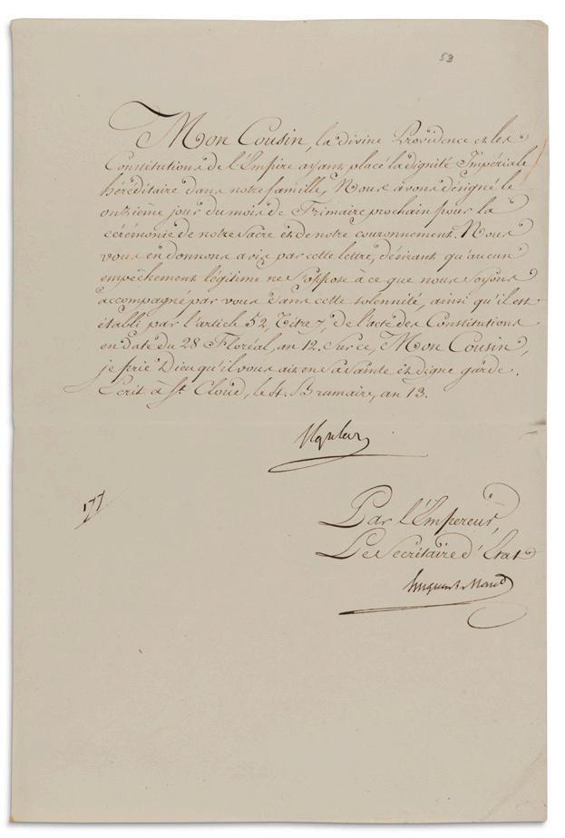 des Tuileries 20 novembre . « Mon Cousin, ayant jugé convenable de remplacer le Comte de Cessac [LACUÉE] dans ses fonctions de ministre Directeur de l’administration de la Guerre, vous vous transporterez au dit ministère, pour y recevoir le portefeuille que vous remettrez au Comte DARU, que j’ai nommé pour remplacer le Comte de Cessac »… – « Mon Cousin, ayant jugé convenable de remplacer le Duc de Massa [RÉGNIER] dans ses fonctions de Grand-Juge Ministre de la Justice, vous vous trans porterez au dit ministère, pour recevoir le portefeuille que vous remettrez au Comté MOLÉ que j’ai nommé pour remplacer le duc de Massa »…