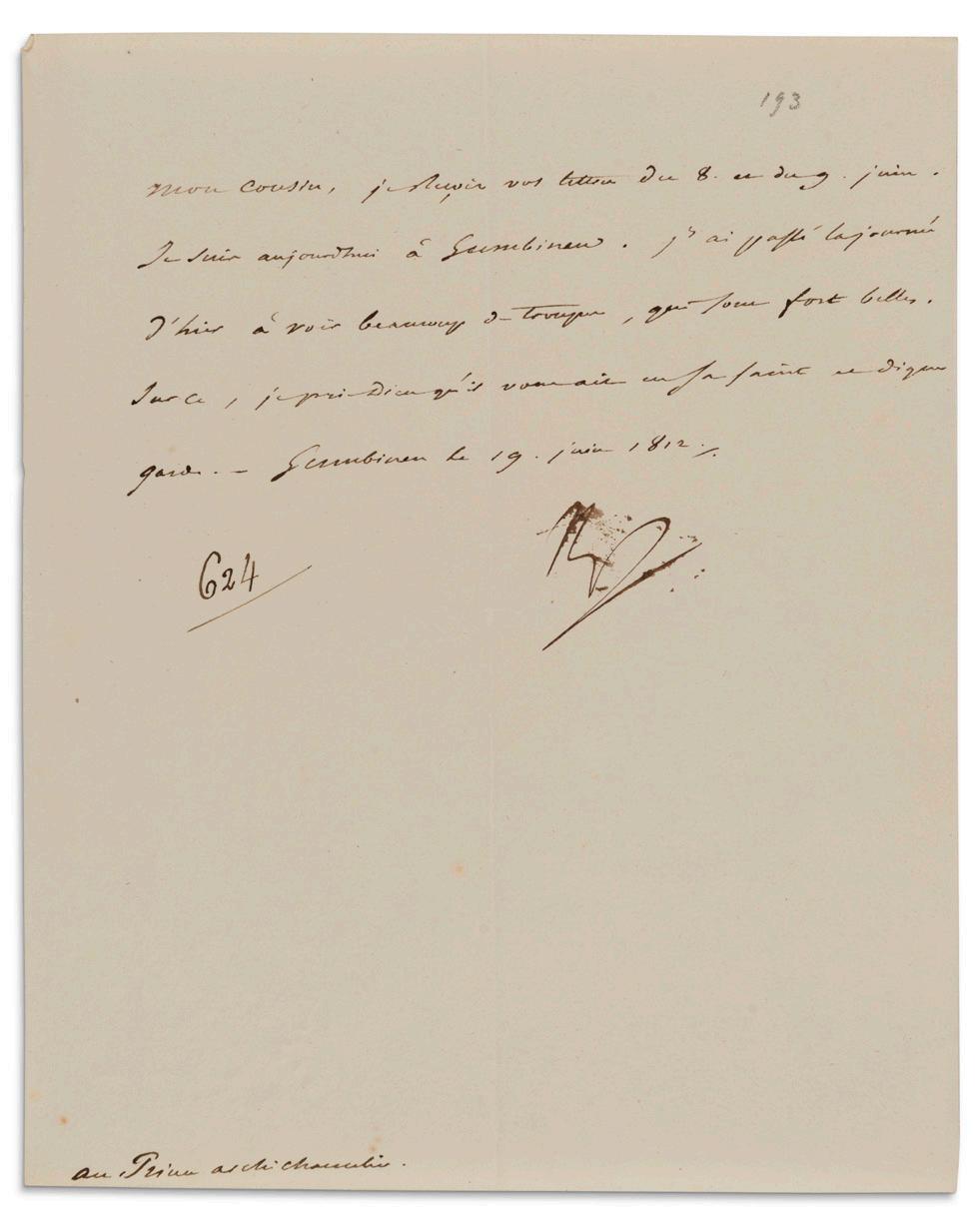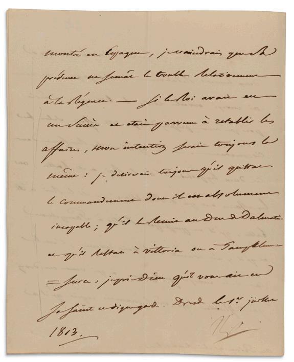 16 L.S. « Napol », « Nap » ou « NP », Dresde 15 juin-9 juillet 1813, à l’Archichancelier CAMBACÉRÈS ; 6 lettres sont écrites par Fain ; 20 pages et 6 demi-pages in-4. [711, 712, 714-724]