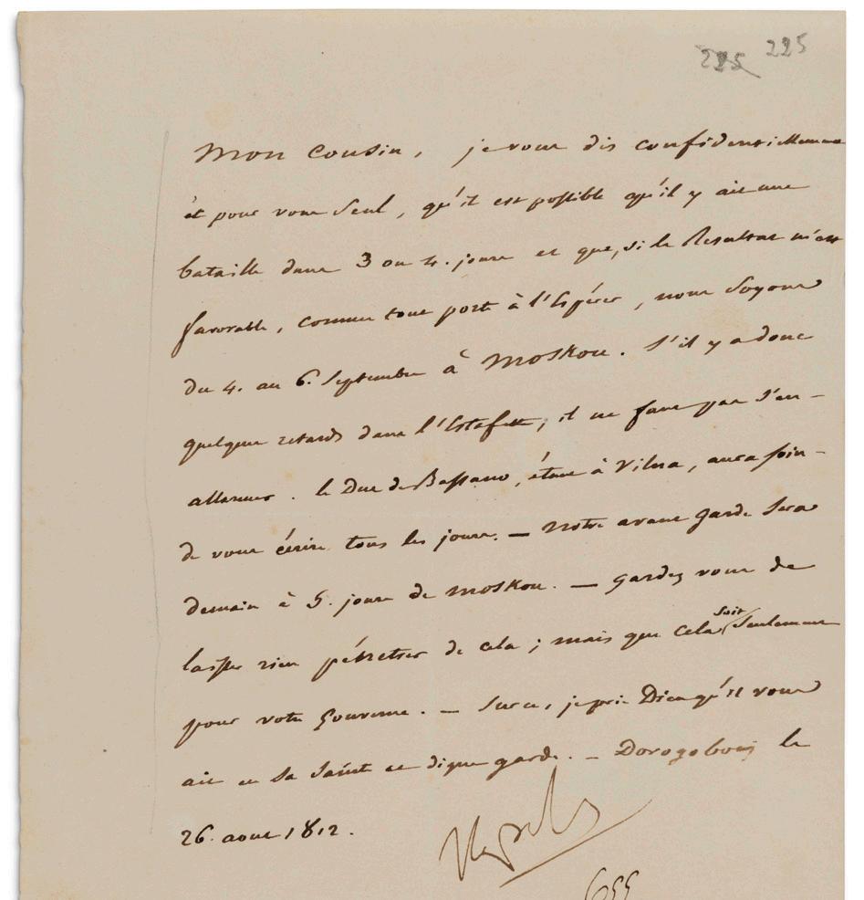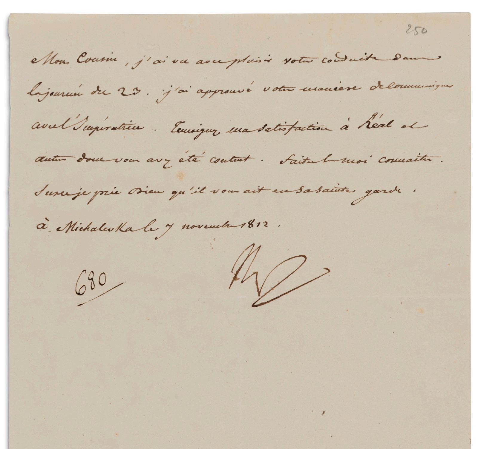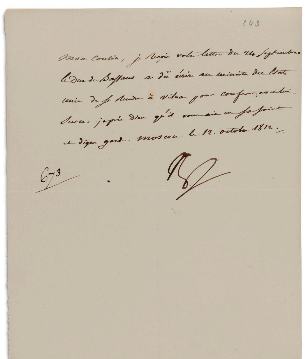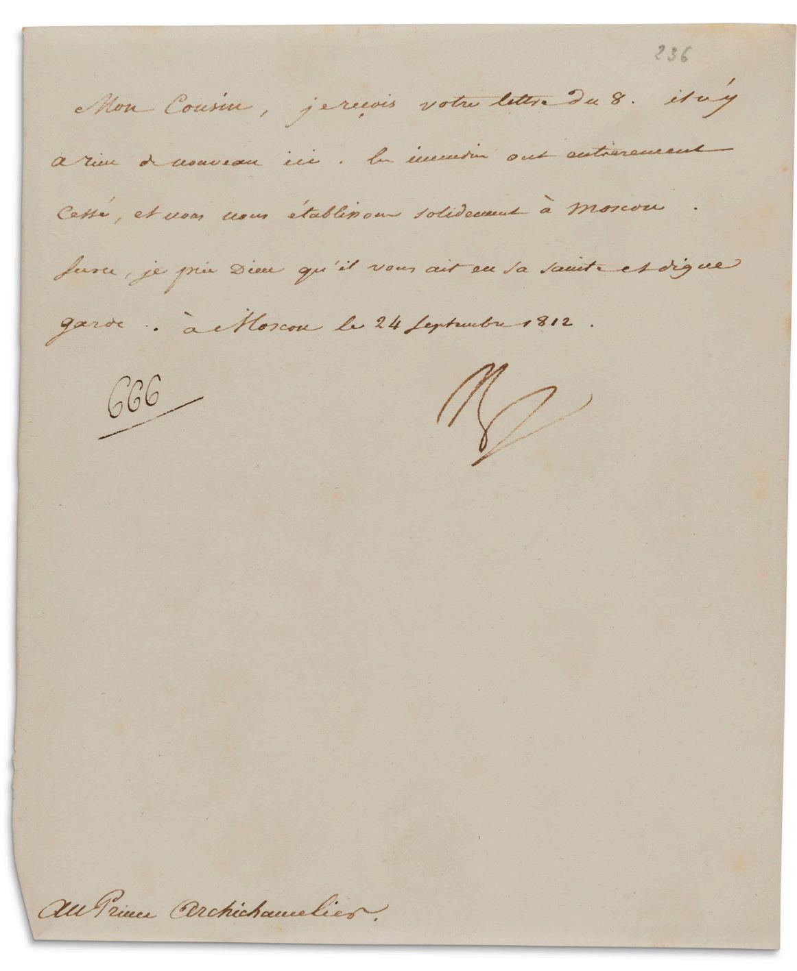 7 L.S. « Napol », « Nap » ou « NP », Moscou 3-18 octobre 1812, à l’Archichancelier CAMBACÉRÈS ; les lettres sont écrites par Méneval, sauf 2 par Fain ; 3 pages et 4 demi-page in-4. [669 675]