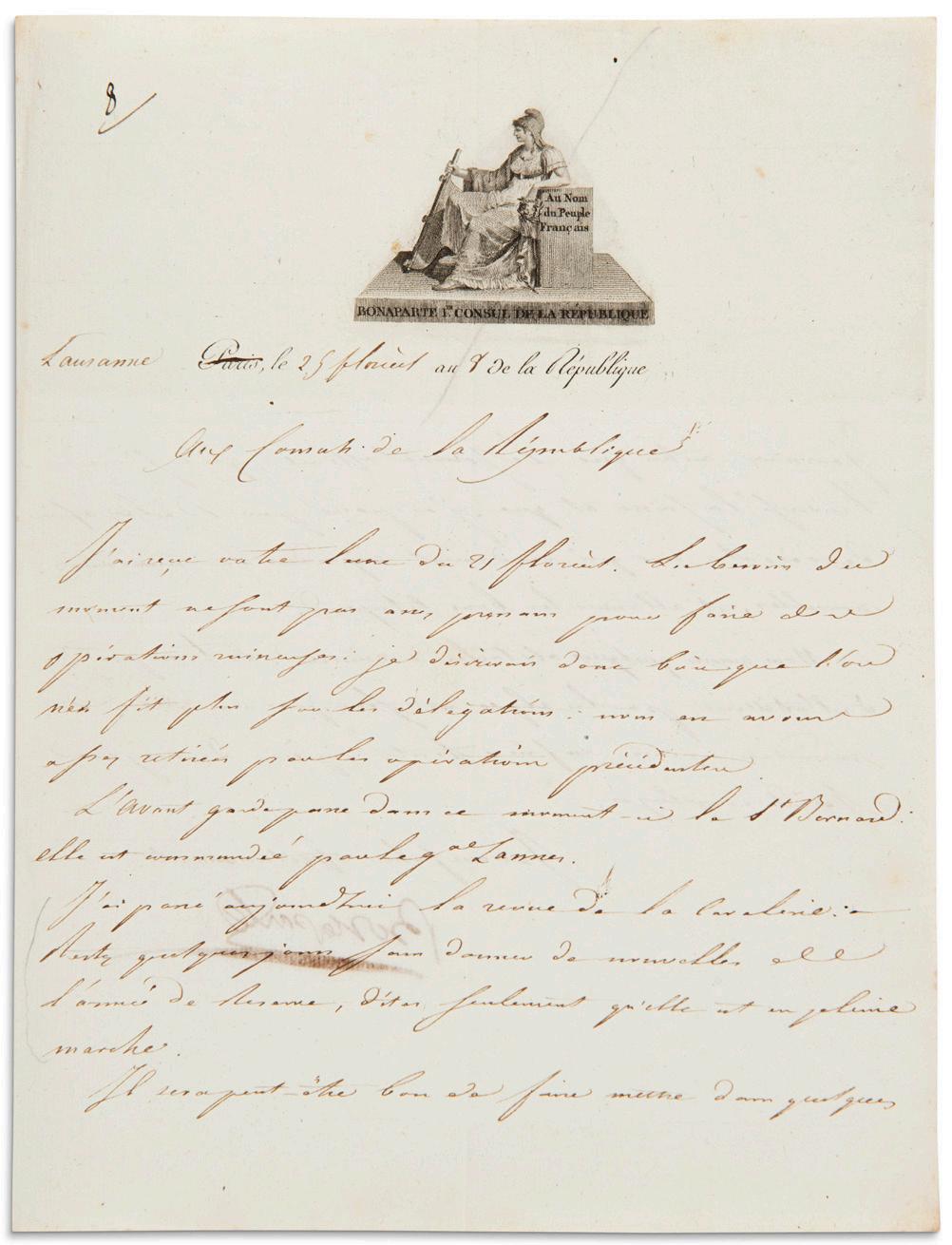 2 L.S. « Bonaparte » (la 1 re avec apostille autographe), Lausanne 23 et 24 floréal VIII [13-14 mai 1800], « aux Consuls de la République » CAMBACÉRÈS et LEBRUN ; les lettres sont écrites par Bourrienne ; 2 et 1 pages in-4, vignettes gravées au nom de Bonaparte I er Consul de la République . [6, 7]