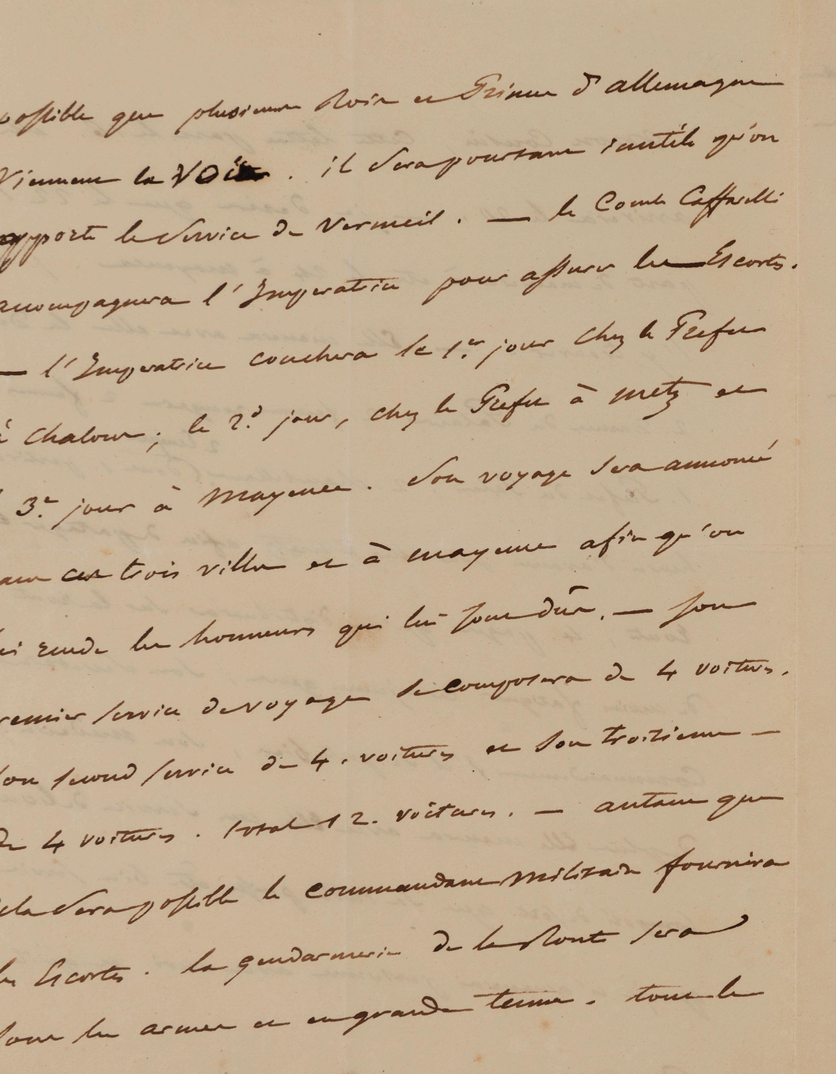 Mayence 31 juillet . « Mon Cousin, l’Impératrice compte partir le 2 août ; elle n’arrivera à Cologne que le 3 au soir : elle se propose de faire ce voyage sur le Rhin. Elle couchera probablement le 4 Aix-la-Chapelle, le 5 à Givet, le 6 à Rethel, le 7 ou le 8 à Compiègne ; elle sera donc le 9 ou le 10 à S t Cloud »… – Demande de renseignements sur un « individu qu’on voudrait que je nommasse Conseiller à vie de l’Université »… – « Je vois que le Grand Juge [Régnier duc de Massa] est de retour de son congé. Faites moi connaître quel est l’état de sa santé »… Mayence 1er août . « Je pars pour être rendu demain matin à Wurzbourg et y voir mes troupes. Je verrai demain aussi celles que j’ai à Bamberg. Je serai du 3 au 4 à Dresde. – L’Impératrice part demain pour Cologne ; elle sera de retour du 8 au 10 »… Dresde 5 août . « Mon Cousin, ce qui vient d’arriver à Bruxelles est un scan dale public. Donnez ordre sur le champ que le maire d’Anvers et les autres accusés soient retenus par mesure de haute police, et voyez avec le comte Merlin à faire casser ce jugement. Il y a prévarication. Ne pourrait-on pas intenter aux jurés un procès en prévarication, qu’on laisserait ensuite traîner en longueur ? »…Note autographe de CAMBACÉRÈS : « écrit le 11 au ministre de la police conféré le même jour avec le Cte Merlin ». Dresde 6 août . « Les négociateurs sont à Prague mais ils ne font pas grand chose. Toutes les probabilités sont à la guerre. C’est ce qu’on va voir dans peu de jours