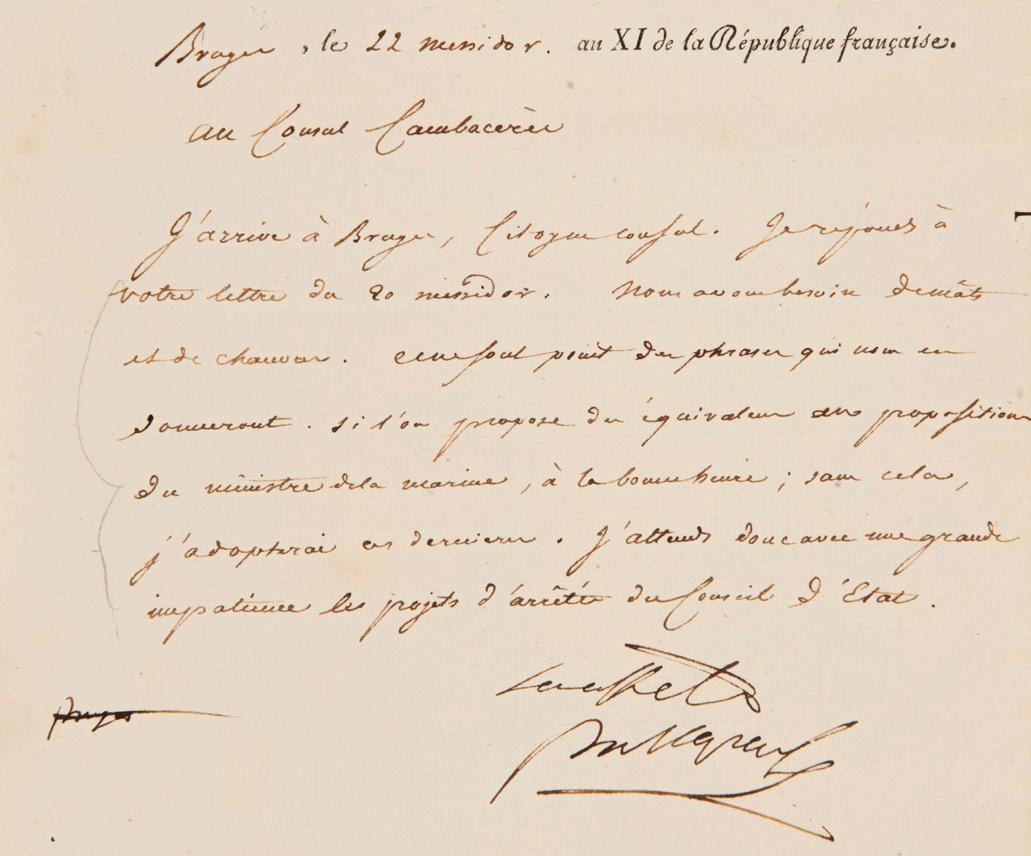 4 vendémiaire . Il désire « que vous envoyassiez chercher demain matin le Ministre de la Marine [FORFAIT], pour lui insinuer de donner sa démis sion. Vous l’assurerez que je suis satisfait de son zèle, de sa probité et de son attachement au Gouvernement. Je désire connaître le poste qui pourrait lui convenir, voulant faire quelque chose qui lui soit agréable » ; il précise que « la préfecture du second arrondissement se trouve vacante »… 18 vendémiaire [10 octobre] . Il le prie de « presser au Conseil d’État le rapport sur les obstacles qu’a éprouvés le Ministre de la police [FOUCHÉ] pour les éliminations »… 27 vendémiaire . Il le prie de « faire discuter demain au Conseil d’État si, la paix définitive avec la Russie étant faite, il ne serait pas convenable d’en instruire le Sénat et le Tribunat par des messages »…Note auto graphe de CAMBACÉRÈS : « répondu le 28, le conseil séant, qu’il était pour la négative ».