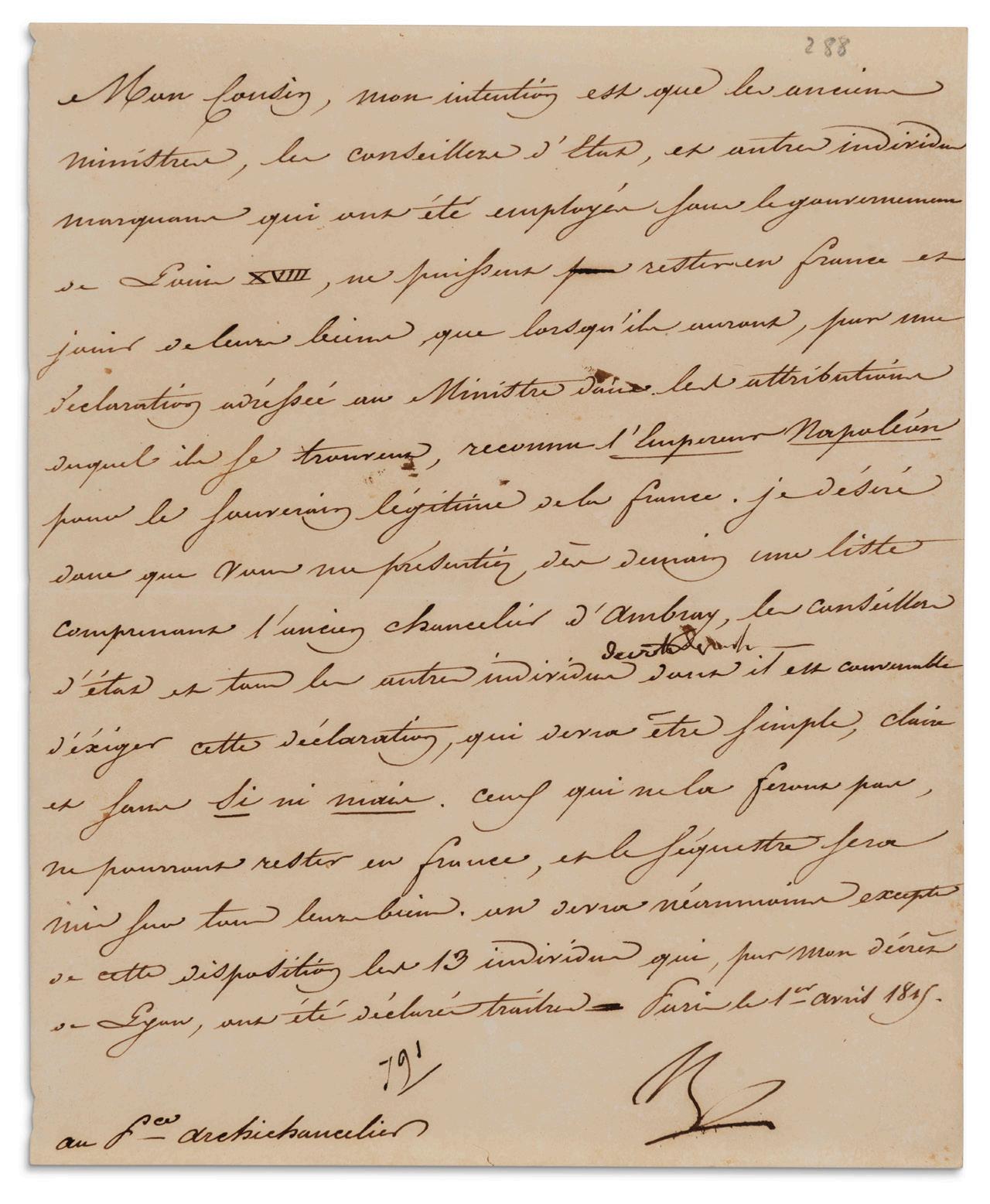 Cent-Jours ; l ’Archichancelier est également ministre de la Justice 1 er avril. « Mon cousin, mon intention est que les anciens ministres, les conseillers d’État, et autres individus marquans qui ont été employés sous le gouvernement de Louis XVIII, ne puissent rester en France et jouir de leurs biens, que lorsqu’ils auront, par une déclaration adressée au Ministre dans les attributions duquel ils se trouvent, reconnu l’Empereur Napoléon pour le Souverain légitime de la France. Je désire donc que vous me présentiez dès demain une liste comprenant l’ancien chancelier Dambray, les conseillers d’État et tous les autres individus [ addition autographe :] de votre département dont il est convenable d’exiger cette déclaration, qui devra être simple, claire et sans si ni mais. Ceux qui ne la feront pas, ne pourront rester en France, et le séquestre sera mis sur tous leurs biens. On devra néanmoins excepter de cette disposition les 13 individus qui, par mon décret de Lyon, ont été déclaré traîtres »… 8 avril. « J’ai vu avec étonnement que dans le Bulletin des loix, la formule n’est plus celle-ci : Napoléon par la grâce de Dieu et les Constitutions de l’Empire, Empereur des Français . On ne met plus que : Napoléon Empereur des Français ; d’où vient un changement aussi notable ? »… 19 mai. « Je suis dans l’intention de composer la Chambre des pairs et d’en nommer d’abord 80 membres. Désirant m’aider des lumières des personnes qui ont ma confiance, je vous invite à me remettre dimanche une liste de 120 personnes que vous choisirez comme si vous étiez