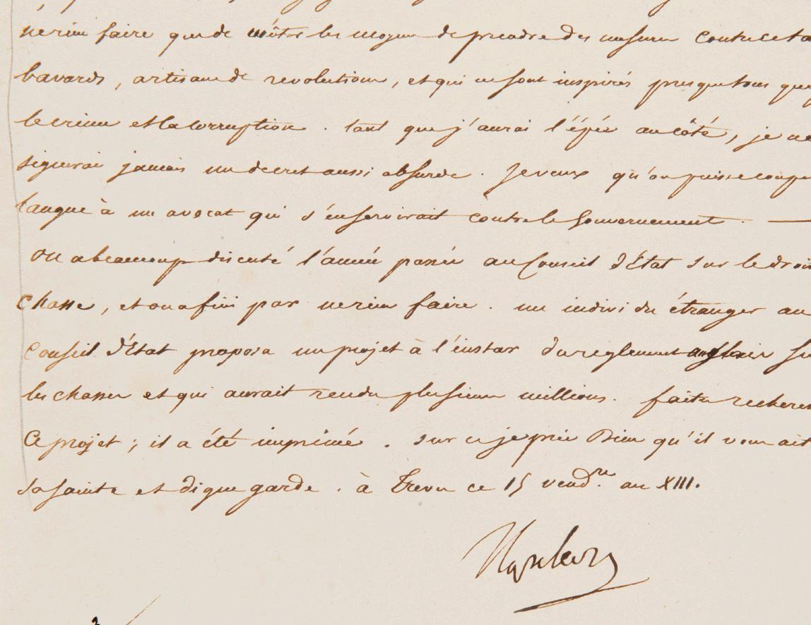 Les lettres, dictées par Napoléon, sont écrites par ses secrétaires, Bourrienne, puis Méneval et Fain principalement, puis sont signées par lui, qui parfois ajoute quelques mots ou corrige de sa main.