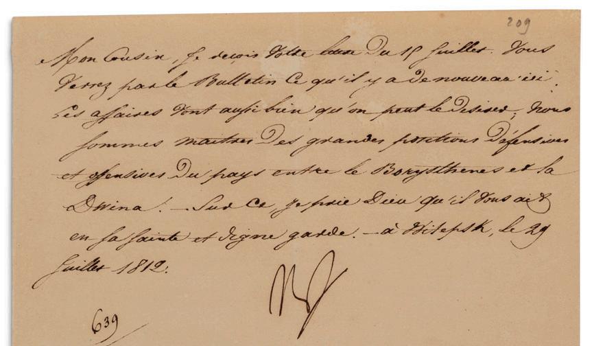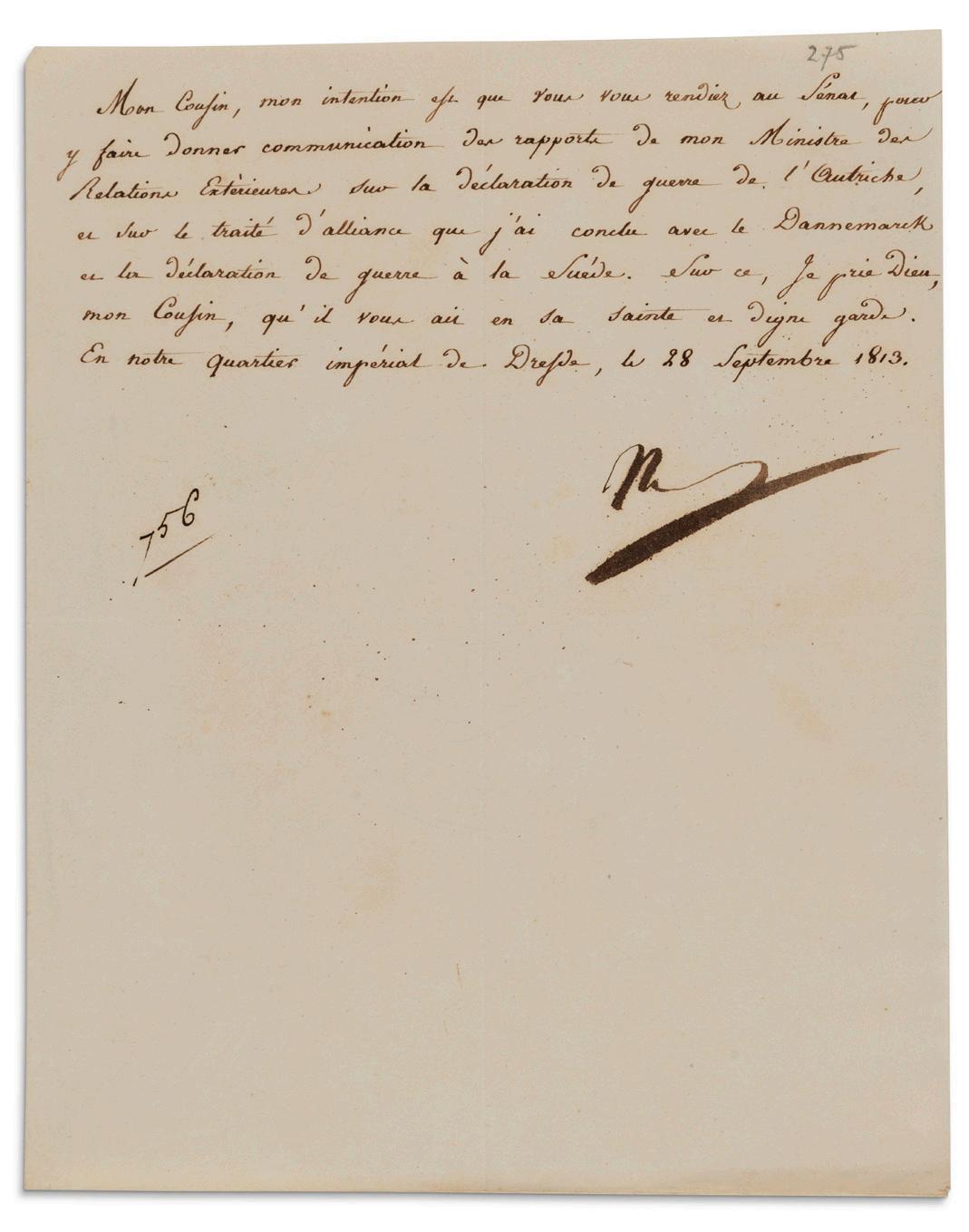 Campagne d’Allemagne, de la bataille de Dresde à celle de Leipzig Bautzen 16 août . « Si l’Impératrice passe à Rennes’, il est nécessaire que la Province en soit prévenue d’avance. Comme je n’y ai jamais été, il faudrait que l’Impératrice s’y arrêtât eux ou trois jours et qu’on fit quelque chose pour remuer la population de la Bretagne »… – « L’Autriche nous a déclaré la guerre. L’armistice est dénoncé et les hostilités commencent. Nous sommes en grandes manœuvres. Une partie de l’armée Russe et Prussienne est entrée en Bohême. J’augure bien de la campagne. –MOREAU est arrivé à l’armée Russe. JOMINI, chef d’état-major du Prince de la Moskova a déserté. C’est celui qui a publié quelques volumes sur les campagnes et que depuis longtems les Russes pourchassaient, il a cédé à la corruption. C’est un militaire de peu de valeur ; c’est cependant un écrivain qui a saisi quelques idées saines sur la guerre. Il est Suisse »… Reichenbach 18 août . « Mon Cousin, je serai ce soir à Goerlitz. Vous devez avoir reçu les communications du duc de Bassano sur la guerre d’Autriche. Je vous ai mandé ce qu’il était nécessaire de faire pour les levées de l’armée d’Espagne. Le ministre de la Guerre doit ordonner la construction de redoutes sur les points convenables, afin que le territoire de l’Empire ne soit pas attaqué. J’ai pris des mesures pour former des colonnes mobiles, afin de faire rentrer 50 000 réfractaires dont on a besoin pour compléter différens cadres »… Loewenberg 22 août. « Nous sommes ici en opération, et les affaires vont bien. Les communications du Duc de Bassano vous auront fait connaître notre situation politique, et les bulletins vous instruiront des combats qui ont déjà eu lieu et qui ont tous été à notre avantage »… Goerlitz 24 août. « Je viens de Loewenberg où j’ai battu l’armée ennemie de Silésie. Je suis entré en Bohême et me suis emparé des principaux débouchés ; mes troupes ont poussé jusqu’à 16 lieues de Prague. Je me porte actuellement sur Dresde pour attaquer les corps ennemis qui se sont portés dans cette direction. L’armée que j’ai dirigée sur Berlin doit être aujourd’hui dans cette ville. Ainsi vous voyez que les affaires sont engagées de tous côtés avec une grande activité. Je suis au centre, et l’ennemi est partout aux extrémités. J’espère bien de la disposition des choses »… Dresde 27 août au soir. « Mon Cousin, je suis tellement fatigué et tellement occupé que je ne peux pas vous écrire longuement. Le Duc de Bassano s’en charge. Les affaires vont ici fort bien »… Dresde 29 août au matin . « J’espère pouvoir vous écrire dans la journée plus en détail. J’apprends qu’en attendant le Duc de Bassano vous a envoyé des notices. Les affaires vont ici fort bien. Nous n’avons dans ce moment pas loin de 25 000 prisonniers »... Bautzen 6 septembre . « Mon Cousin, nous sommes ici toujours en mou vement. J’ai été hier à Gorlitz où j’ai chassé l’armée ennemie de Silésie au-delà de la Neisse. Je serai probablement ce soir à Dresde »… Hartau 24 septembre . « Je suppose que vous avez reçu les pièces du Duc de Bassano sur la déclaration de guerre de l’Autriche ».. Dresde 28 septembre . « Mon Cousin, mon intention est que vous vous rendiez au Sénat pour y faire donner communication des rapports de mon ministre des Relations extérieures sur la déclaration de guerre de l’Autriche, et sur le traité d’alliance que j’ai conclu avec le Dannemarck et la déclaration de guerre à la Suède »… Wurzen 9 octobre . – Lettre non signée. « Dans la position actuelle de mes armées, le M al S t Cyr est à Dresde, le Roi de Naples [Murat] sur la haute Mulde. Je manœuvre avec le reste de mon armée pour faire lever le siège de Wittenberg que l’ennemi attaque. Il est possible que cela donne lieu à une bataille dont je tiens le succès pour certain, et qui aurait une grande influence sur les affaires. Le tems est malheureusement fort mauvais. Le Pce de Neuchâtel [Berthier] se rétablit. Ma santé est par faite »… – Lettre en partie chiffrée, non signée (avec sa transcription en clair). « Le Roi de Westphalie [Jérôme] a quitté Cassel d’une manière ridicule. 2 500 Cosaques ont fait tout ce tapage. Si le Roi n’avait pas éparpillé 7 à