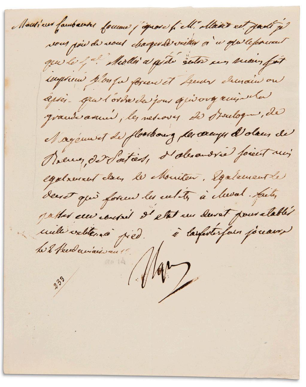 28 nivôse. Il vient de « recevoir la députation de Bordeaux. Elle m’a remis une pétition pour me solliciter de me rendre dans leur ville, ce que je leur ai promis de faire lorsque leurs relations avec les Antilles et l’Ile de France seraient en pleine activité ». Au sujet des délibérations du Sénat, il faut veiller « à ce qu’on nous débarrasse exactement des vingt et des soixante mauvais membres qui sont dans les autorités constituées. La volonté de la Nation est que l’on n’empêche point le Gouvernement de faire le bien et que la tête de Méduse ne se montre plus dans nos tribunes ni dans nos assemblées. La conduite de SIEYÈS dans cette circonstance prouve parfaitement qu’après avoir concouru à la destruction de toutes les Constitutions depuis 1791, il veut encore s’essayer contre celle-ci. Il est bien extraordinaire qu’il n’en sente pas la folie. Il devrait faire brûler un cierge à Notre-Dame, pour s’être retiré de la Révolution d’une manière si heureuse et si inespérée. Mais plus je vieillis et plus je m’apperçois que chacun doit remplir son destin ». IL espère que les mesures sont prises « pour démolir le Châtelet ». Le ministre de la Marine peut se servir des frégates du Roi de Naples : « Il serait même bon qu’il les fît partir le plutôt possible pour l’Amérique. Tout s’arrangera après avec le Roi de Naples. […] Le gal JOURDAN est arrivé aujourd’hui du Piémont ; il me rend un compte assez satisfaisant de cette Province. Les opérations de la Consulte avancent : les lois organiques se rédigent. J’ai conféré une partie de la matinée avec les Préfets »… Note autographe de Cambacérès en tête. 30 nivôse. Il donne des ordres pour faire « vérifier la comptabilité du payeur et principaux receveurs des départements » des 13 e et 16 e divisions militaires, après des plaintes concernant des retards dans le paiement aux officiers des indemnités de fourrage et de logement…Il s’inquiète aussi du paiement « des six millions que nous doit la Batavie »… 30 nivôse. Il a visité des ateliers, et a été « satisfait de la sévère économie dont j’ai cru voir que la fabrique de Lyon use envers ses ouvriers ». Il a repoussé la parade au 15 pluviôse, « les troupes de l’armée d’Orient n’étant pas encore habillées » ; lorsqu’elles le seront toute, cela « présentera un coup d’œil satisfaisant ». Il se réjouit de l’arrêté sur la démolition du Châtelet. Il ordonne de débloquer des fonds pour aider la population en ces temps rigoureux, par des « ateliers extraordinaires », et la distribution de bois ; « et si le froid redevenait rihoureux, il faudrait comme en 89 faire allumer des feux dans les églises et autres grands établissements, pour faciliter à beaucoup de monde les moyens de se chauffer. Je compte être à Paris dans le courant de la décade ». Il s’inquiète d’un formulaire « inconcevable » que le cardinal Caprara exige des prêtres…