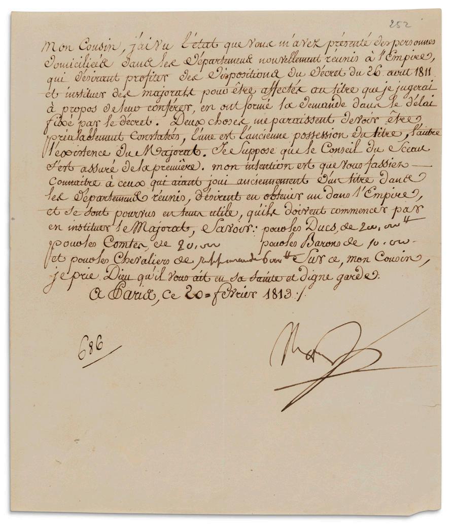 Fontainebleau 23 janvier. « Mon Cousin, je vous renvoye cette lettre. Vous auriez dû la lire avant de me l’envoyer ; vous auriez vû qu’elle était d’un fou »…On joint la lettre anonyme en question, du 20 janvier, adressée « A Sa Majesté Napoléon […] pour l’informer d’un complôt qui l’intéresse » : « La France entière te témoigne sa reconnaissance de ce que ta clémence a bien voulu épargner les réformés ; le bruit sourt qui sen est répendu a fait dissoudre la plus affreuse des Révolutions. 500 jeunes gens après s’être unis par la coupe de sang qu’ils ont bue avaient juré qu’ils se disputeraient jusqu’au dernier mourant la gloire de ta mort »… Etc. Paris 20 février. « Mon Cousin, j’ai vu l’état que vous m’avez présenté des personnes domiciliées dans les départemens nouvellement réunis à l’Empire qui désirant profiter des dispositions du décret du 26 août 1811 et instituer des majorats pour être affectés au titre que je jugerai à propos de leur conférer, en ont formé la demande […] Deux choses me paraissent devoir être préalablement constatées, l’une est l’ancienne possession du titre, l’autre l’existence du Majorat. Je suppose que le Conseil du Sceau s’est assuré de la première. Mon intention est que vous fassiez connaître à ceux qui aiant joui anciennement d’un titre dans les départemens réunis, désirent en obtenir un dans l’Empire, et se sont pourvus en tems utile, qu’ils doivent commencer par en instituer le Majorat, savoir : pour les Ducs de 200,000 ff, pour les Comtes de 20,000, pour les Barons de 10,000, et pour les Chevaliers de justifier revenu de 6000 ff »… Le secrétaire avait laissé des blancs, les sommes (en gras) ont été ajoutées par Napoléon de sa main.