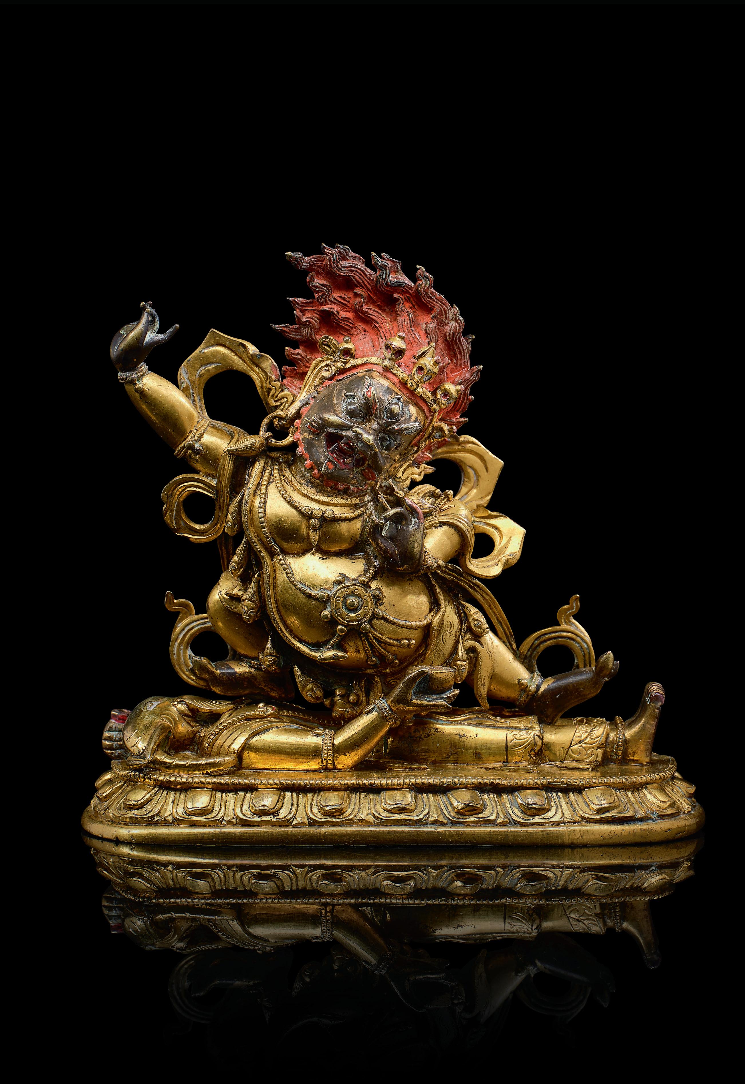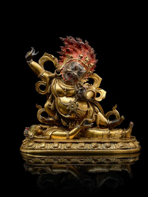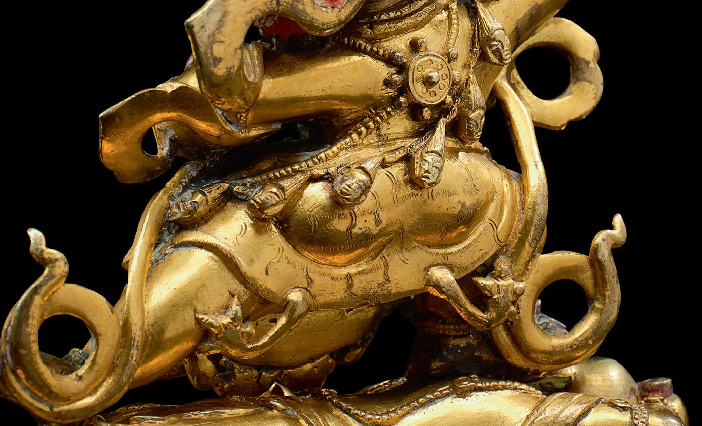 A gilt-bronze figure of Vajrapani, in his wrathful form, standing in pratyalidhasana on a lotus base, trampling an elephant-headed demon holding a kapala, the right hand originally brandishing a vajra, the left hand in karana mudra. The fierce face, framed by a mane of flaming orange hair and crowned with skulls, dressed in tiger skin and a long floating scarf, adorned with numerous jewels, a snake and a long necklace of severed heads around the neck. The sealed base is incised with a double vajra. H. 12.5 cm
