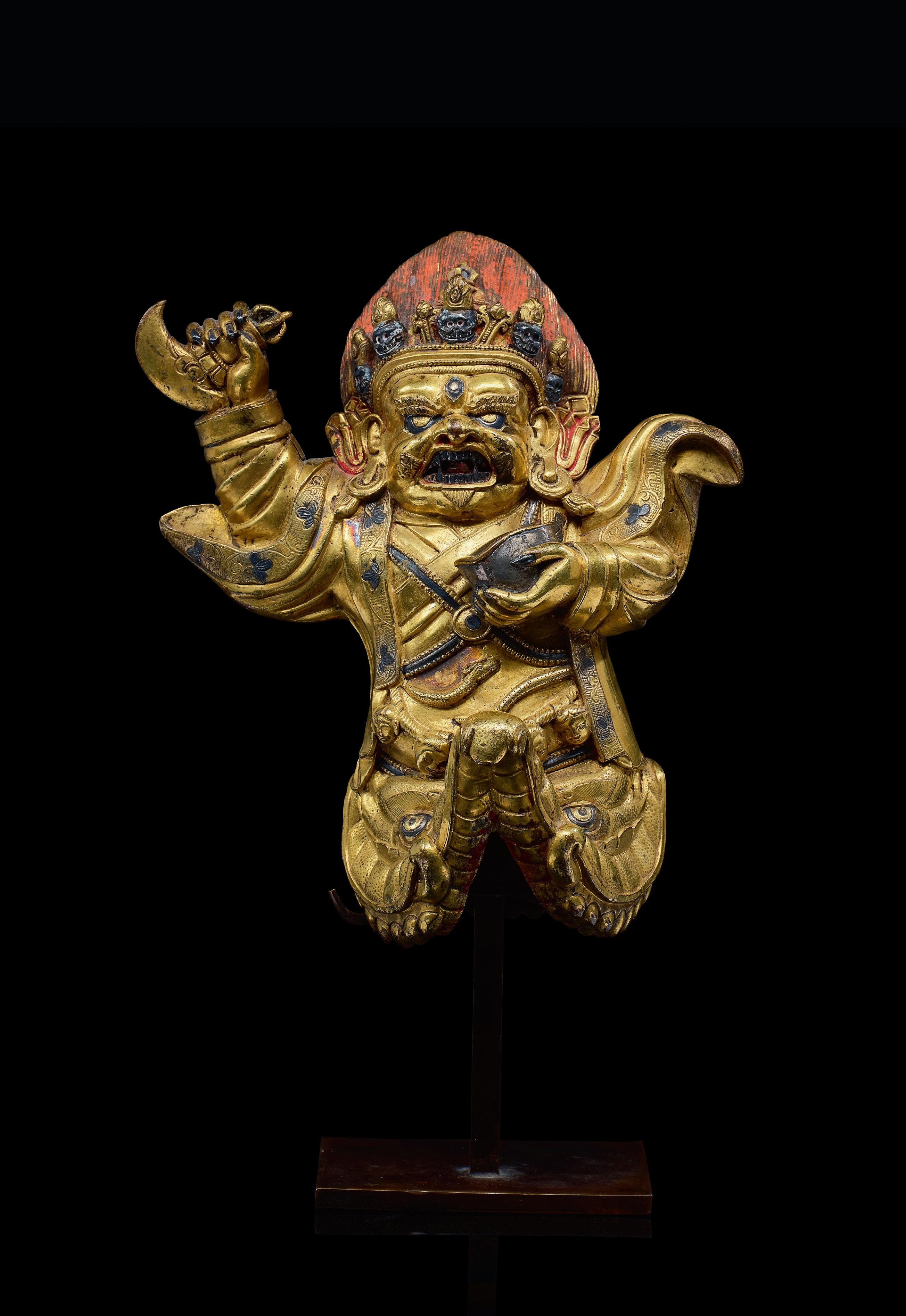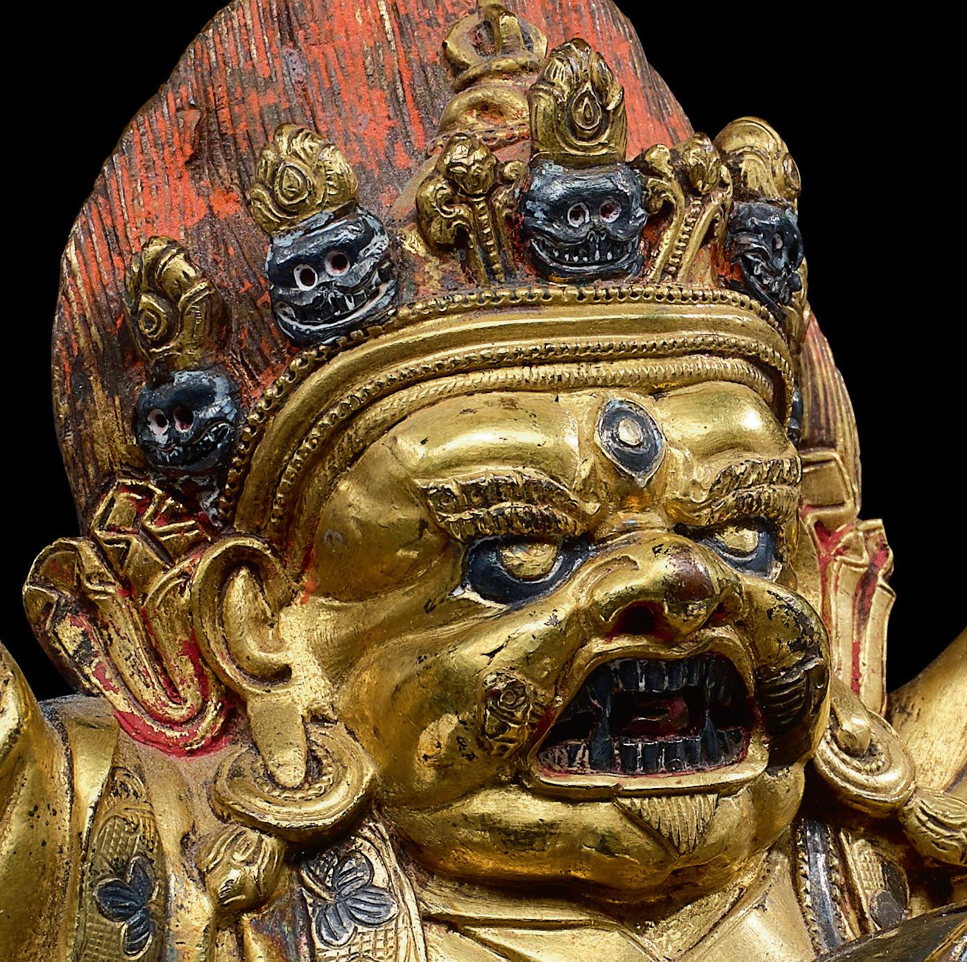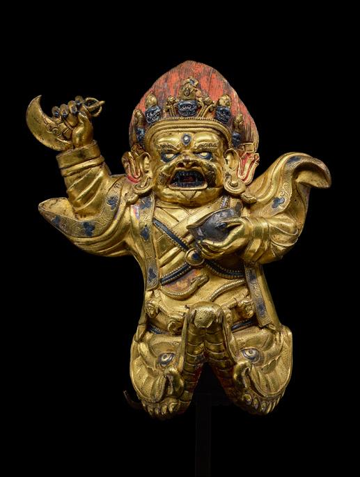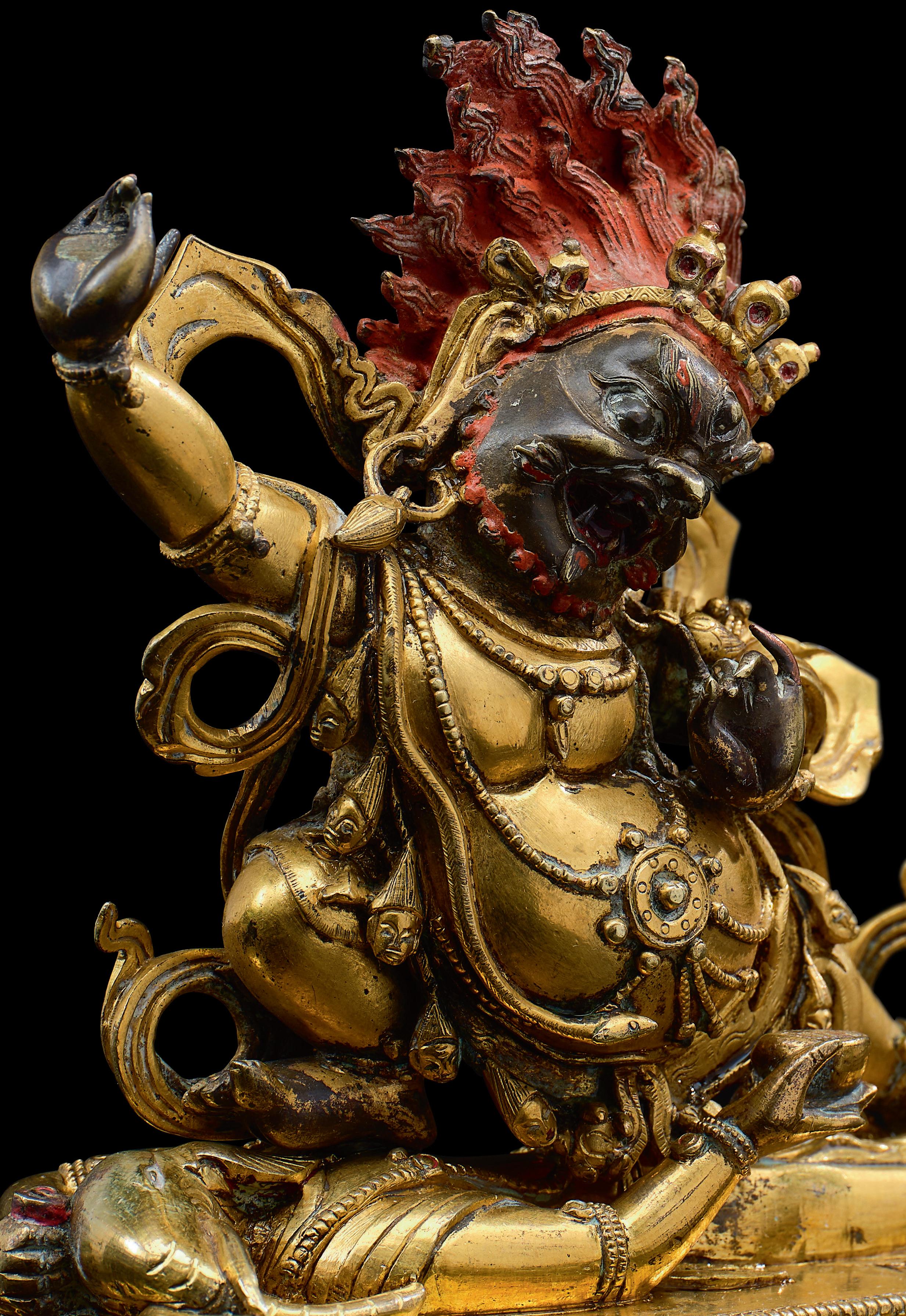 A gilt-bronze figure of Vajrapani, in his wrathful form, standing in pratyalidhasana on a lotus base, trampling an elephant-headed demon holding a kapala, the right hand originally brandishing a vajra, the left hand in karana mudra. The fierce face, framed by a mane of flaming orange hair and crowned with skulls, dressed in tiger skin and a long floating scarf, adorned with numerous jewels, a snake and a long necklace of severed heads around the neck. The sealed base is incised with a double vajra. H. 12.5 cm