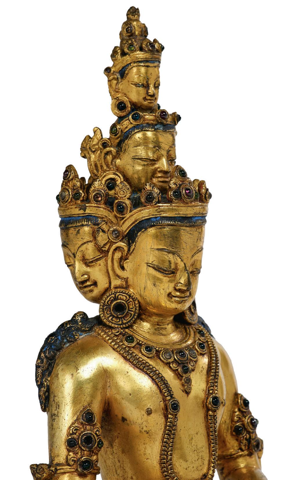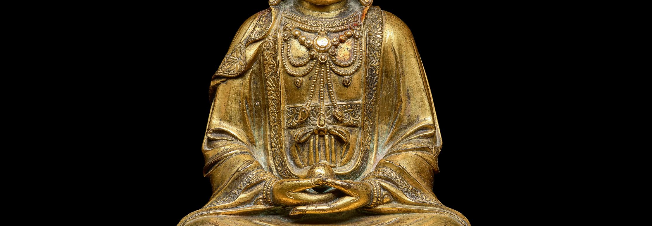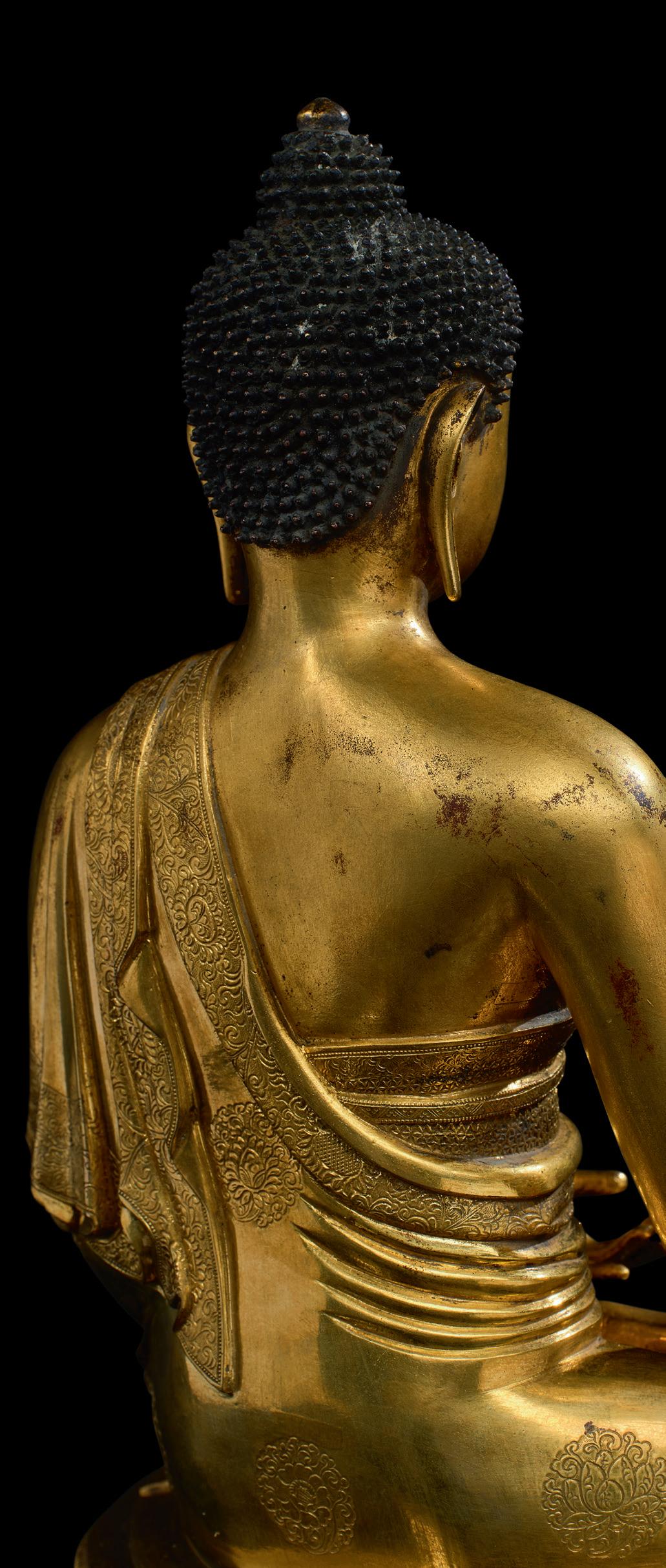 In this context, gilt-bronze statues of Buddhist deities proliferated in private palace chapels, imperial temples, and religious centres such as the Yonghegong in Beijing. Qing Buddhist bronzes are characterised by their highly refined style, often drawing upon 15 th -century Tibetan models while being adapted to the aesthetic preferences of the Manchu court. The bronzes vary in scale—from small devotional figures for private worship to monumental statues several metres high—but always adhere to standardised iconography and exhibit a luxurious finish.
