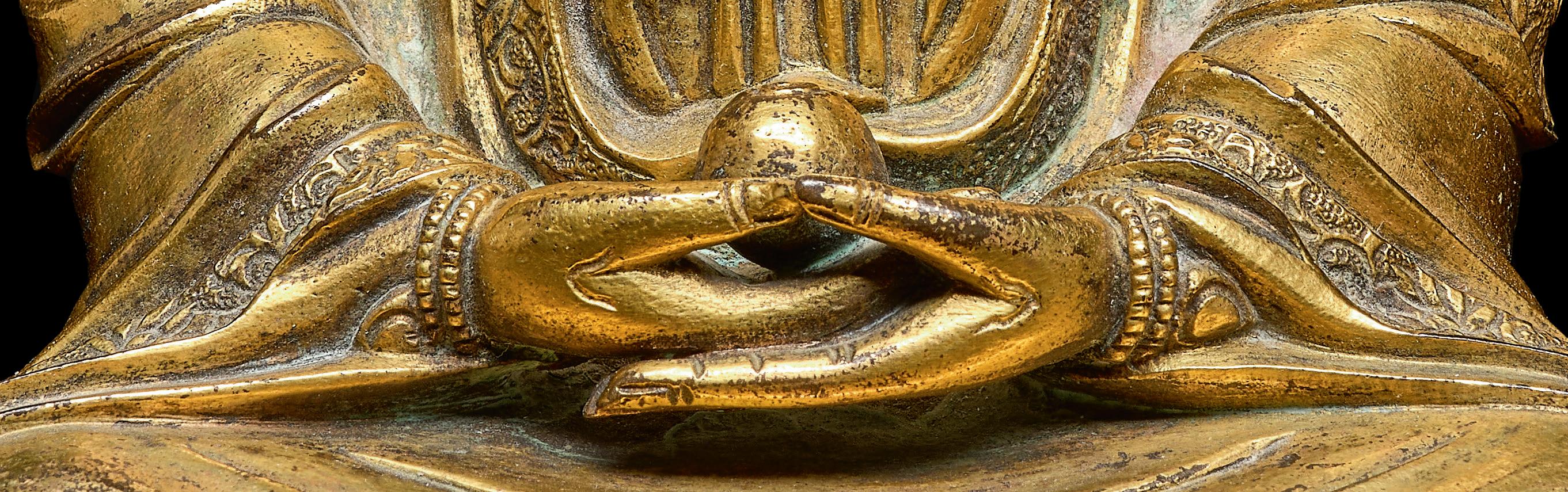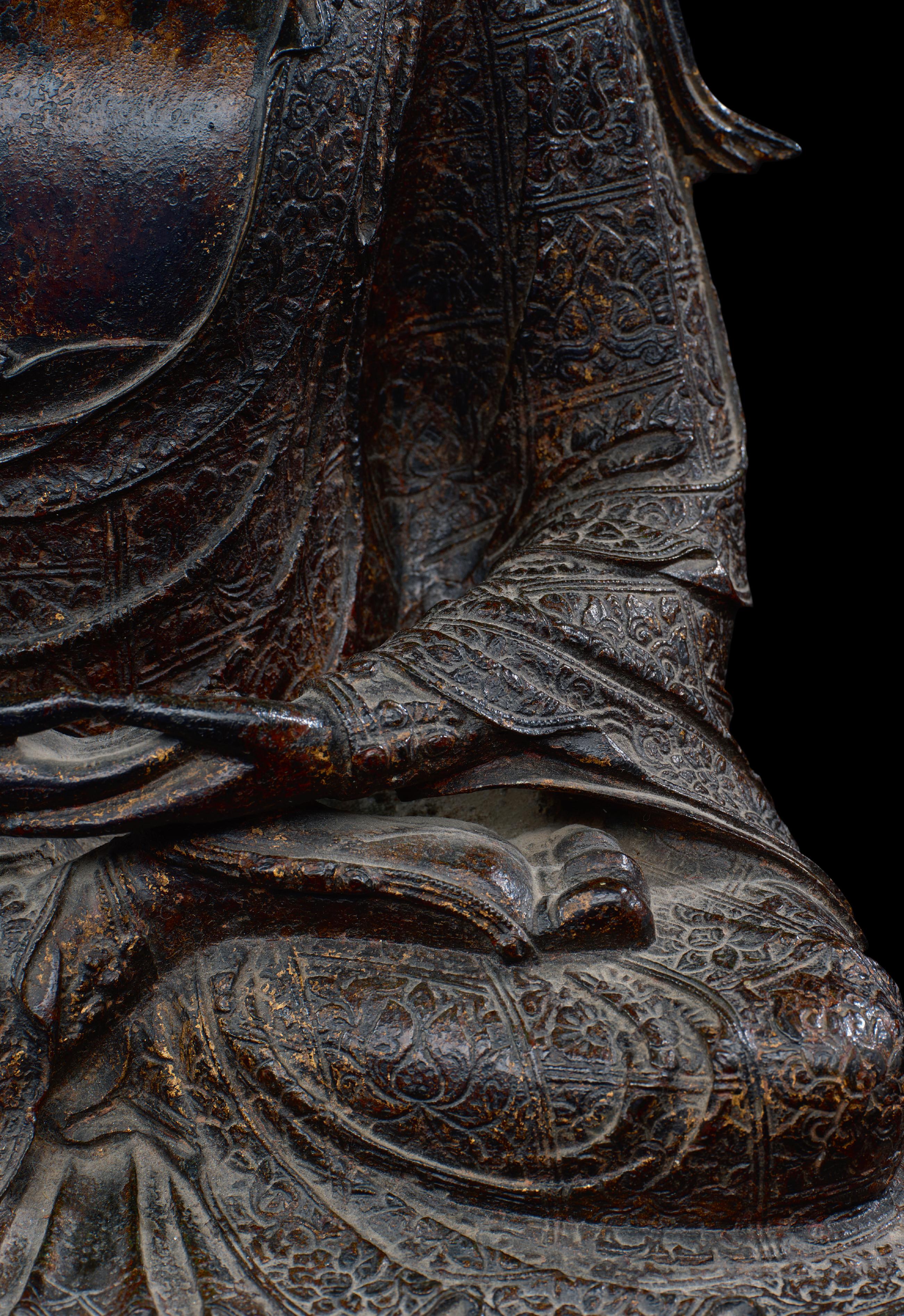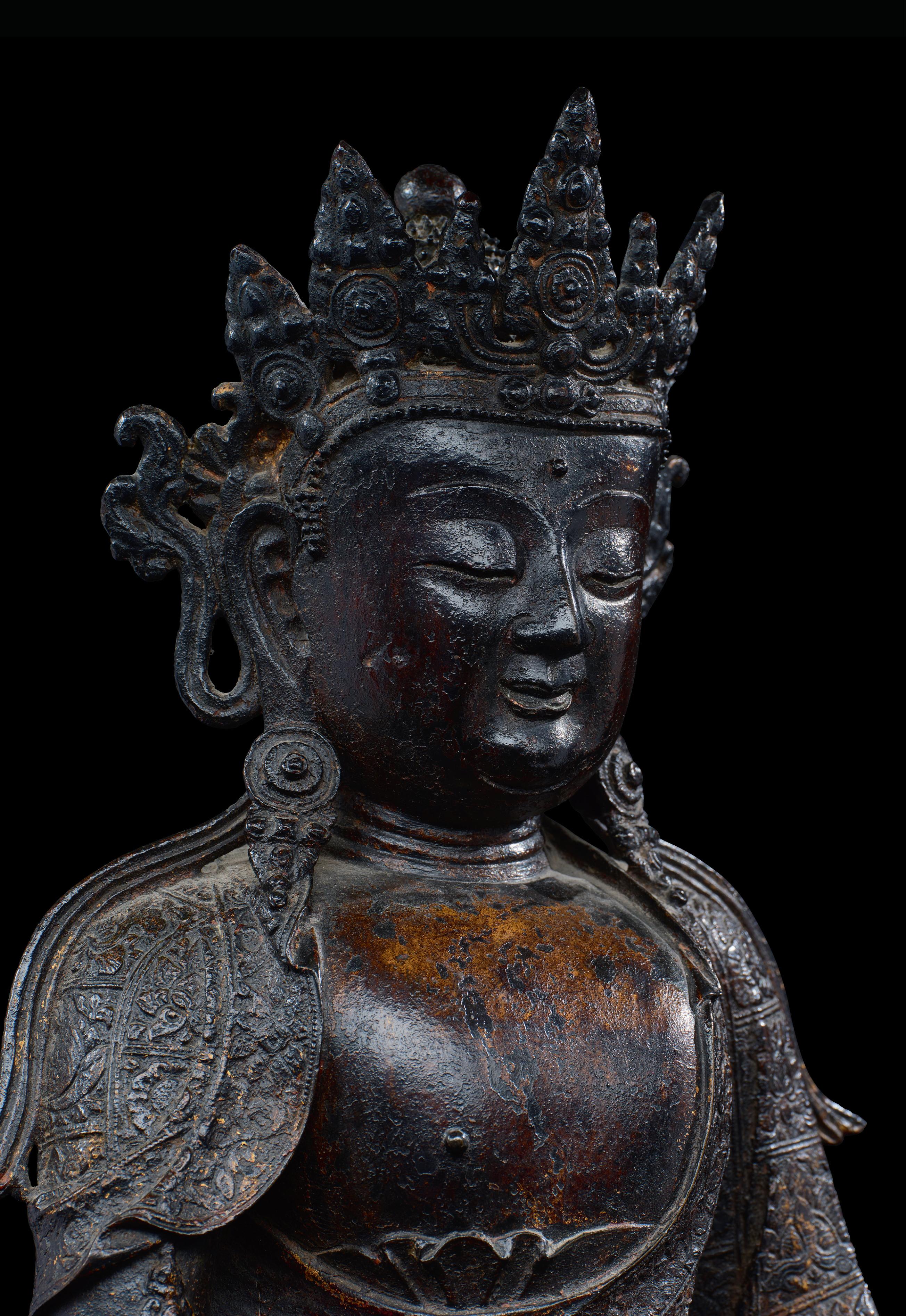 In this context, gilt-bronze statues of Buddhist deities proliferated in private palace chapels, imperial temples, and religious centres such as the Yonghegong in Beijing. Qing Buddhist bronzes are characterised by their highly refined style, often drawing upon 15 th -century Tibetan models while being adapted to the aesthetic preferences of the Manchu court. The bronzes vary in scale—from small devotional figures for private worship to monumental statues several metres high—but always adhere to standardised iconography and exhibit a luxurious finish.