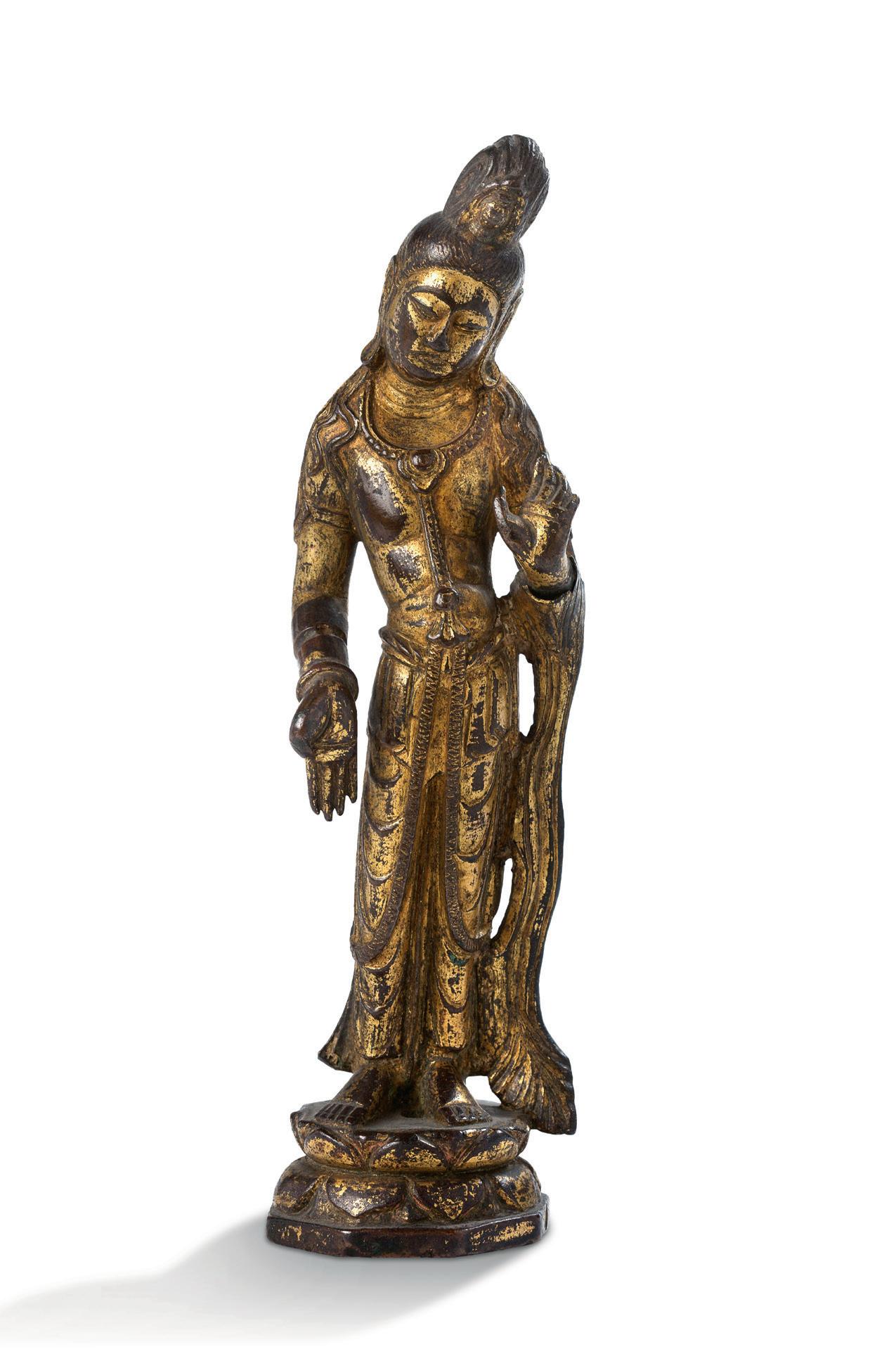 Après une période de transition sous la dynastie Sui, la sculpture bouddhique de la dynastie Tang évolue vers une expression plus réaliste permise par l’ouverture aux influences étrangères et la reprise des échanges avec le monde indien, notamment lors des voyages de moines chinois en Inde entre le IVe et le I X e siècle. Les sculptures Tang adoptent les corps souples et harmonieux, les drapés fluides et les visages aux expressions sereines, caractéristiques de la période Gupta. Cependant, l’art Tang intègre ces éléments dans un style plus robuste et réaliste, avec une attention particulière aux détails ornementaux et aux textures. Les artistes privilégient alors la grande statuaire en pierre et la peinture d’immenses fresques, au sein de grands complexes bouddhiques, à la fois temples et monastères où affluent des fidèles venus de tous les horizons. Le travail du bronze, médium traditionnel en Chine, maîtrisé depuis 2000 avant J.-C., est également privilégié mais pour de plus petites pièces destinées à la dévotion privée, dans une société Tang toujours en mouvement.