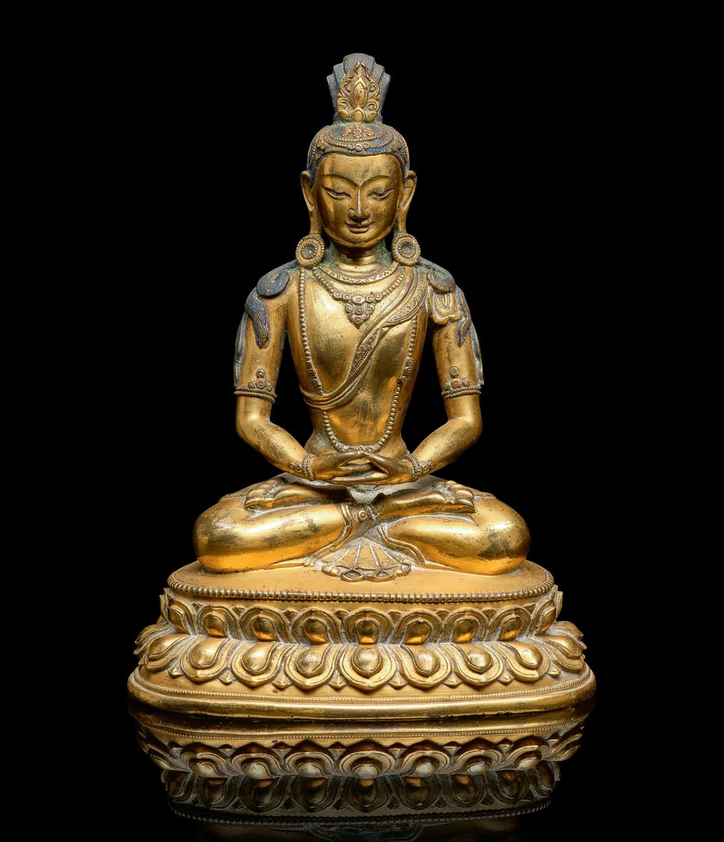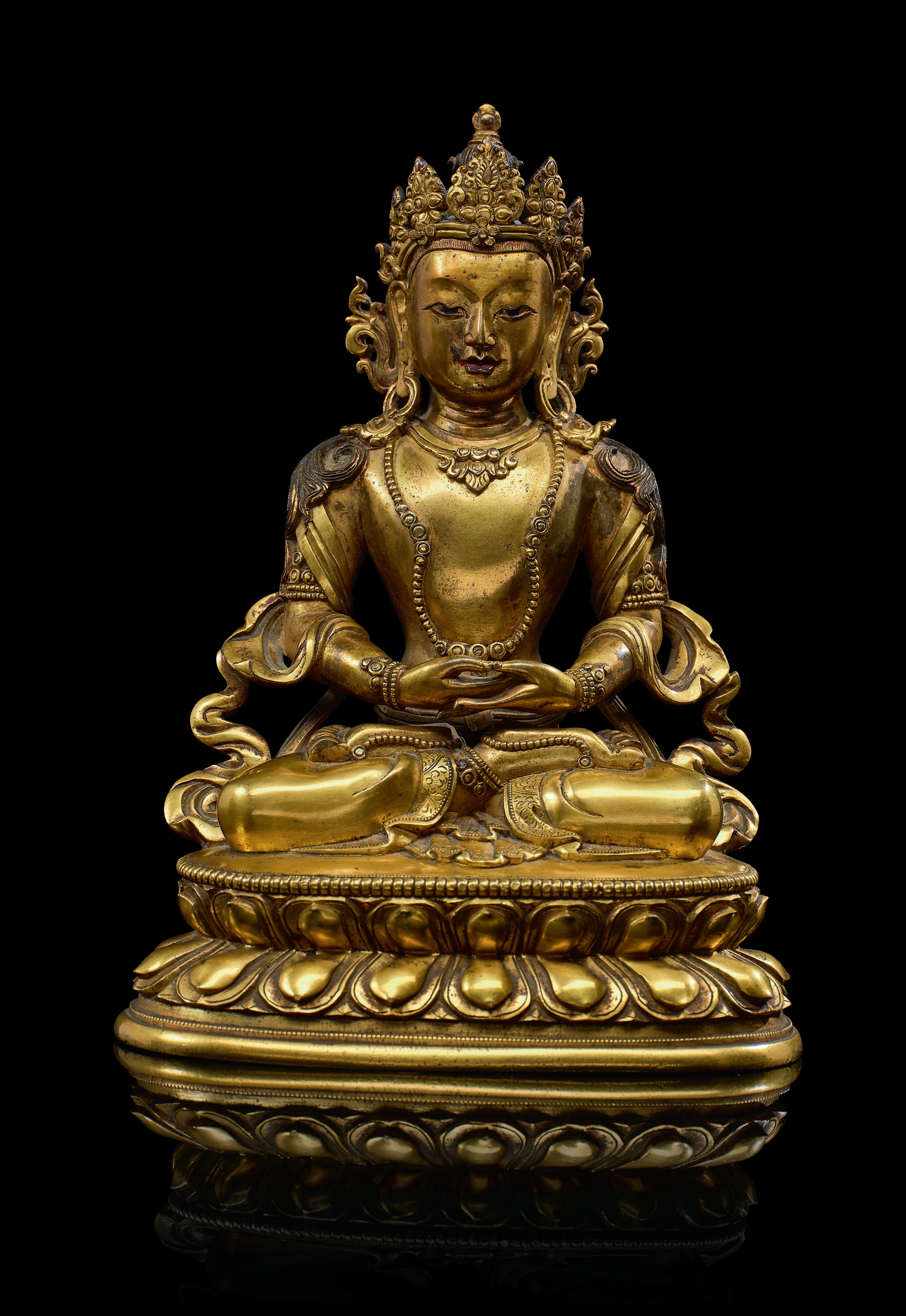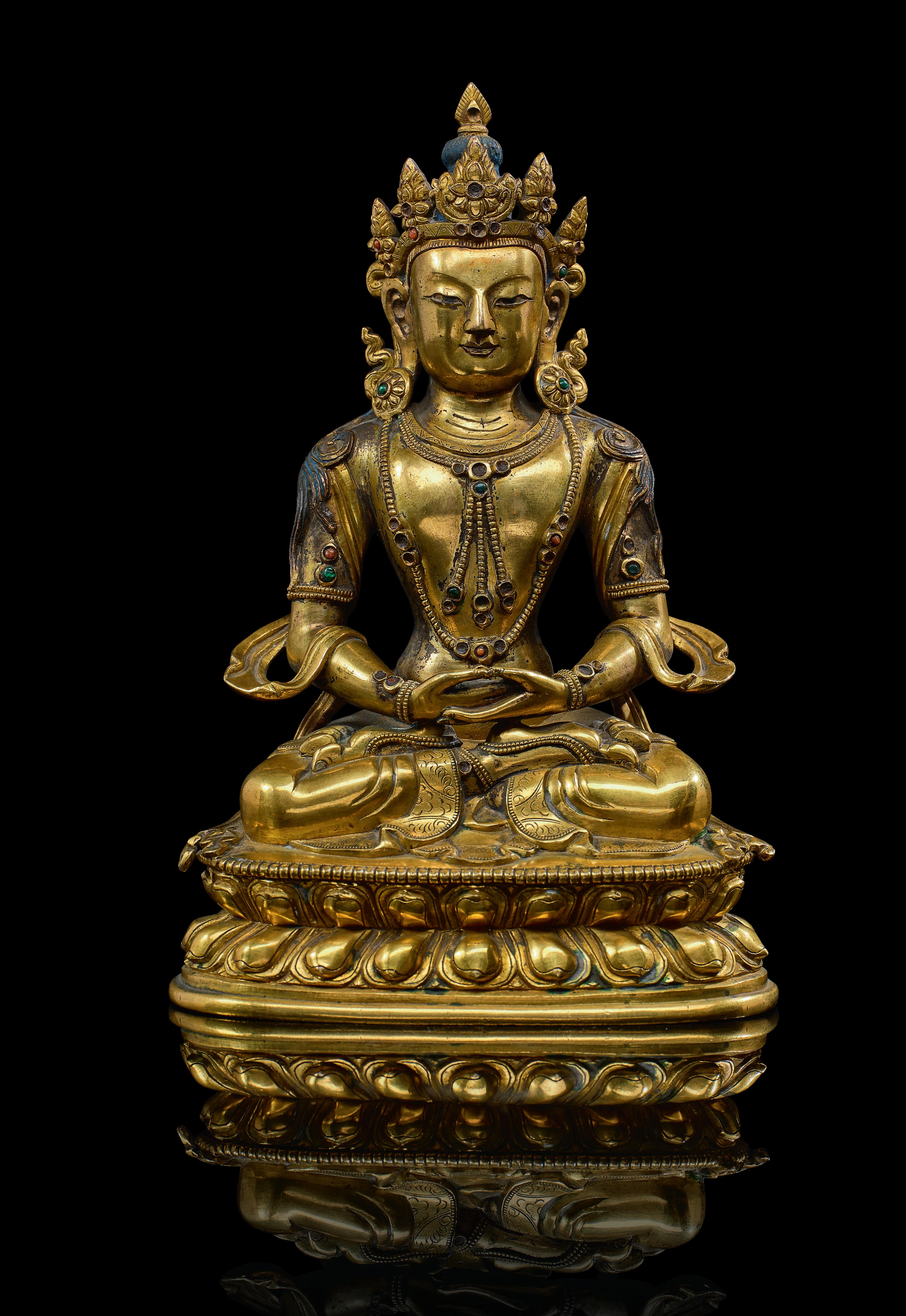 Statue d’Amitayus en bronze doré, le bouddha assis en vajrasana sur une double base lotiforme, les mains reposant en dhyanamudra sur les jambes, paré de nombreux bijoux et d’écharpes flottantes, la tête ceinte d’une couronne à cinq fleurons, le visage rond, la bouche petite, les yeux mi-clos. La base non scellée.