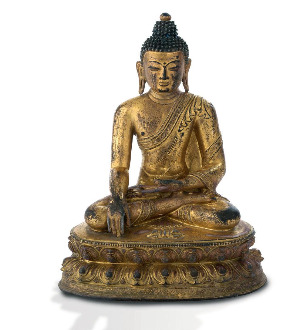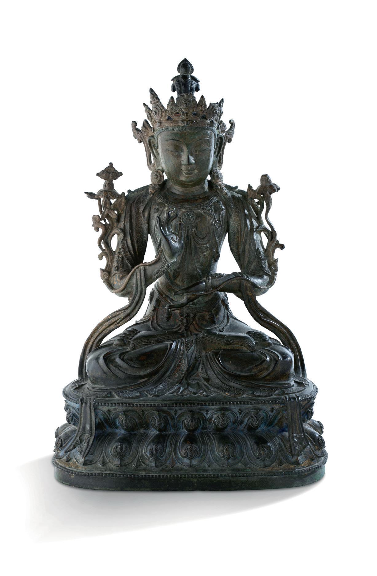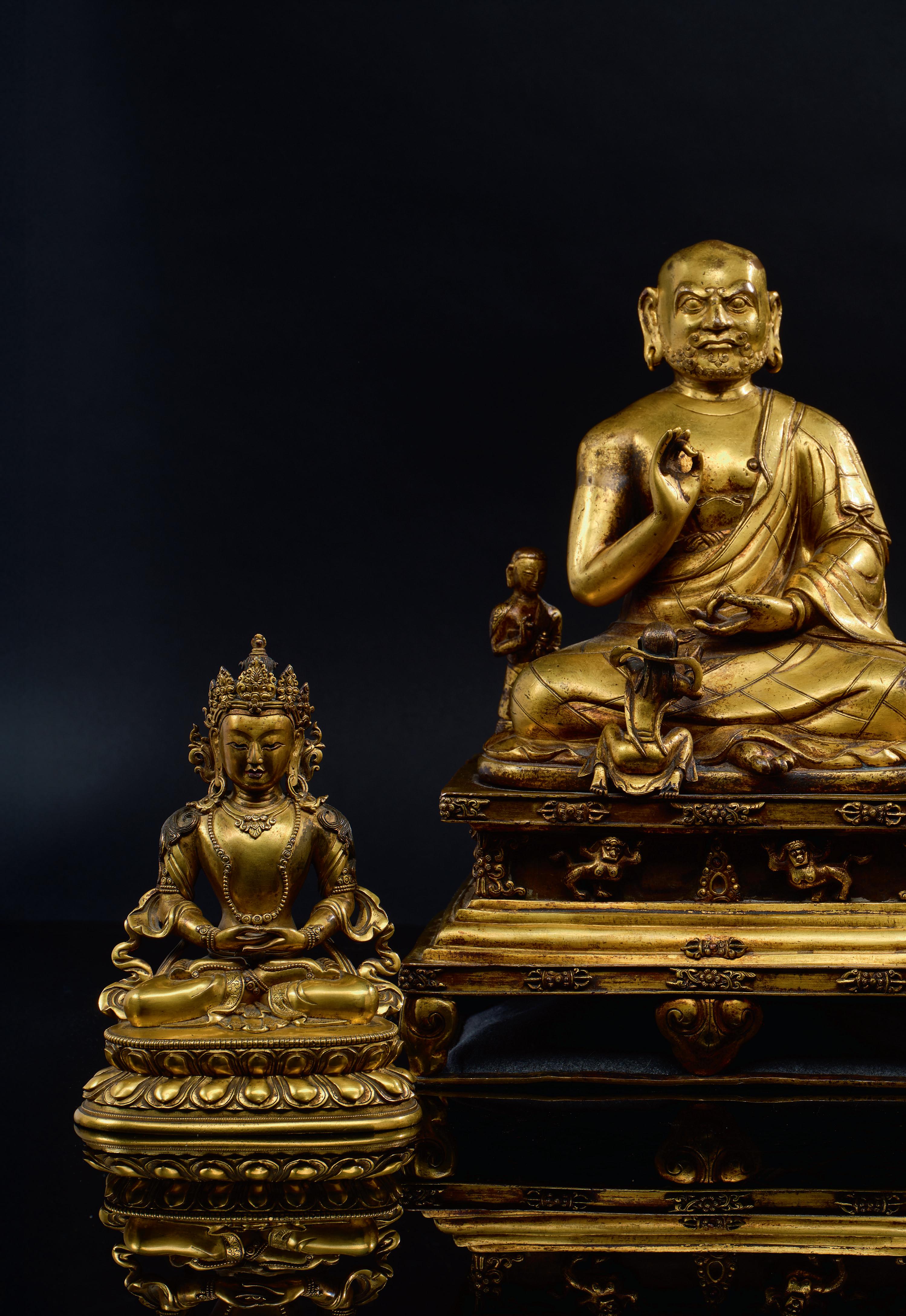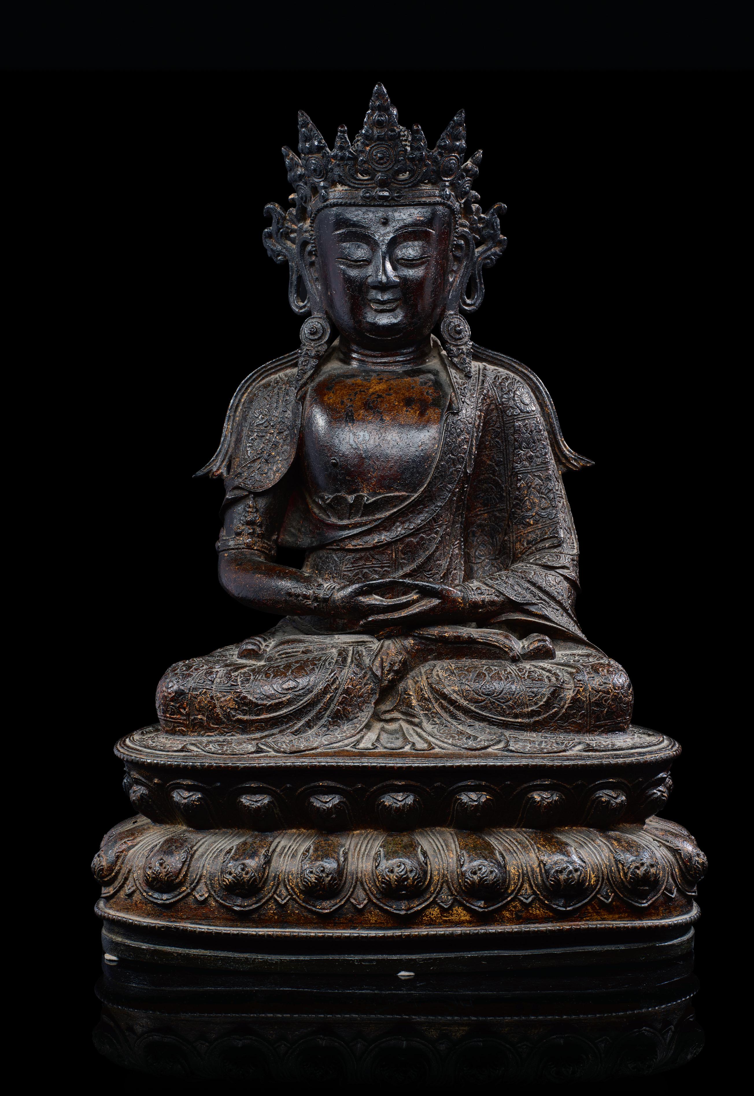 Statue d’Amitayus en bronze doré, le bouddha assis en vajrasana sur une double base lotiforme, les mains reposant en dhyanamudra sur les jambes, paré de nombreux bijoux et d’écharpes flottantes, la tête ceinte d’une couronne à cinq fleurons, le visage rond, la bouche petite, les yeux mi-clos. La base non scellée.