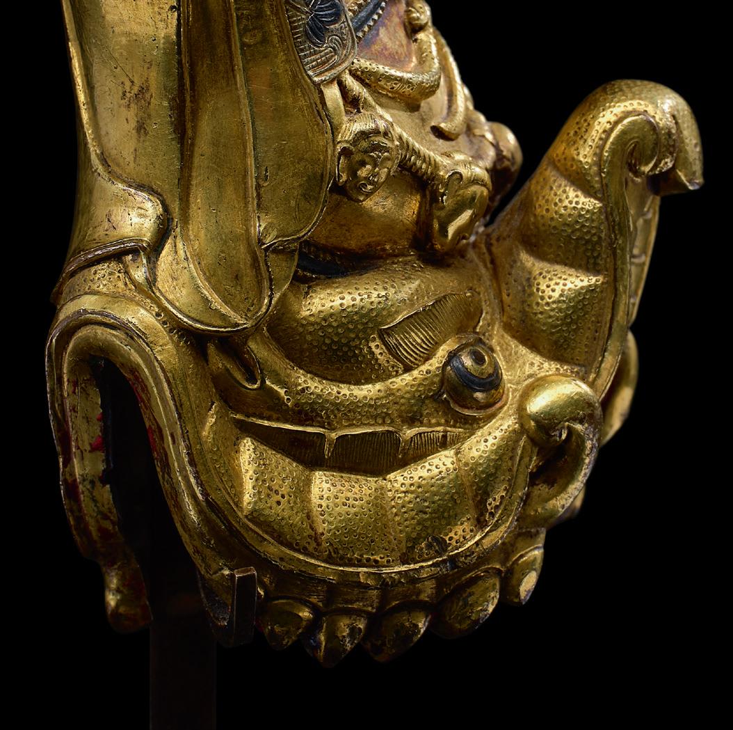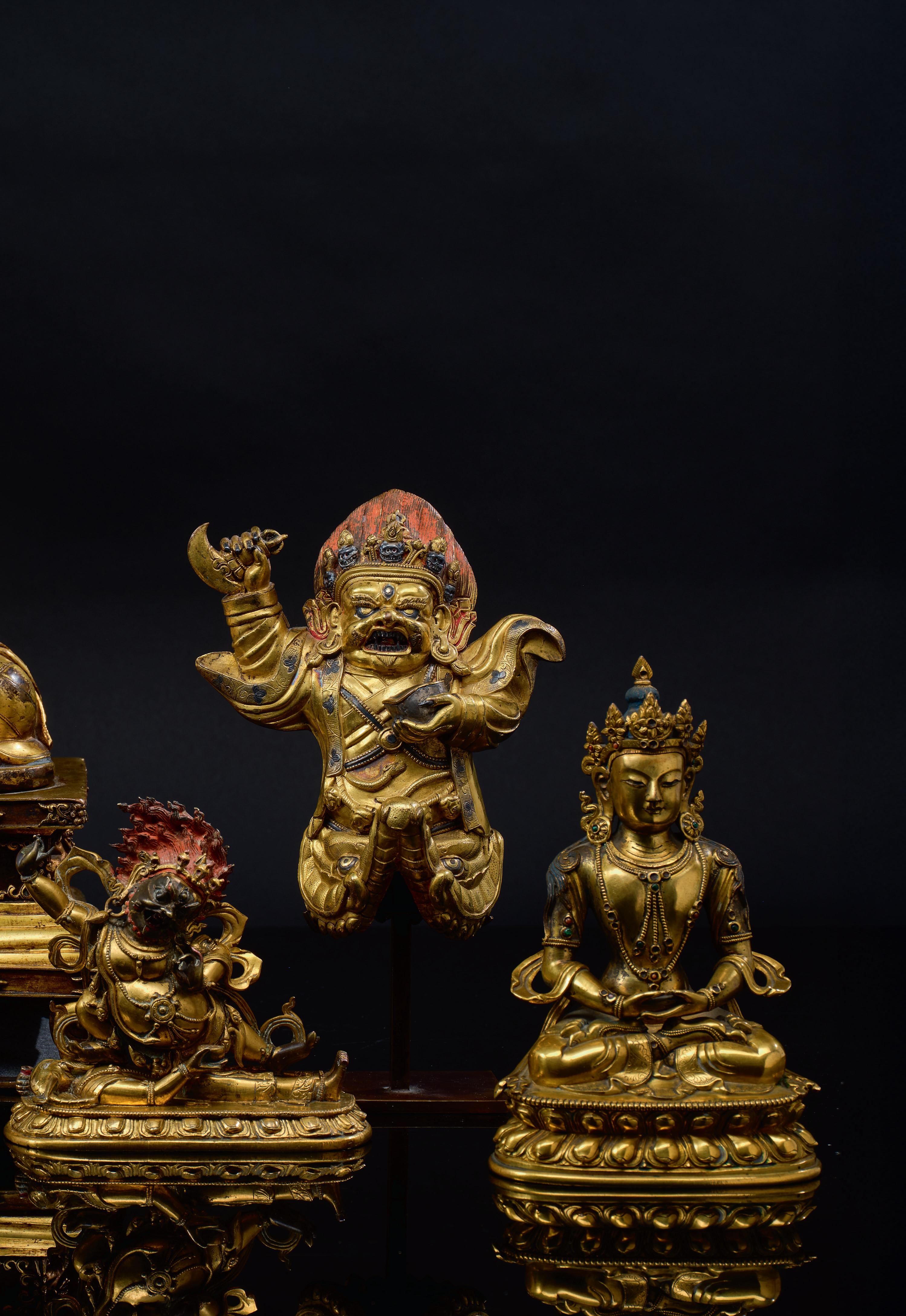 在这一背景下,镀金佛教神祇铜像广泛分布于宫廷私室佛堂、皇家寺庙 与诸如北京雍和宫等宗教中心。这些造像在风格上极为精致,常借鉴15 世纪的藏地典范,同时融合满洲皇室的审美趣味。铜像尺寸不一——从 用于私人供奉的小型神像到高达数米的巨大雕像——但始终遵循规范 化的图像体系与华丽的制作工艺。
