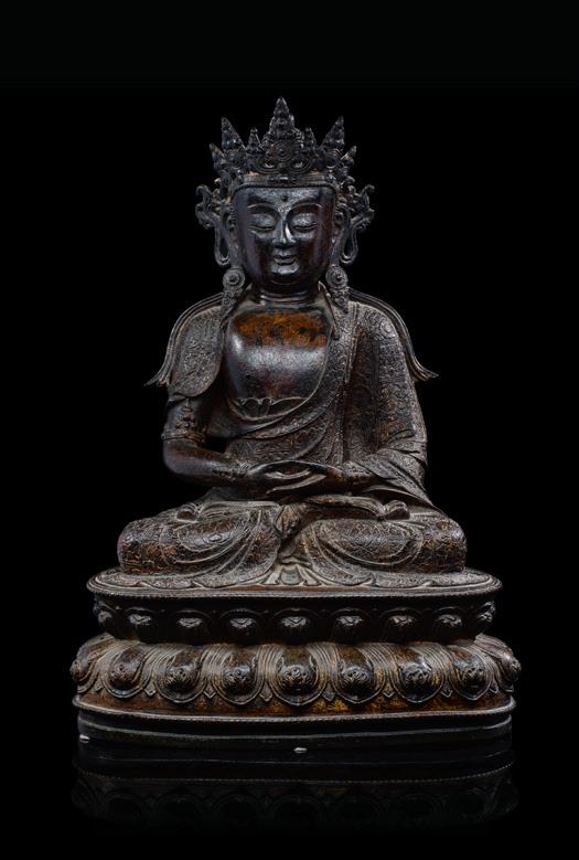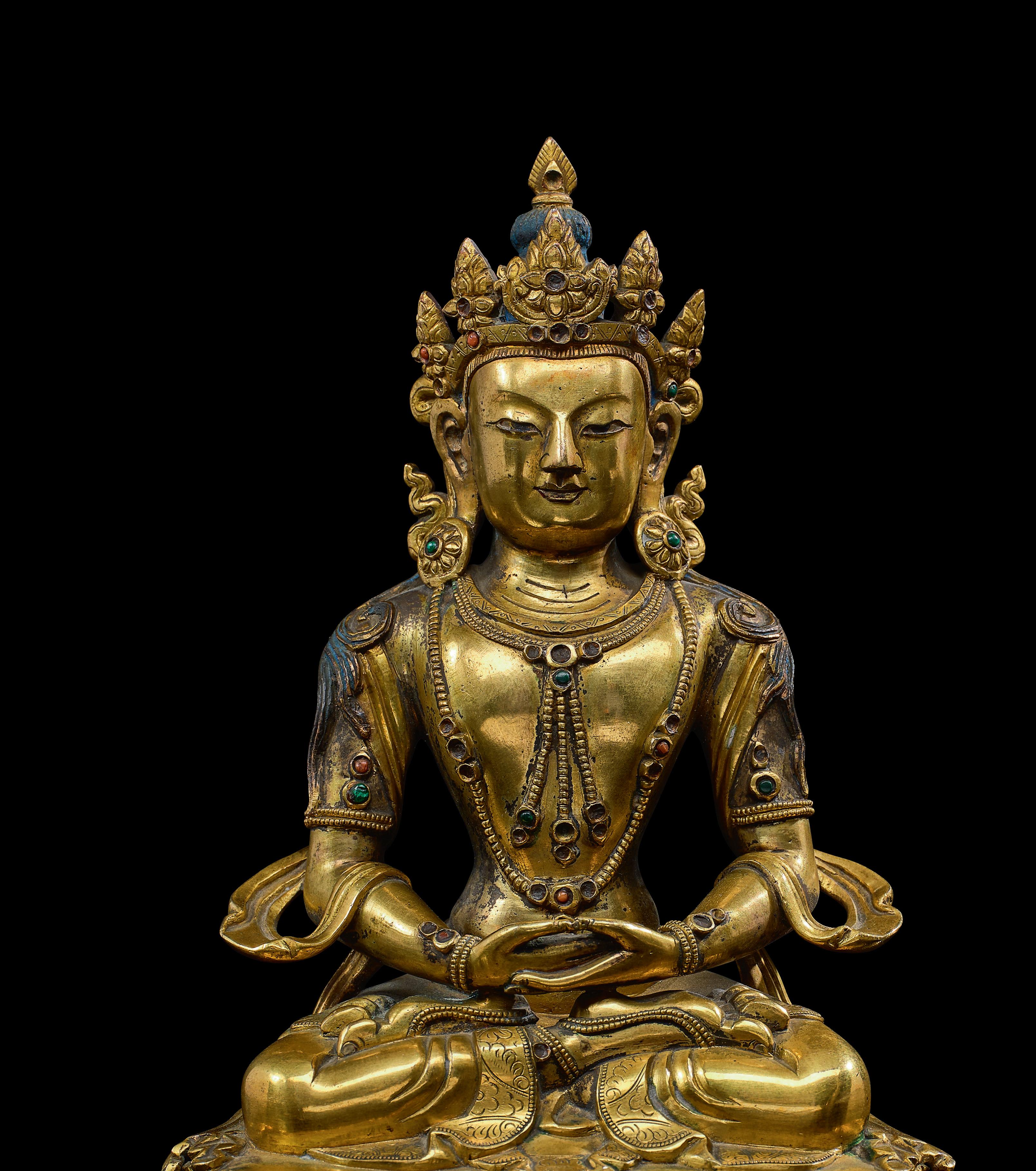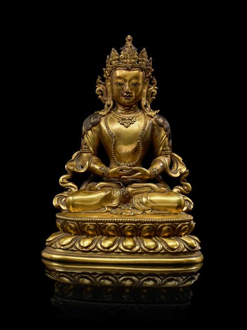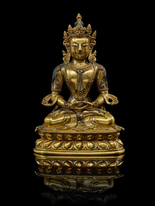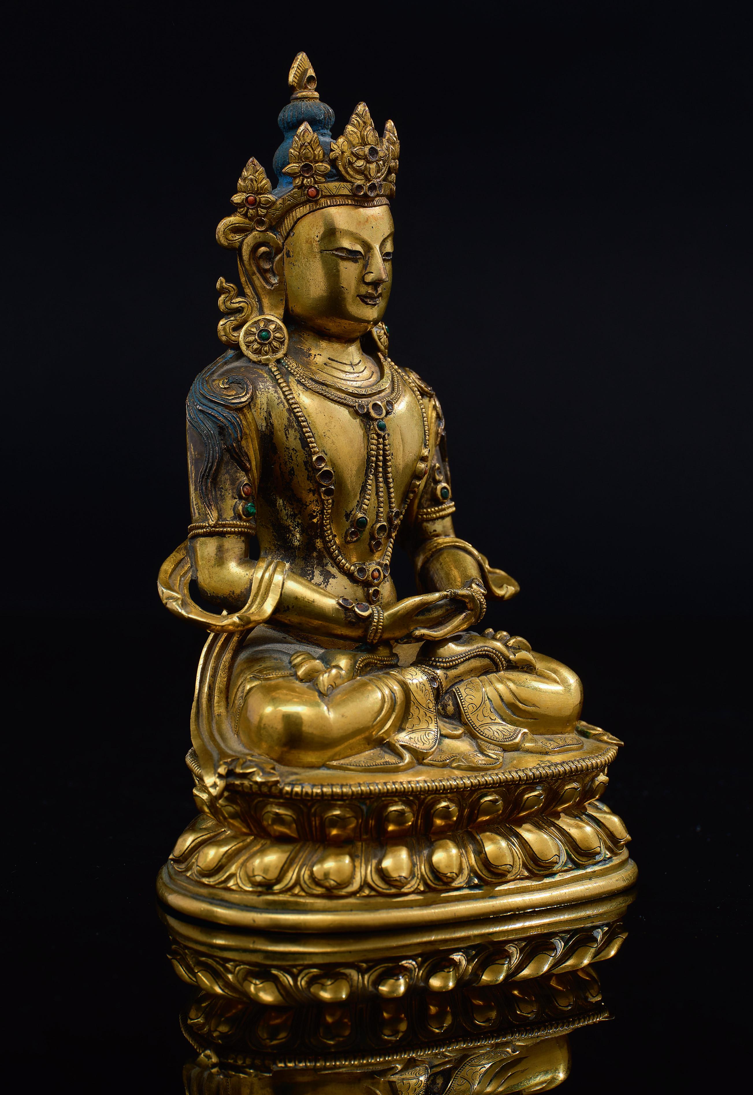 Statue d’Amitayus en bronze doré, le bouddha assis en vajrasana sur une double base lotiforme, les mains reposant en dhyanamudra sur les jambes, paré de nombreux bijoux et d’écharpes flottantes, la tête ceinte d’une couronne à cinq fleurons, le visage rond, la bouche petite, les yeux mi-clos étirés.