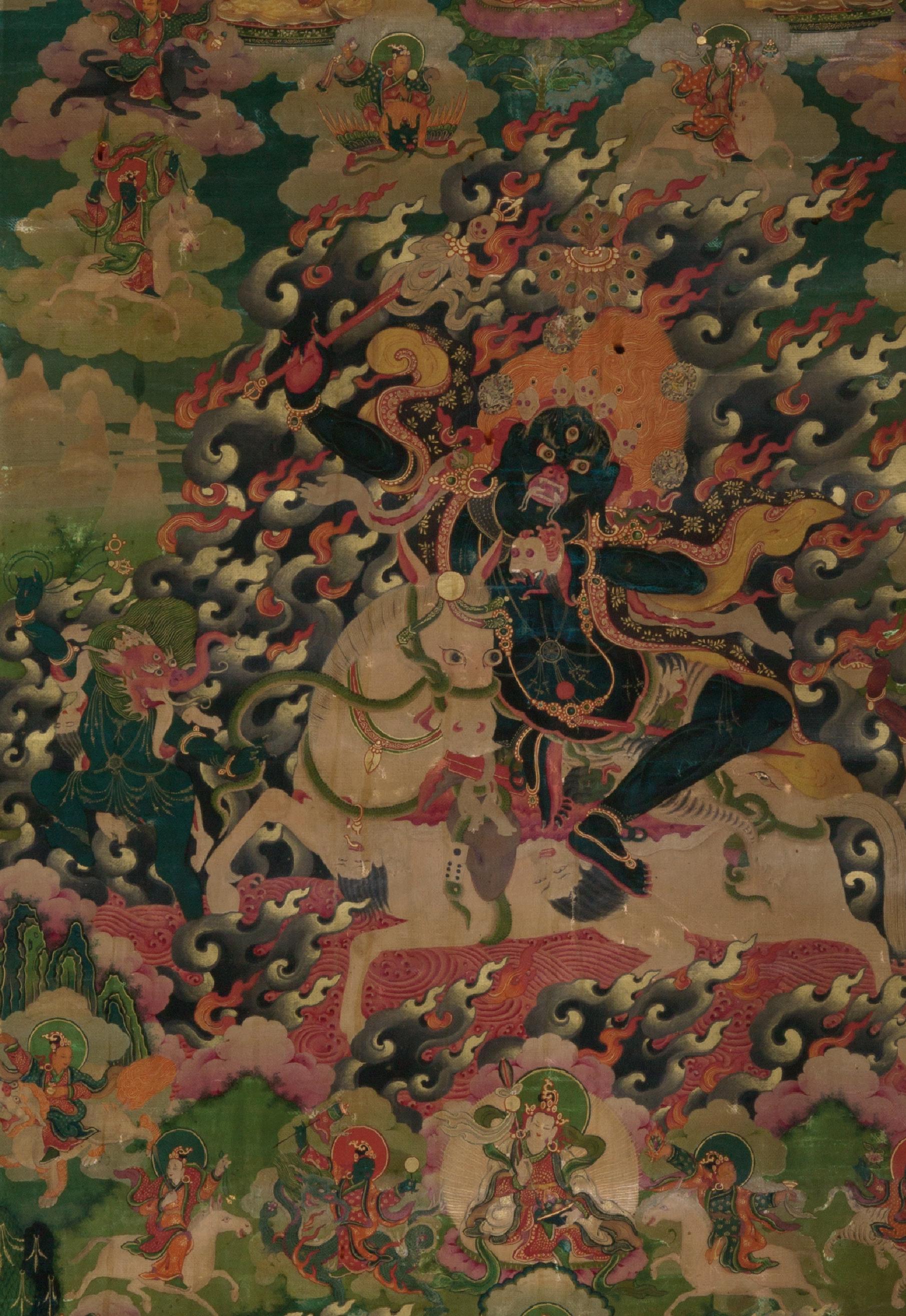 Vajrapani, literally “Vajra in [his] hand”, is one of the great bodhisattvas of Vajrayana Buddhism. He is an emanation of Akshobhya, one of the five Buddhas of meditation, and the bearer of the strength and power of the Buddhas. He can also be seen as the wrathful form of the primordial Buddha Vajradhara or Vajrasattva, and is then known as Guhyapati, the “Lord of Secrets”. He is regarded as the principal recipient, holder and protector of all the texts, literature and tantric teachings received from Shakyamuni Buddha.