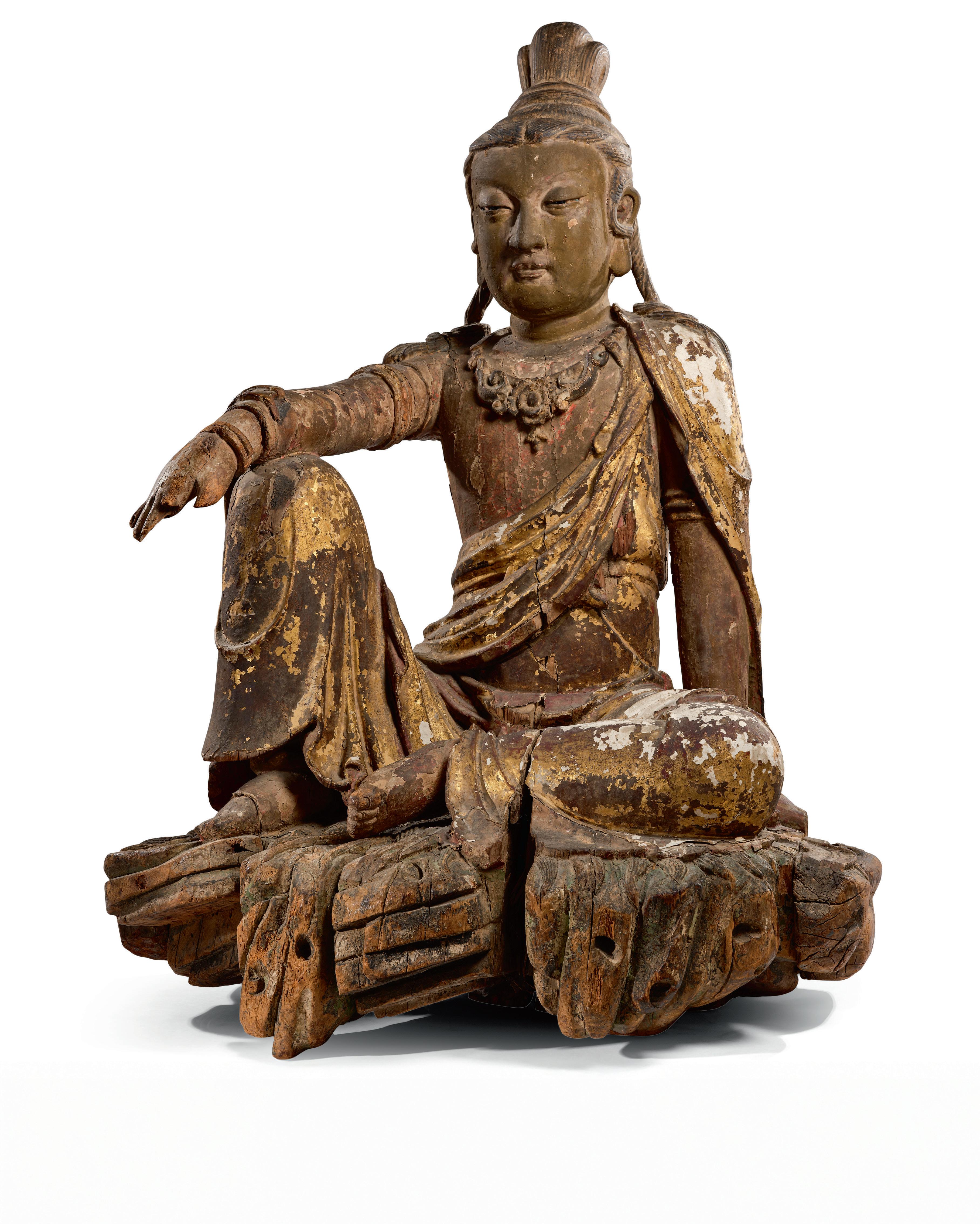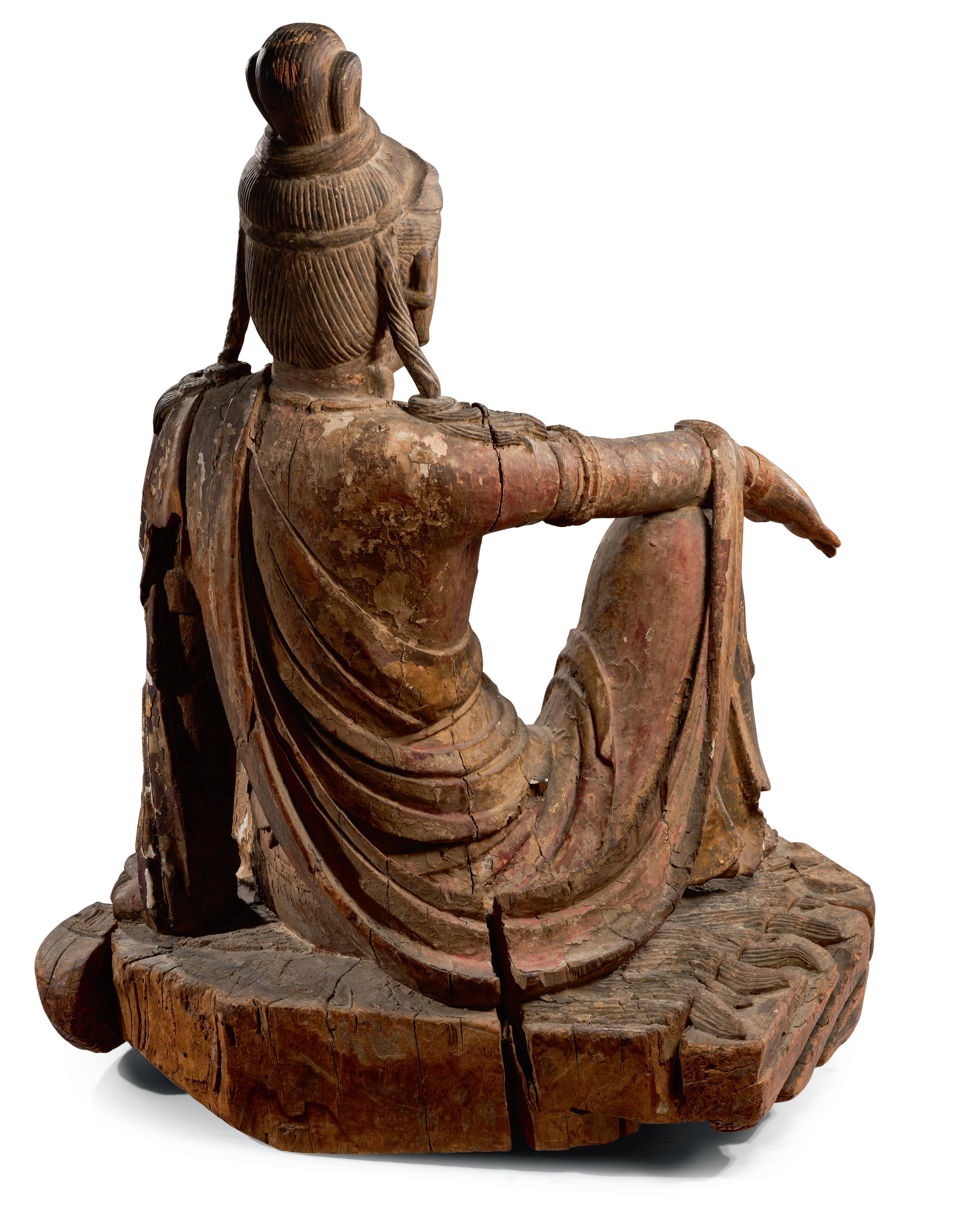 La fin du mécénat impérial et la disparition des grands complexes étatique marque aussi un changement dans les techniques artistiques, avec l’abandon de la pierre au profit du bois, matériau moins onéreux, plus facile d’accès et plus aisé à travailler. On voit notamment fleurir une grande statuaire en bois, emblématique de la période, figurant le bodhisattva Guanyin, dans un subtil équilibre entre réalisme et idéalisation, traduisant à la fois la présence divine et une profonde humanité. Ces statues en bois illustrent parfaitement la manière dont la sculpture bouddhique se fait porteuse d’une spiritualité apaisée, privilégiant l’intériorité et la sobriété.