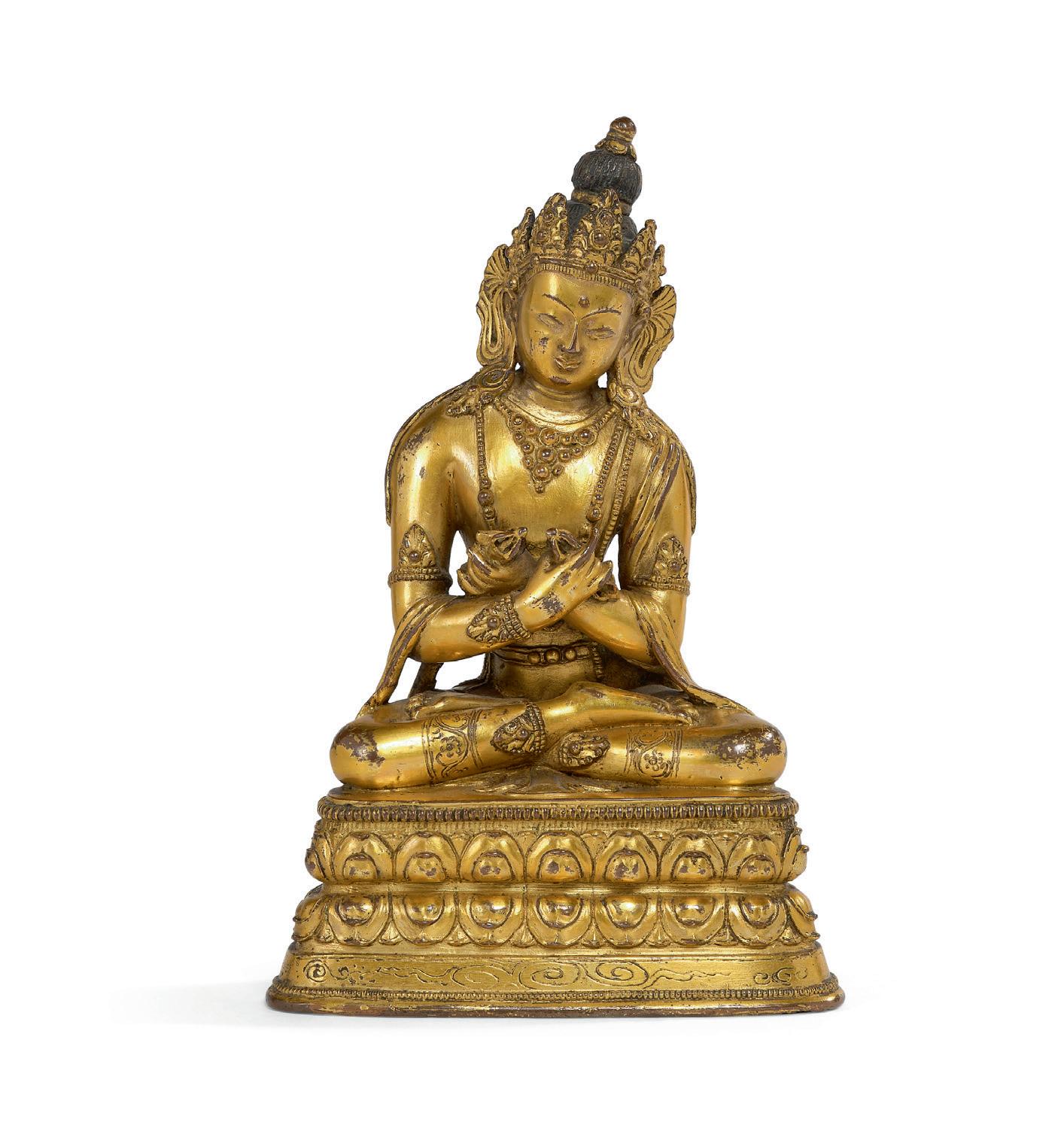 A gilt-bronze figure of Amitayus, seated in vajrasana on a double-lotus base, his hands are resting in dhyanamudra on the legs, he is adorned with numerous jewels and floating scarves, the head crowned with an elaborate crown, with a round face, small mouth and half-closed eyes. The base is sealed and engraved with a double vajra.