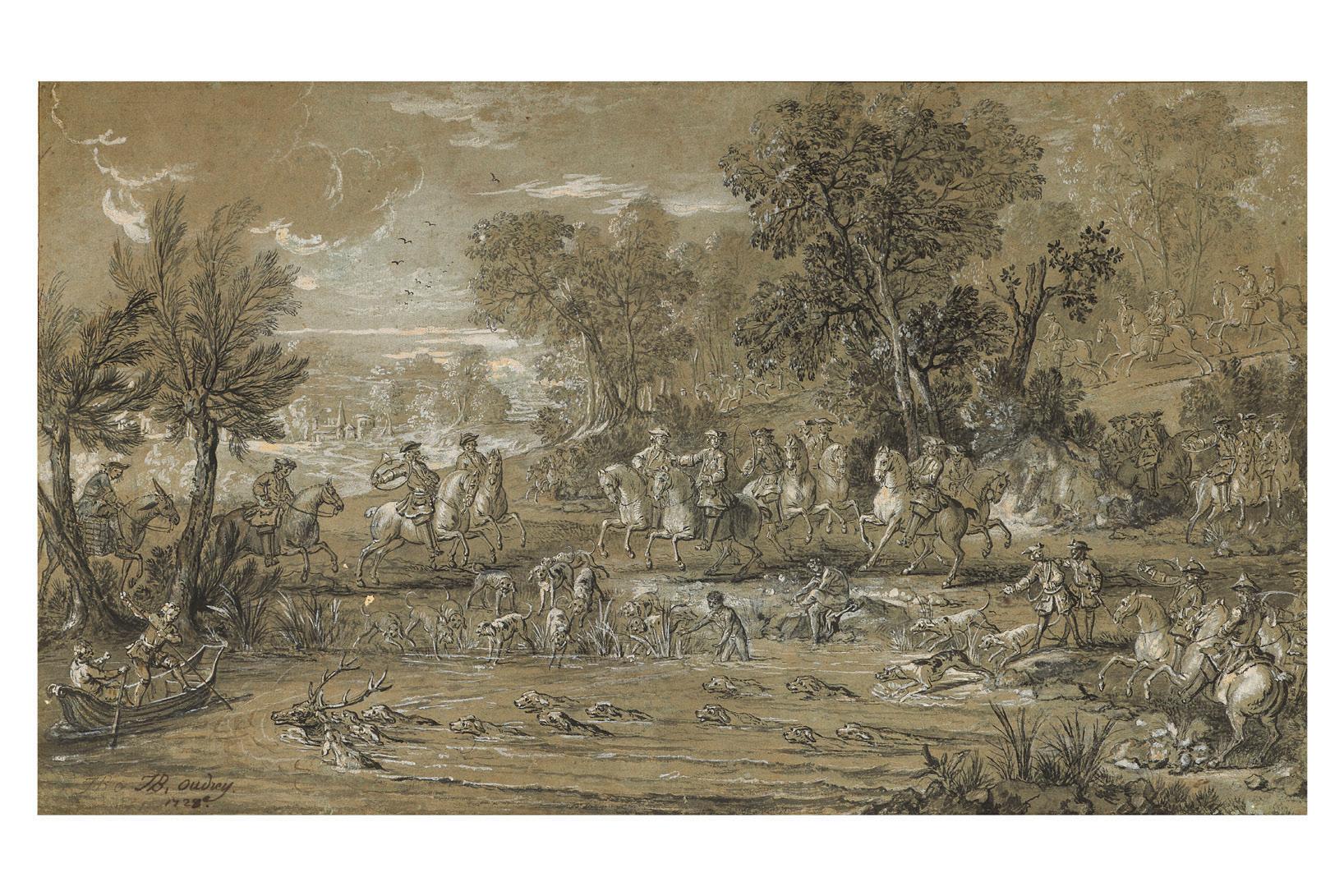Jean-Baptiste Oudry (1685 - 1755) Louis XV chassant le cerf dans la forêt de Saint-Germain, le bat-l’eau, 1728 En vente le 4 décembre