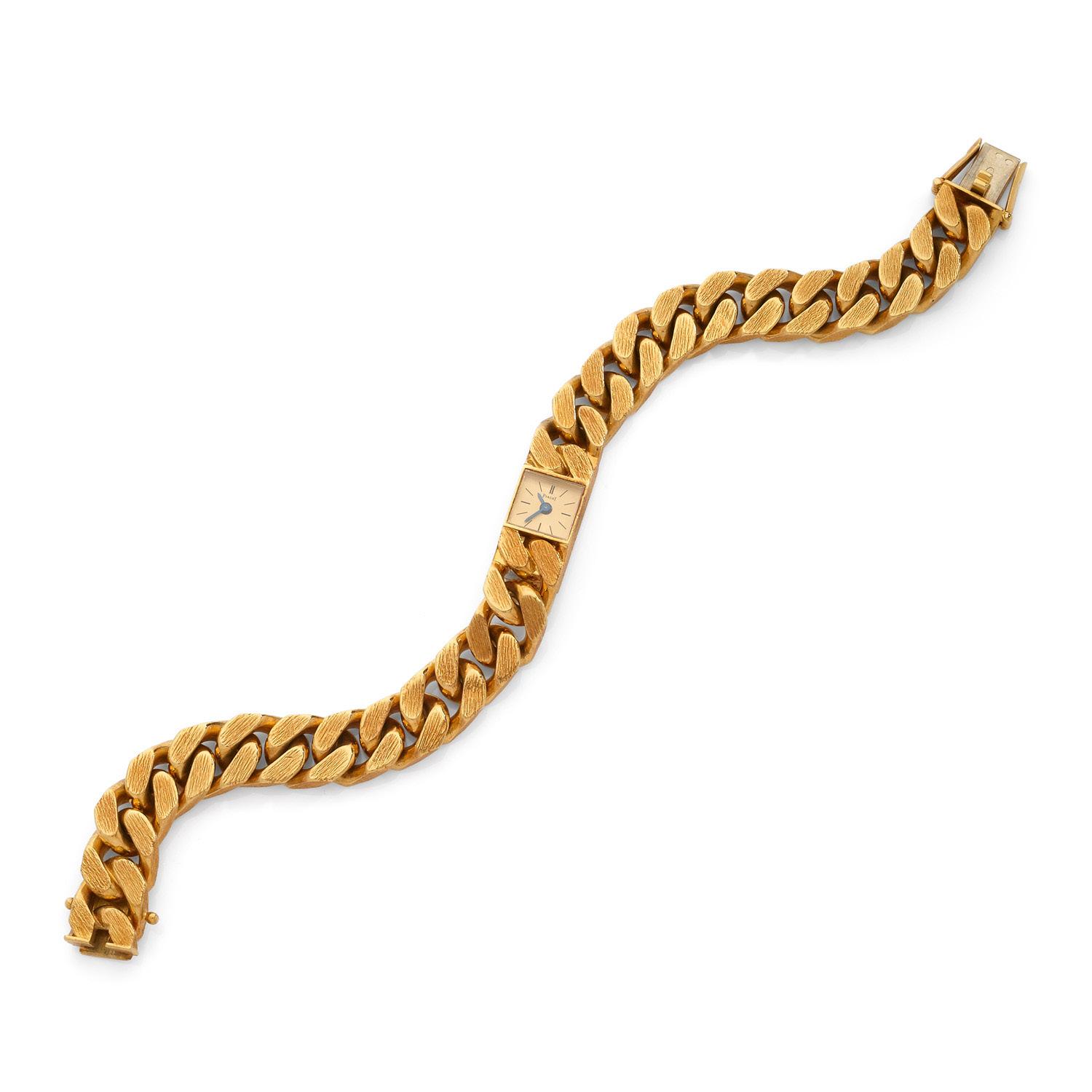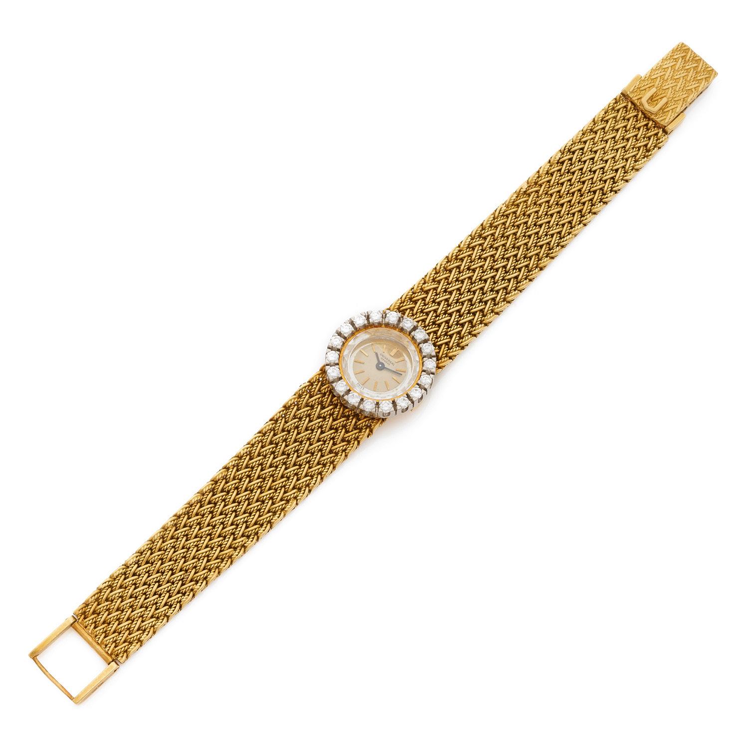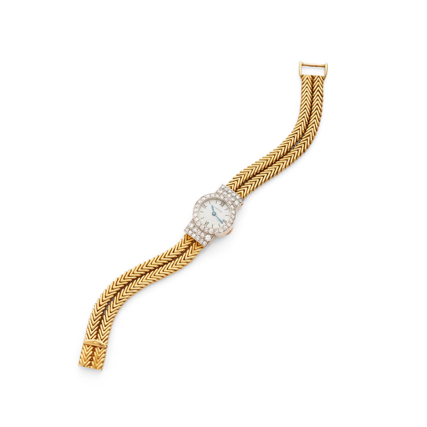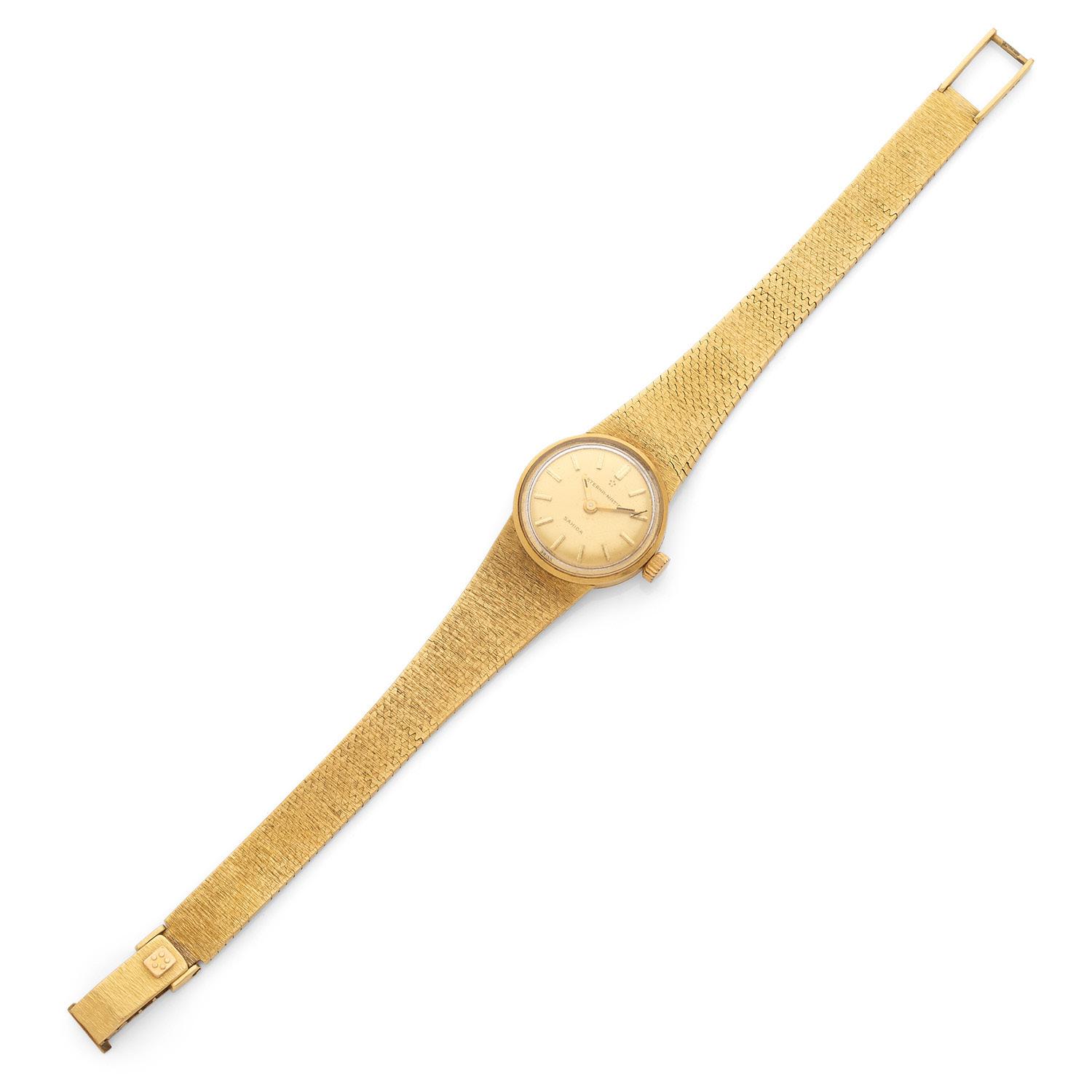 Boîtier : rond, fermeture par le rehaut, signé Cadran : blanc avec chiffres romains, aiguilles feuilles en acier noirci, petite trotteuse, signé Mouvement : mécanique à remontage manuel, décoration côtes de Genève, calibre 215, 18 rubis, ajusté 5 positions, signé Boucle : ardillon en or jaune 18k (750)