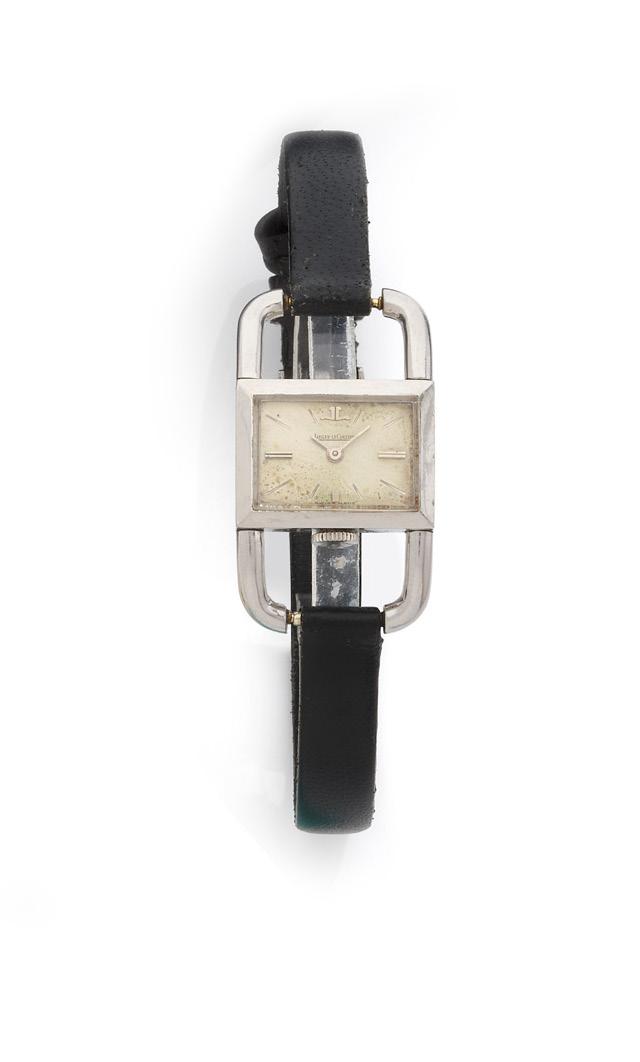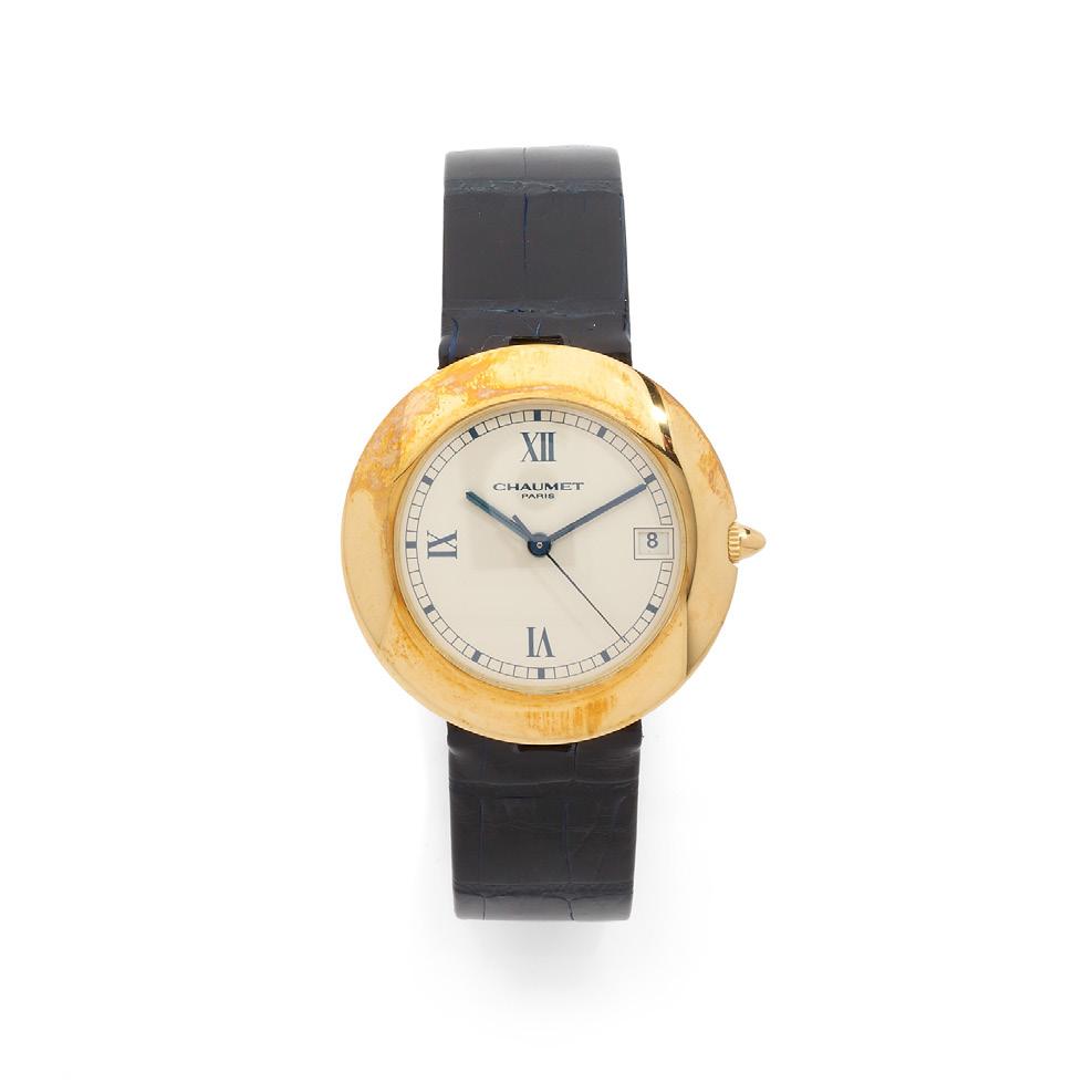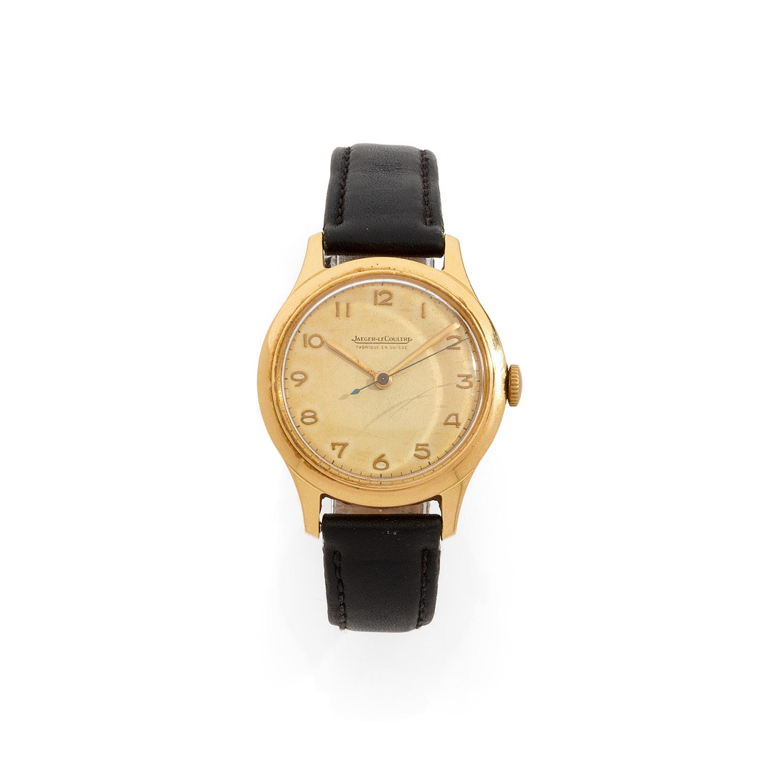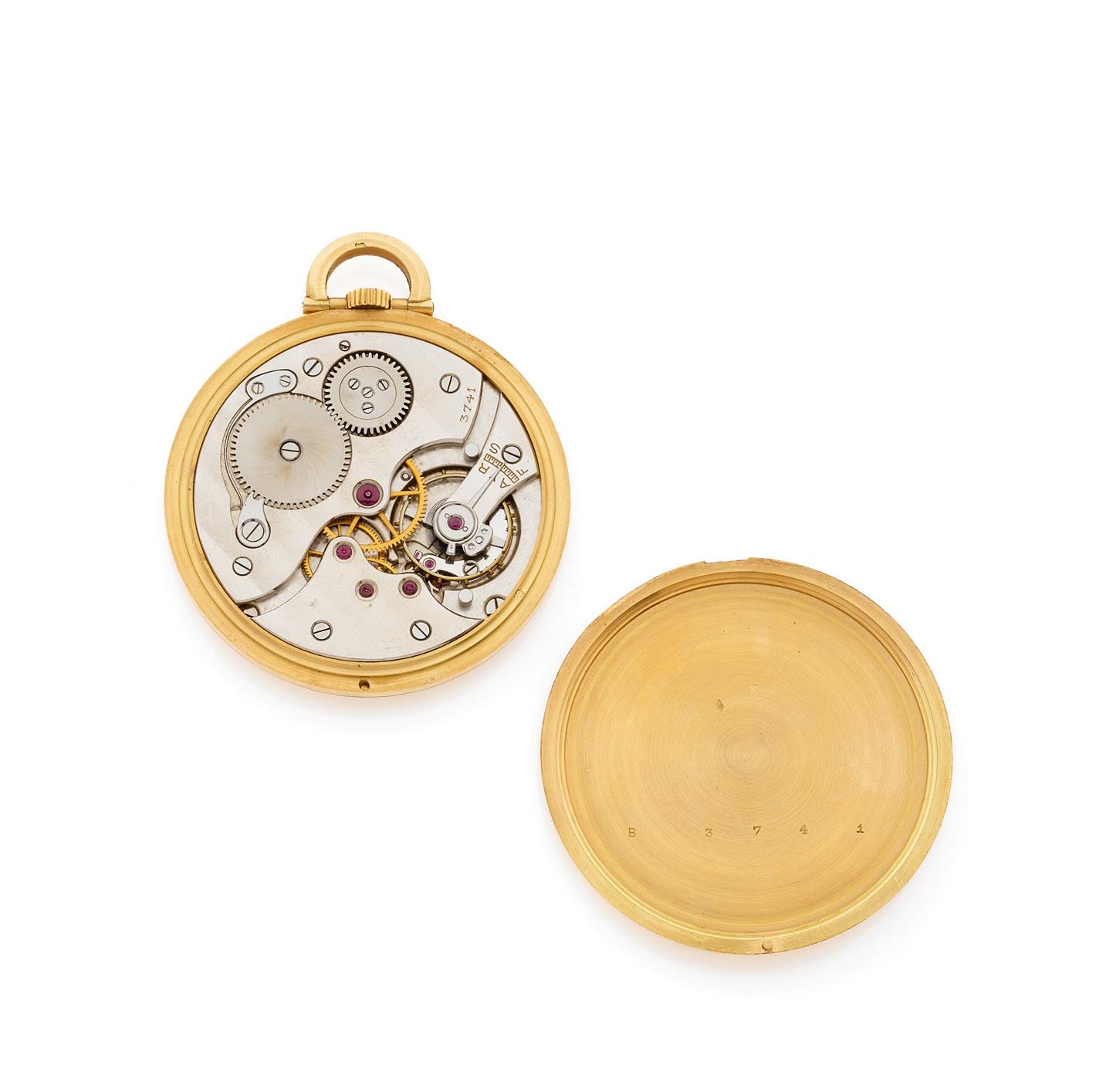 Boîtier : rond, fermeture par le rehaut, signé Cadran : blanc avec chiffres romains, aiguilles feuilles en acier noirci, petite trotteuse, signé Mouvement : mécanique à remontage manuel, décoration côtes de Genève, calibre 215, 18 rubis, ajusté 5 positions, signé Boucle : ardillon en or jaune 18k (750)