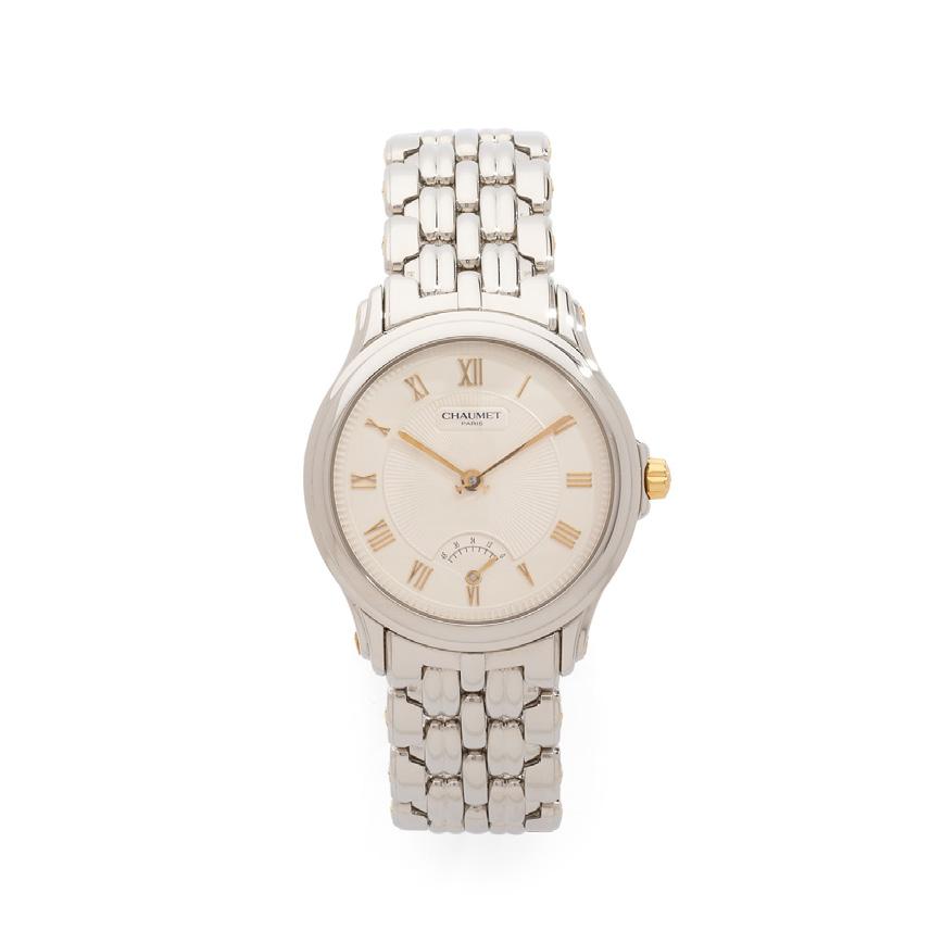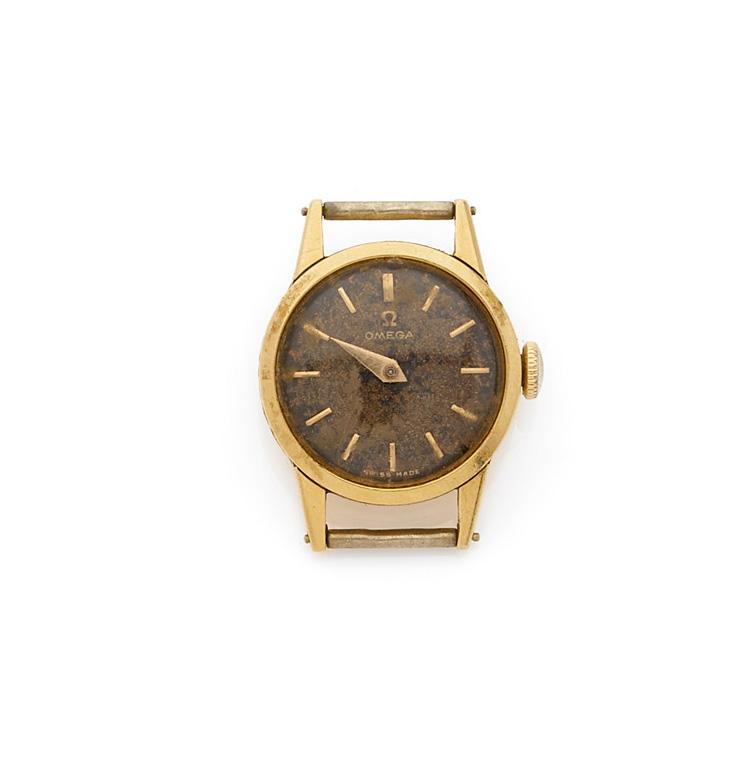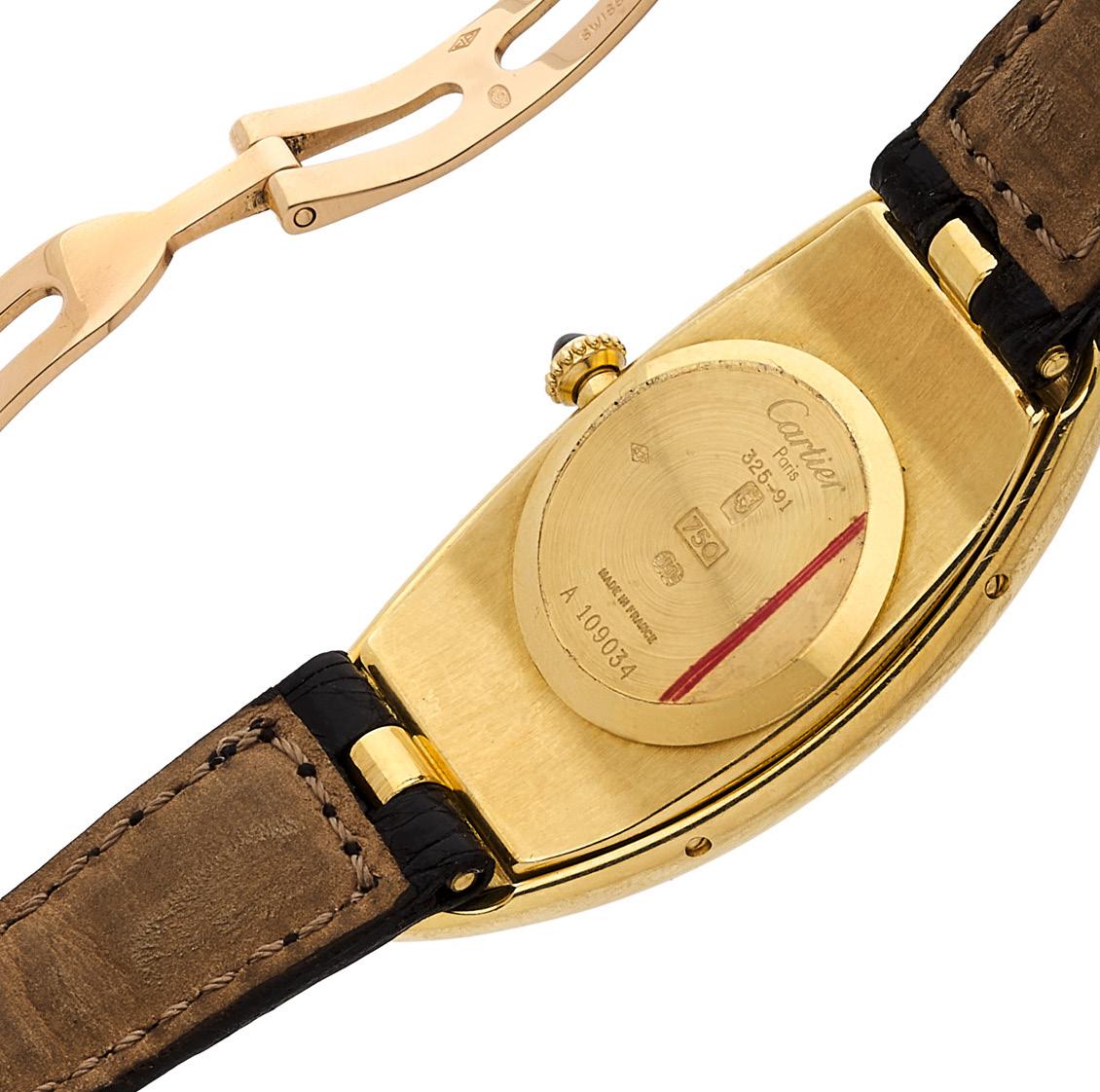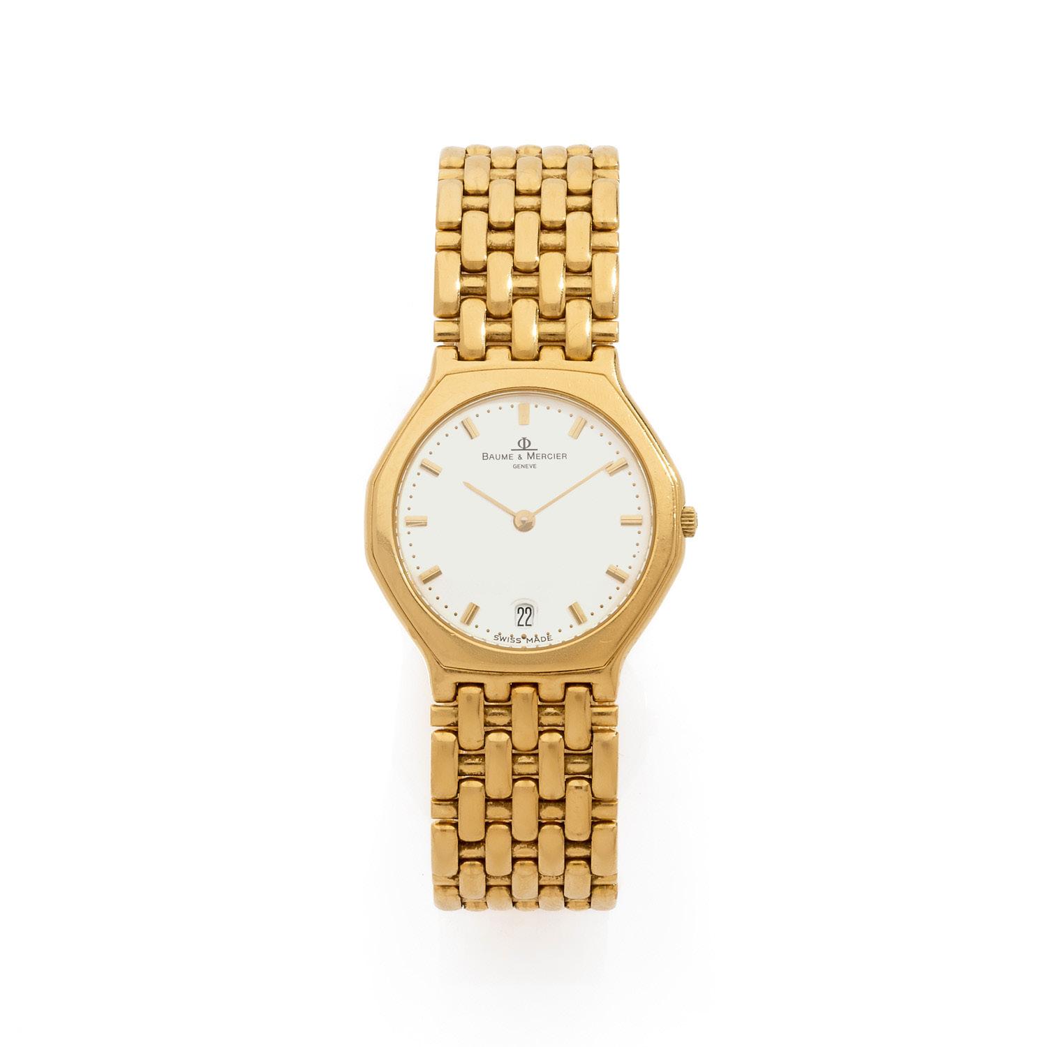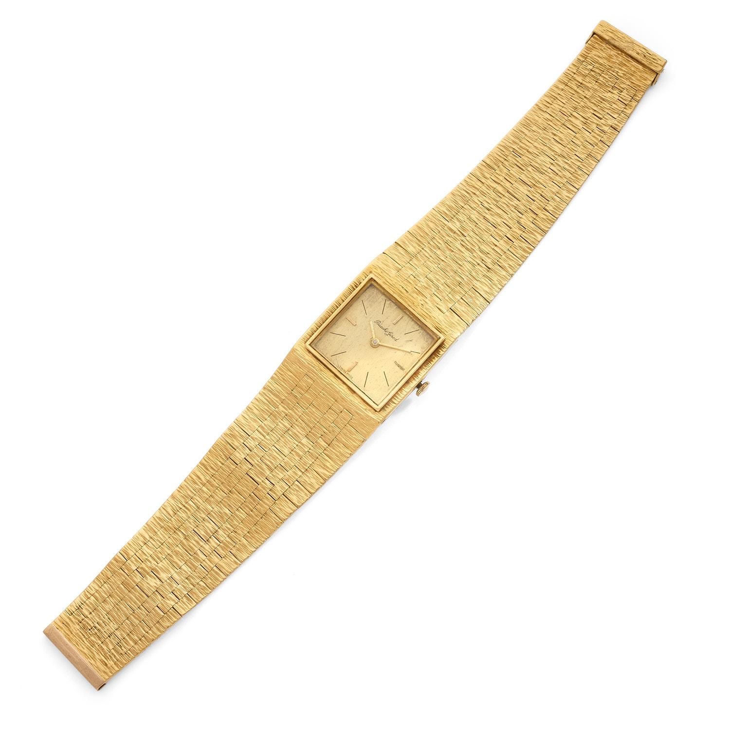 Boîtier : rond, fermeture par le rehaut, signé Cadran : blanc avec chiffres romains, aiguilles feuilles en acier noirci, petite trotteuse, signé Mouvement : mécanique à remontage manuel, décoration côtes de Genève, calibre 215, 18 rubis, ajusté 5 positions, signé Boucle : ardillon en or jaune 18k (750)