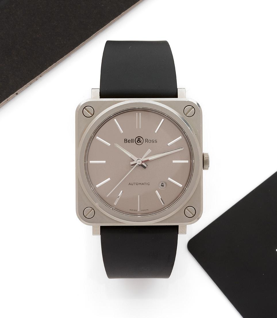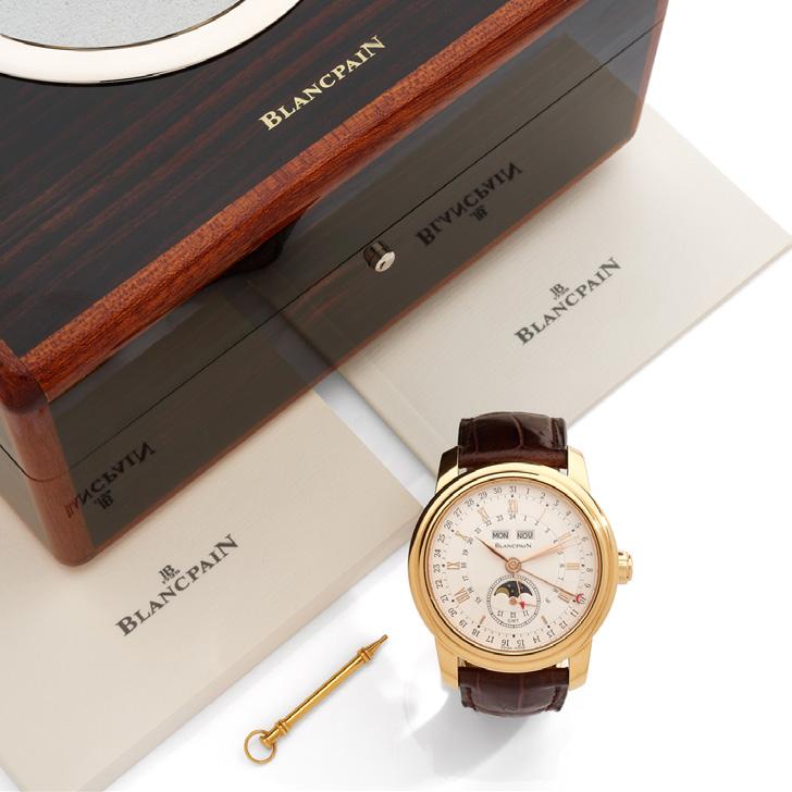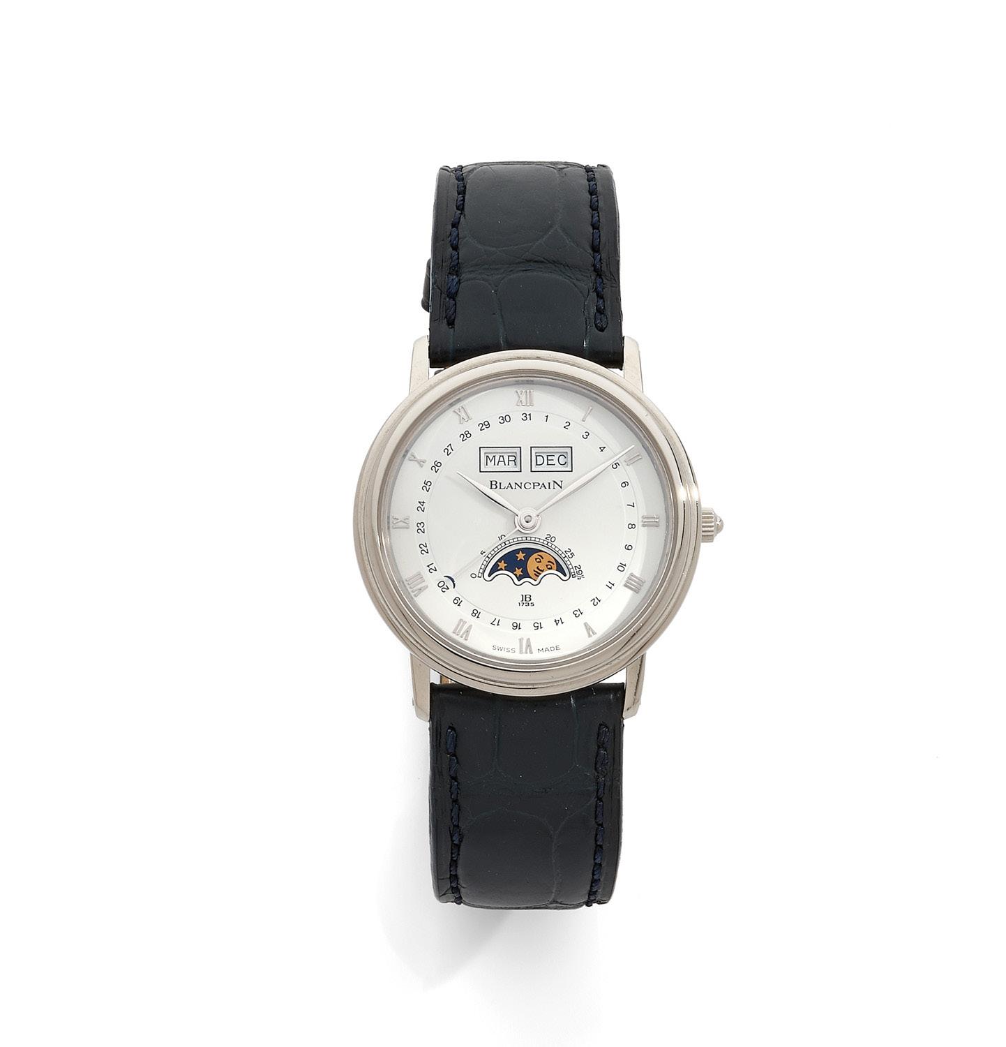 Cadran : blanc, index appliqués, date et logo « JB 1735 » peinte sur le cadran, aiguilles feuilles grises, aiguille chemin de fer pour la date, guichets jour de la semaine et mois à 12h, phases et âges de la lune à 6h, signé
