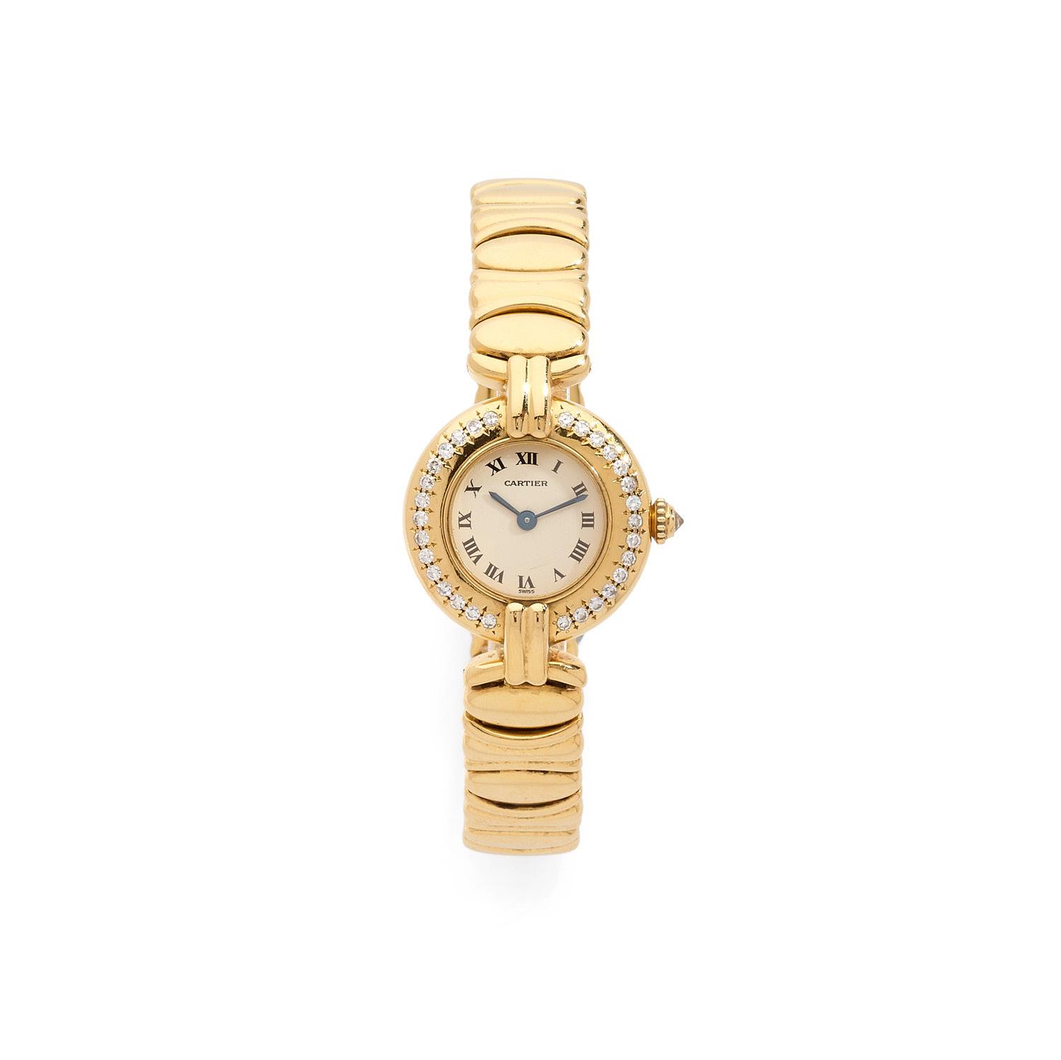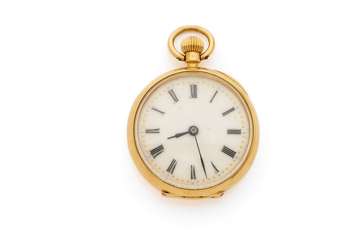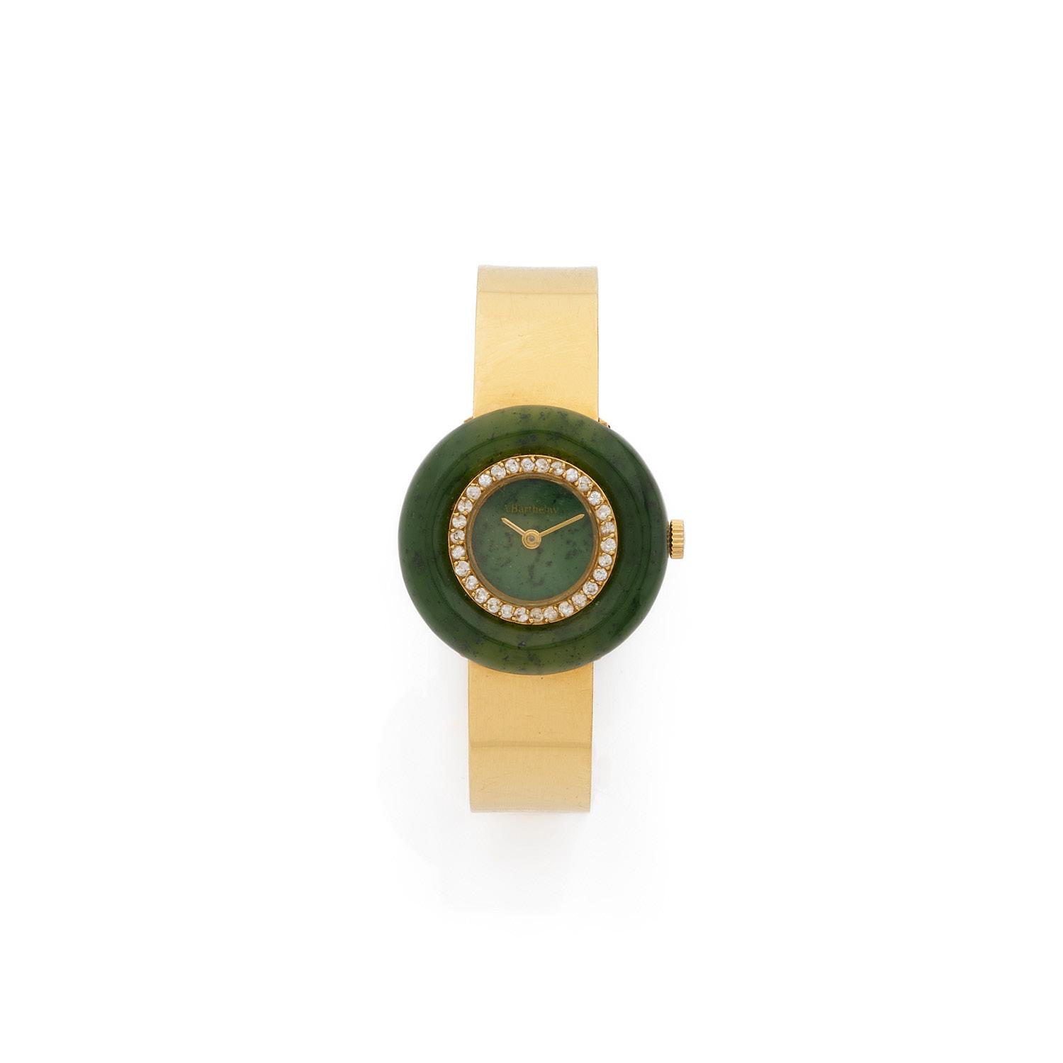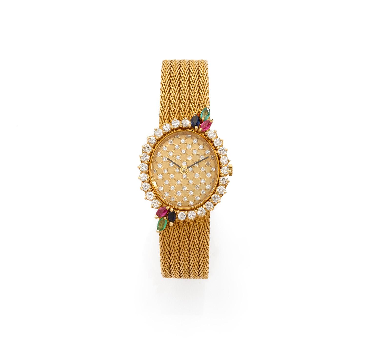 Boîtier : rond, carrure cannelée, couronne sertie d’une pierre noire, fond clipsé, signé